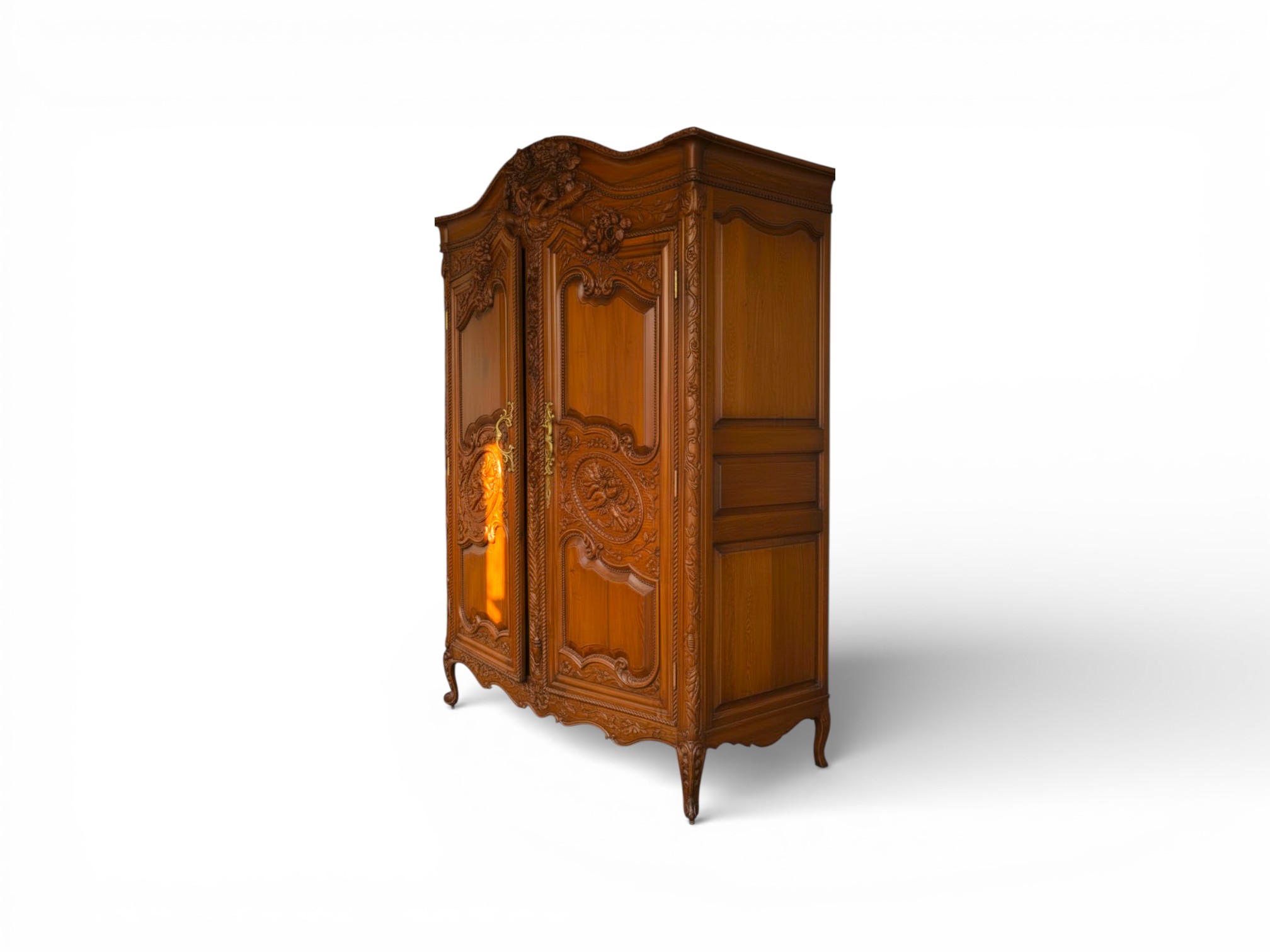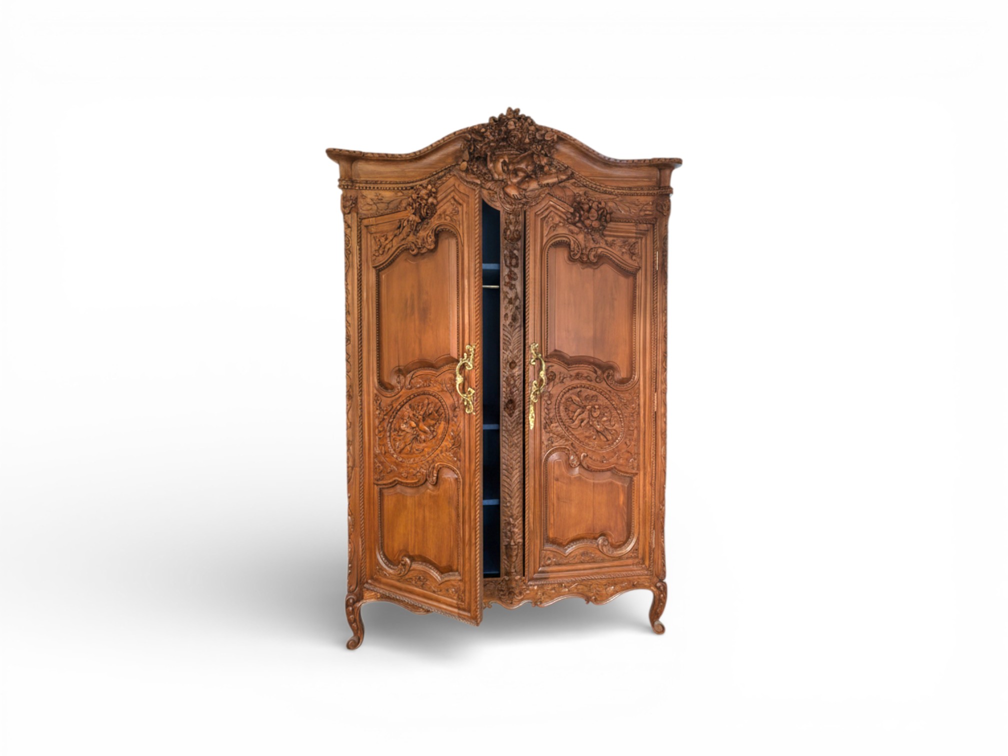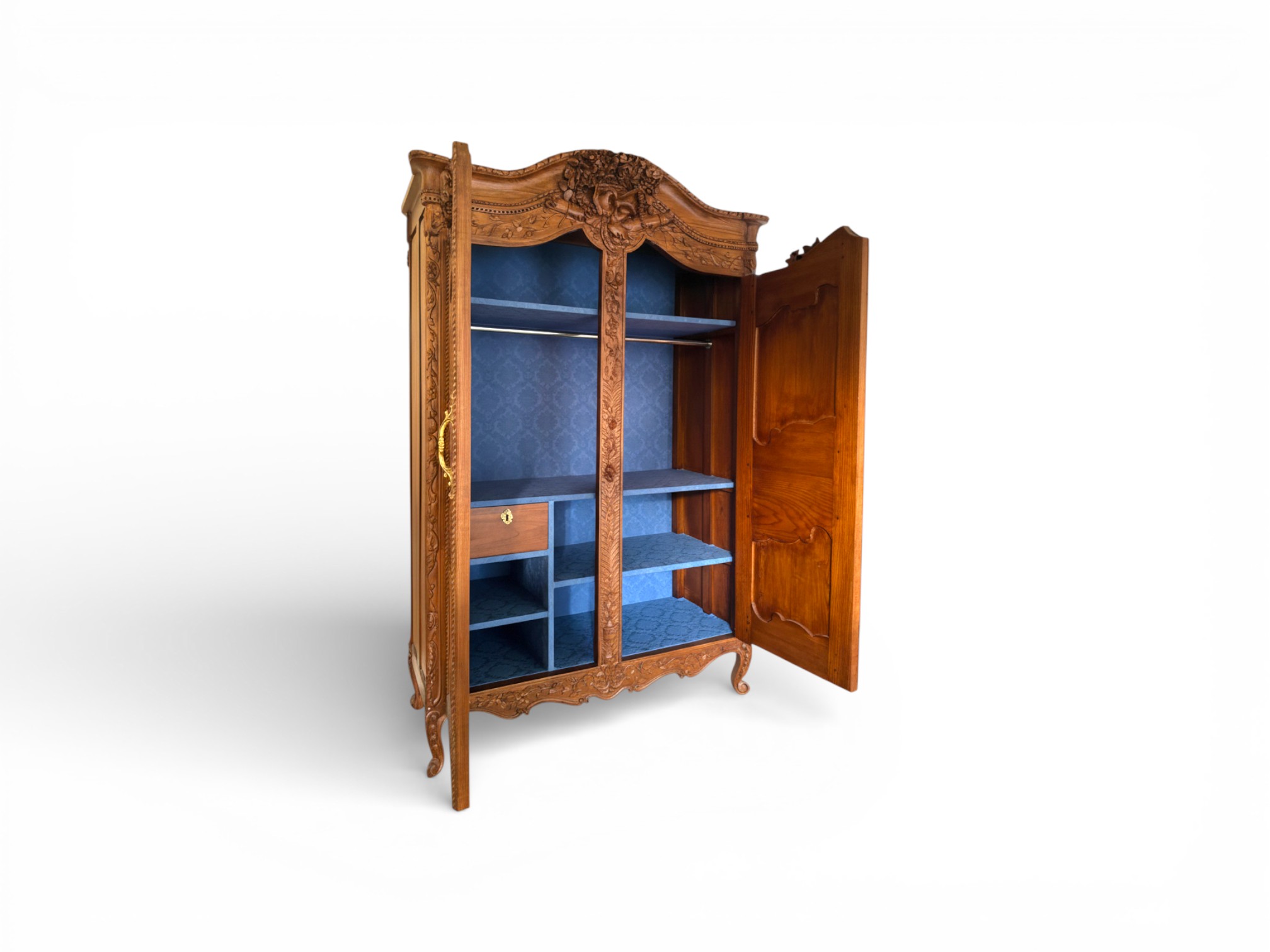 Crafted from solid wood, the LOUIS XV Heritage Wardrobe combines decorative artistry with everyday practicality. Furthermore, the double-door construction opens to a spacious interior suited for organised clothing storage, while the finely finished surfaces highlight the quality of craftsmanship. As a result, this wardrobe offers durability, sophistication, and functional elegance in equal measure.