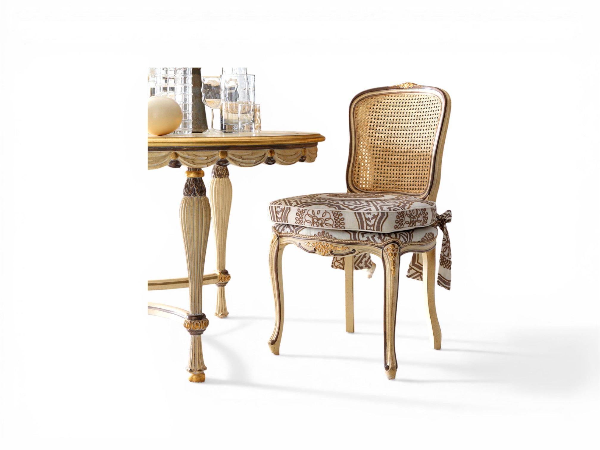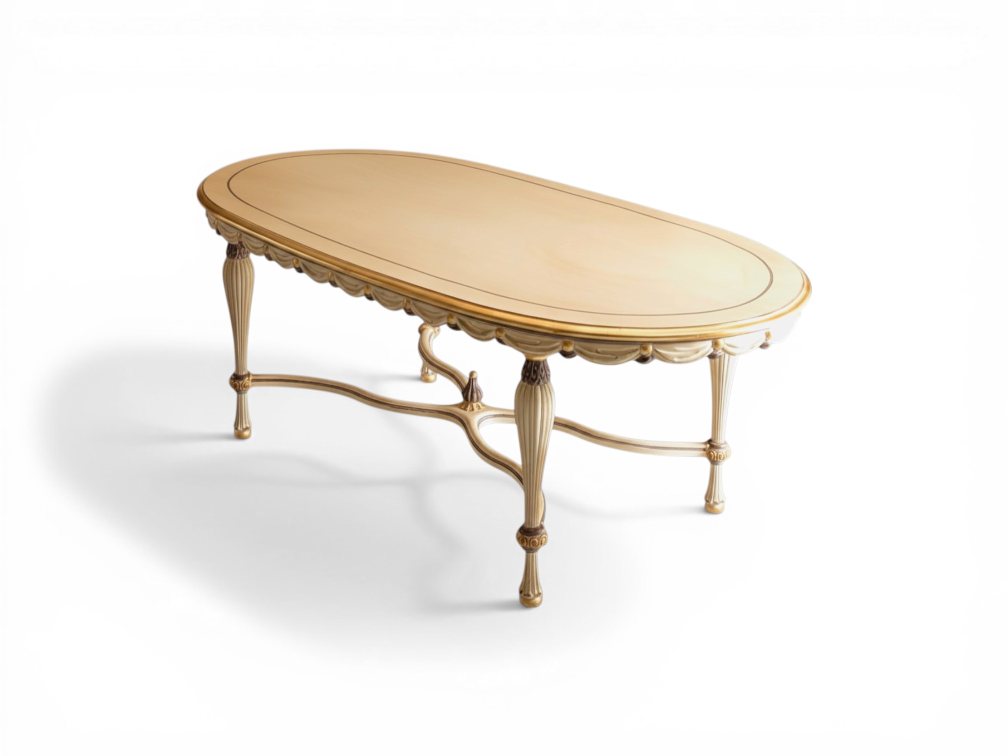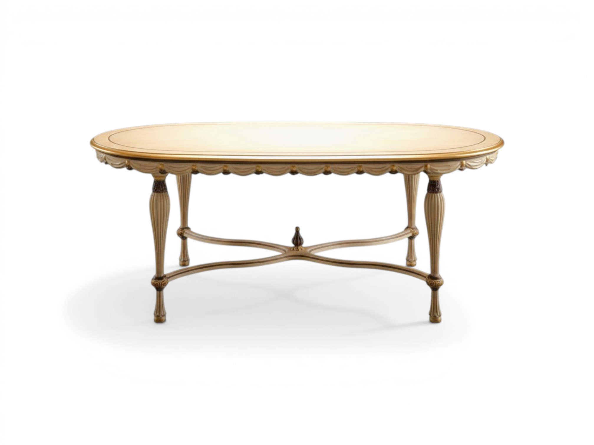 The Louis XVI Oval Dining table reflects refined neoclassical elegance with its graceful oval silhouette and delicately carved apron detailing. Inspired by classic Louis XVI design, its fluted legs and symmetrical structure create a sense of balance and sophistication. Moreover, the subtle gilt accents and smooth finish enhance its luxurious presence, making it a statement centrepiece for elegant dining spaces.