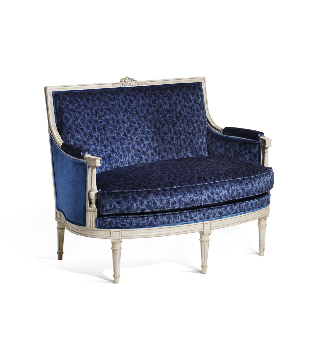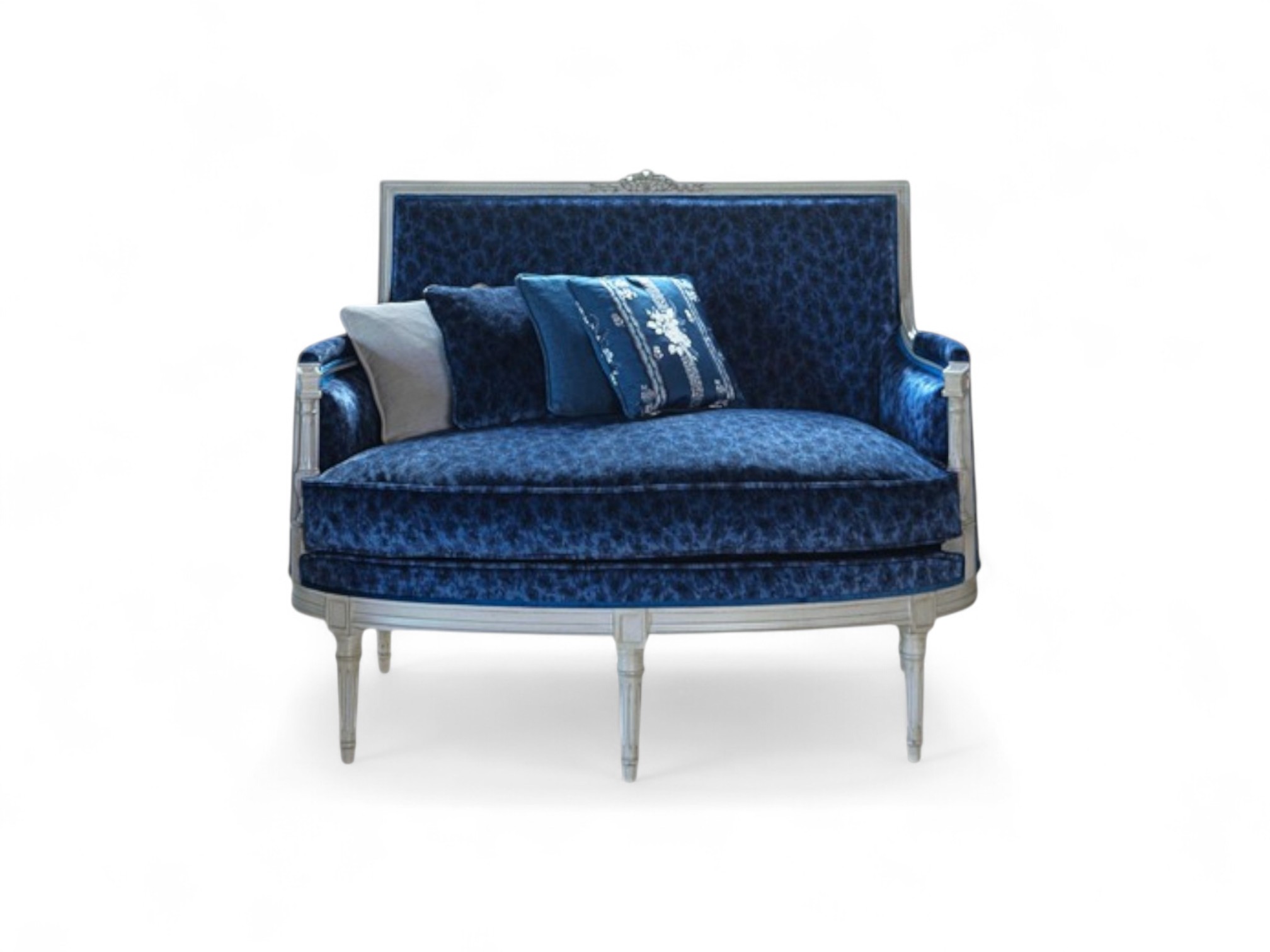 The Louis XVI Style Settee is a distinguished expression of neoclassical French design, blending aristocratic charm with timeless craftsmanship. Defined by its carved wood frame, fluted legs, and graceful crest detailing, it captures the elegance of 18th-century interiors. Upholstered in rich, blue patterned velvet, it offers both visual opulence and refined comfort.
