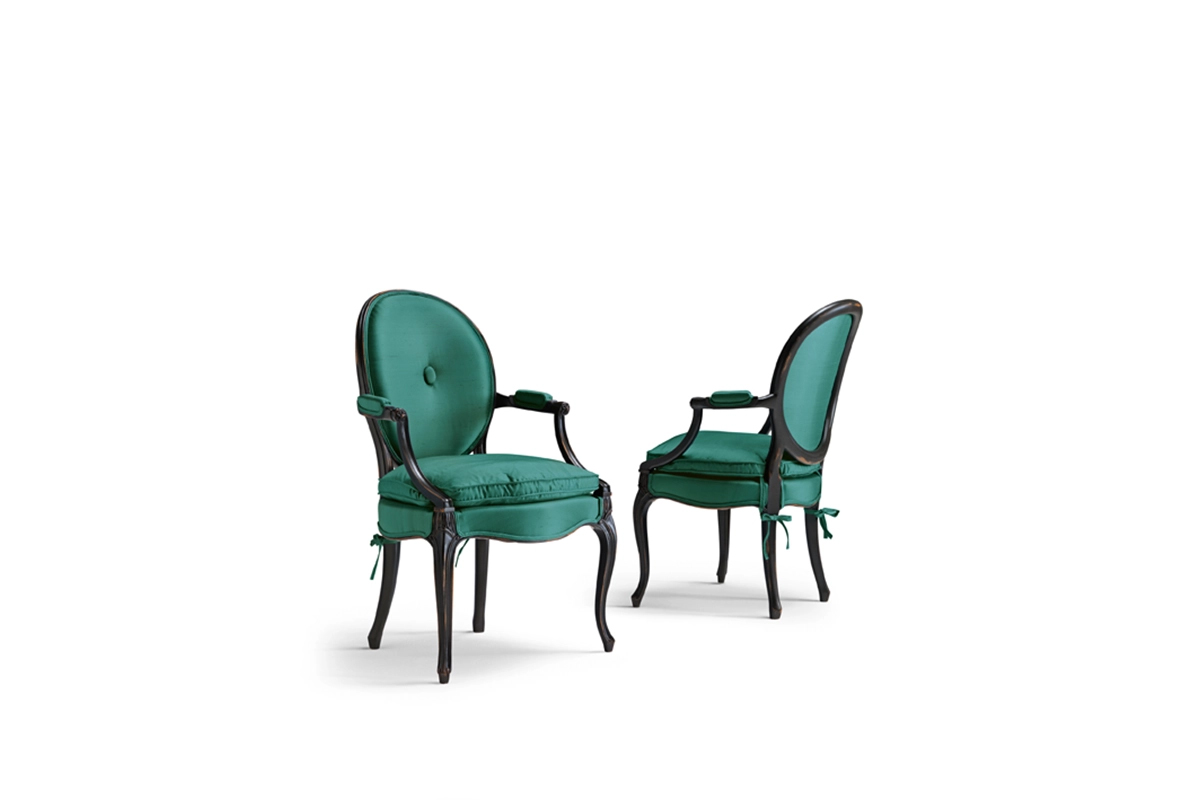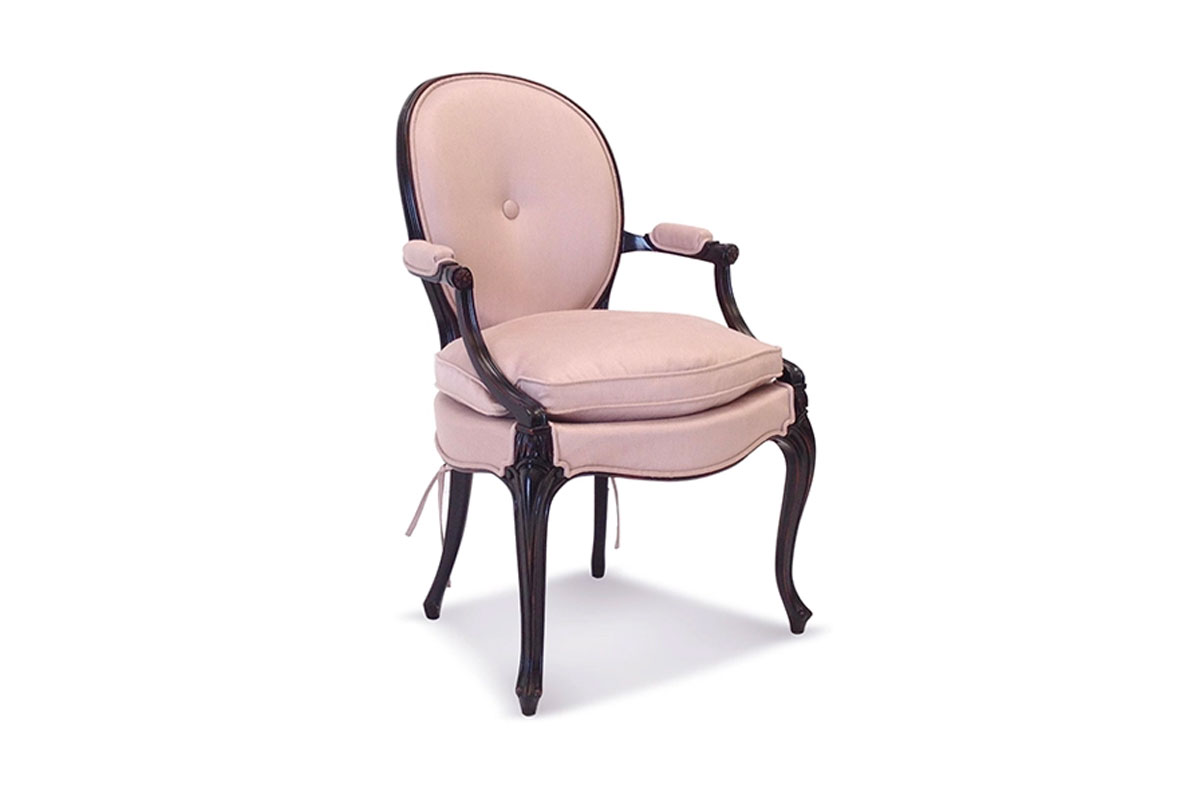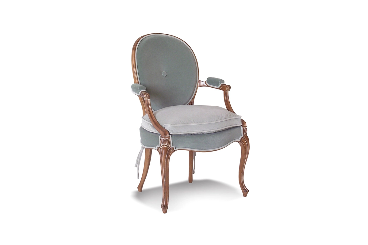 Design: Elegant, rounded-back armchair with intricate wooden frame.