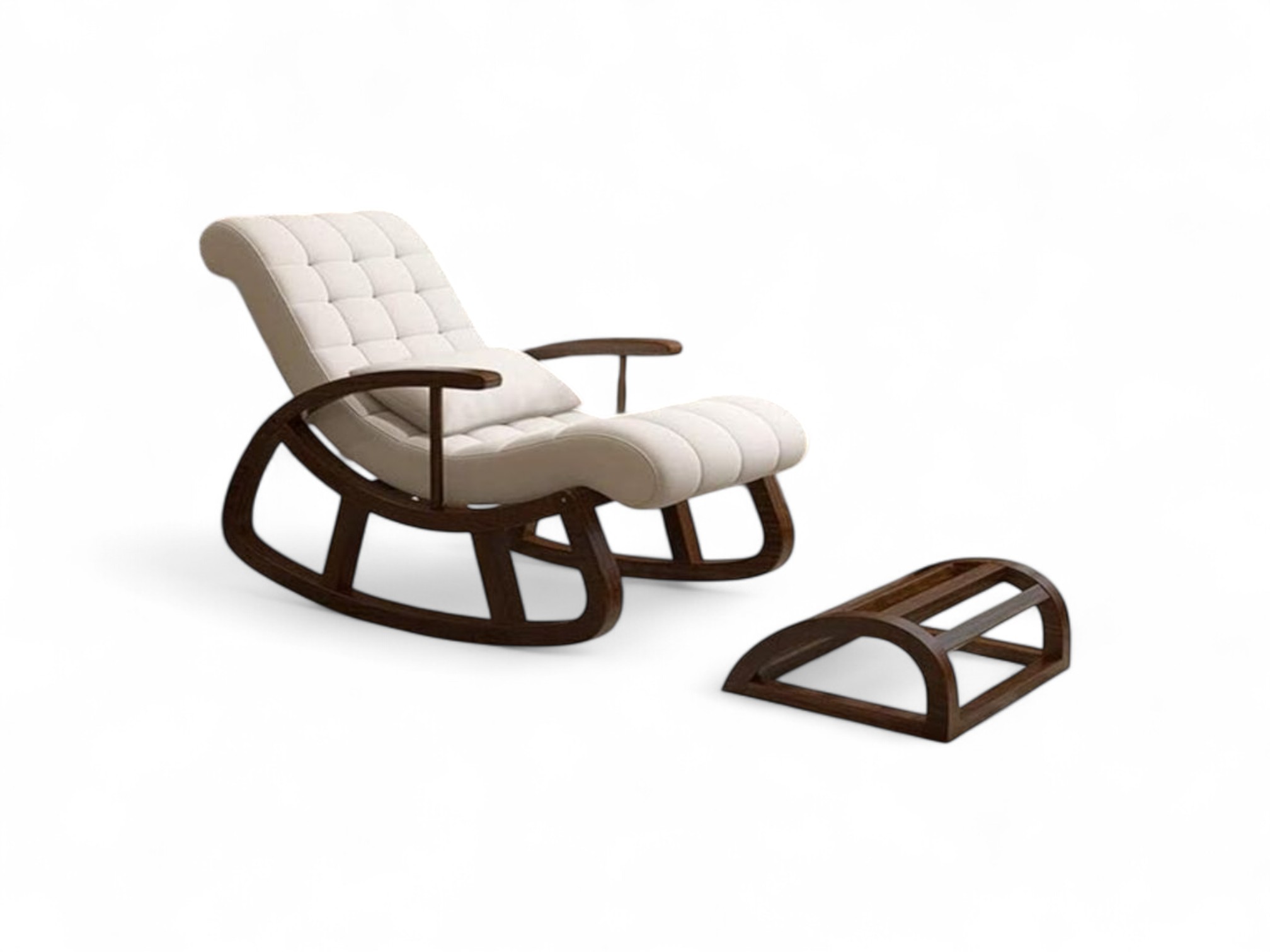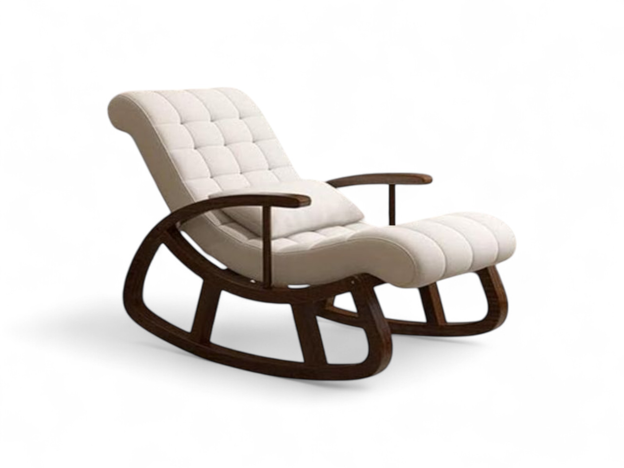 The Luxe Recline Rocker blends modern style with everyday luxury. Its sculpted hardwood base and cushioned, ergonomic shape offer full-body support. The curved design and tufted fabric create a sleek, sophisticated look. This rocker adds elegance to any living room, bedroom, or lounge area.
