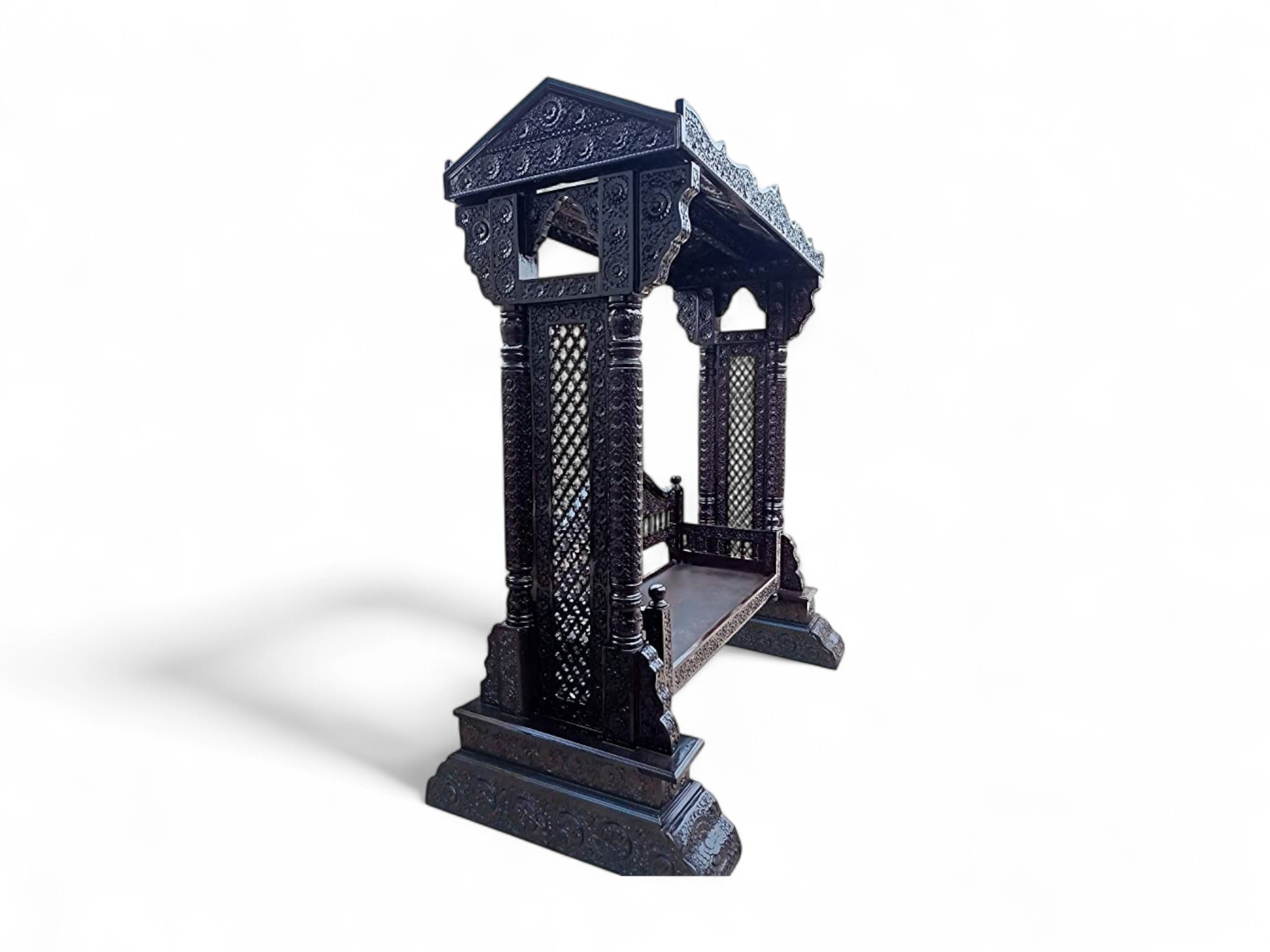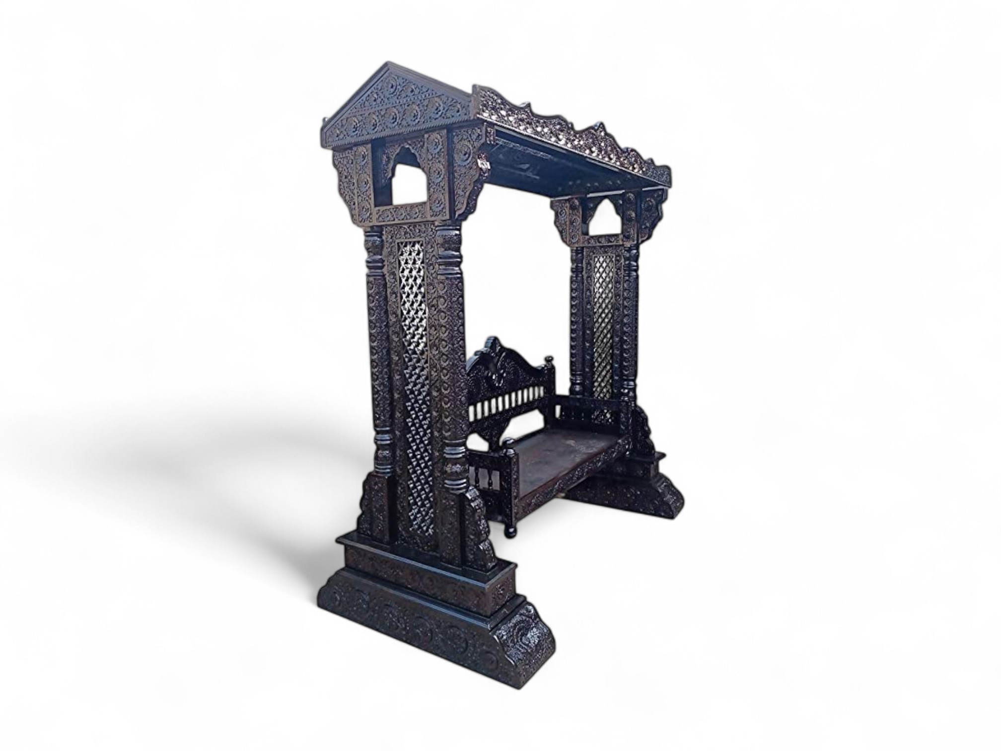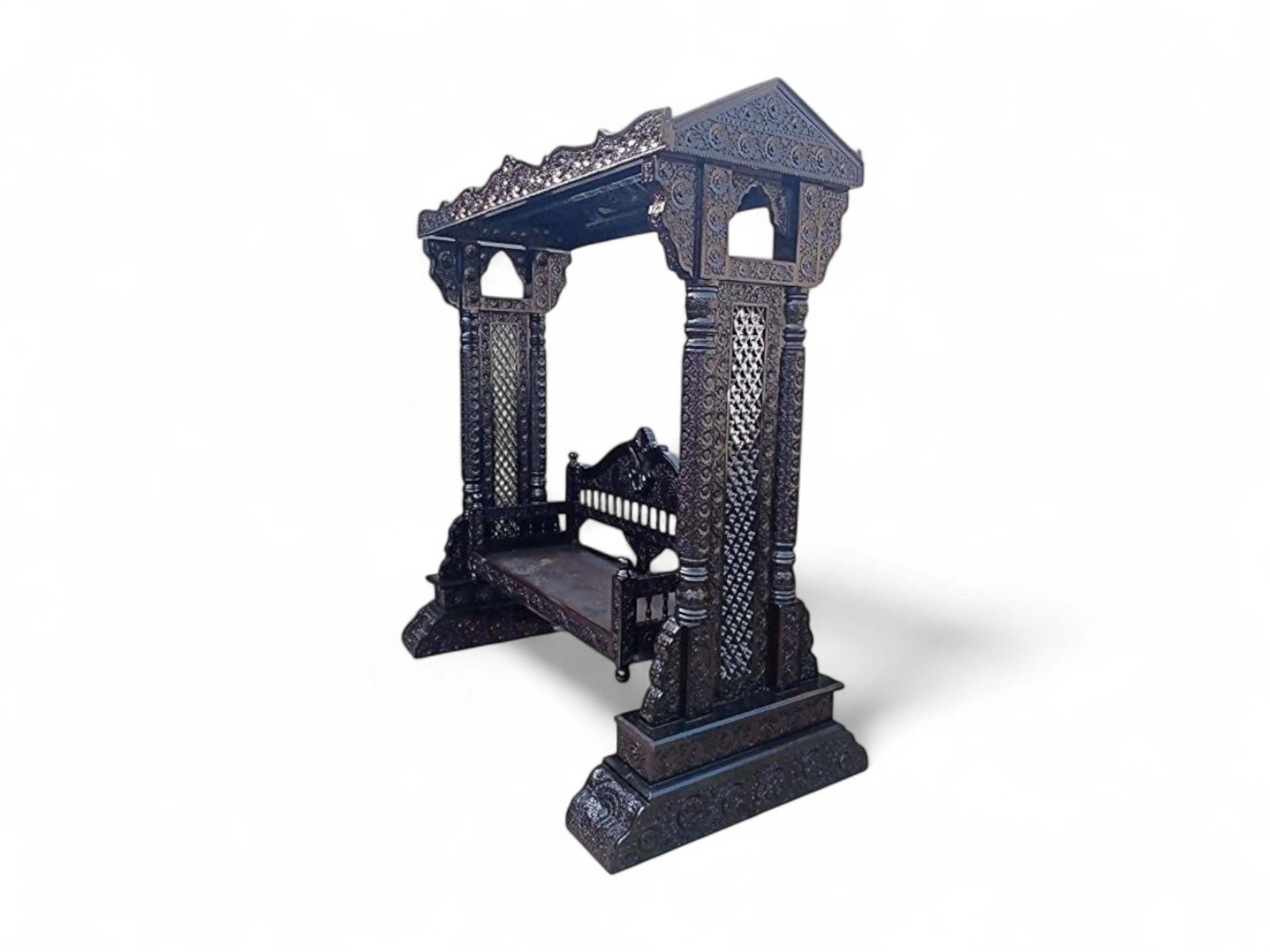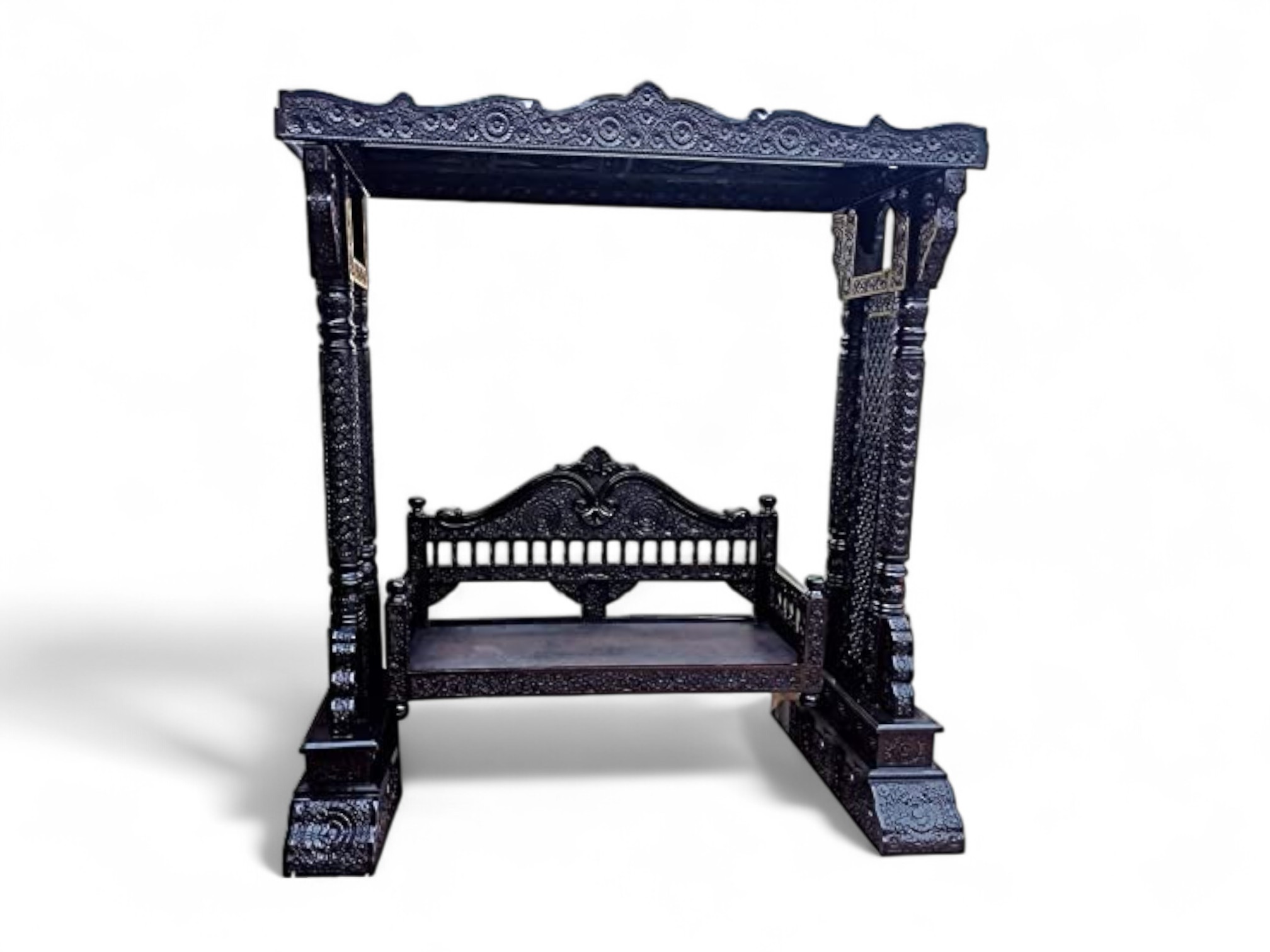 The Majestic Heritage Carved Swing blends traditional grandeur with detailed craftsmanship. Made from solid teak wood and finished in a rich dark tone, this swing features carvings inspired by classic Indian architecture. The ornate canopy, carved pillars, and patterned side panels add a sense of timeless heritage.