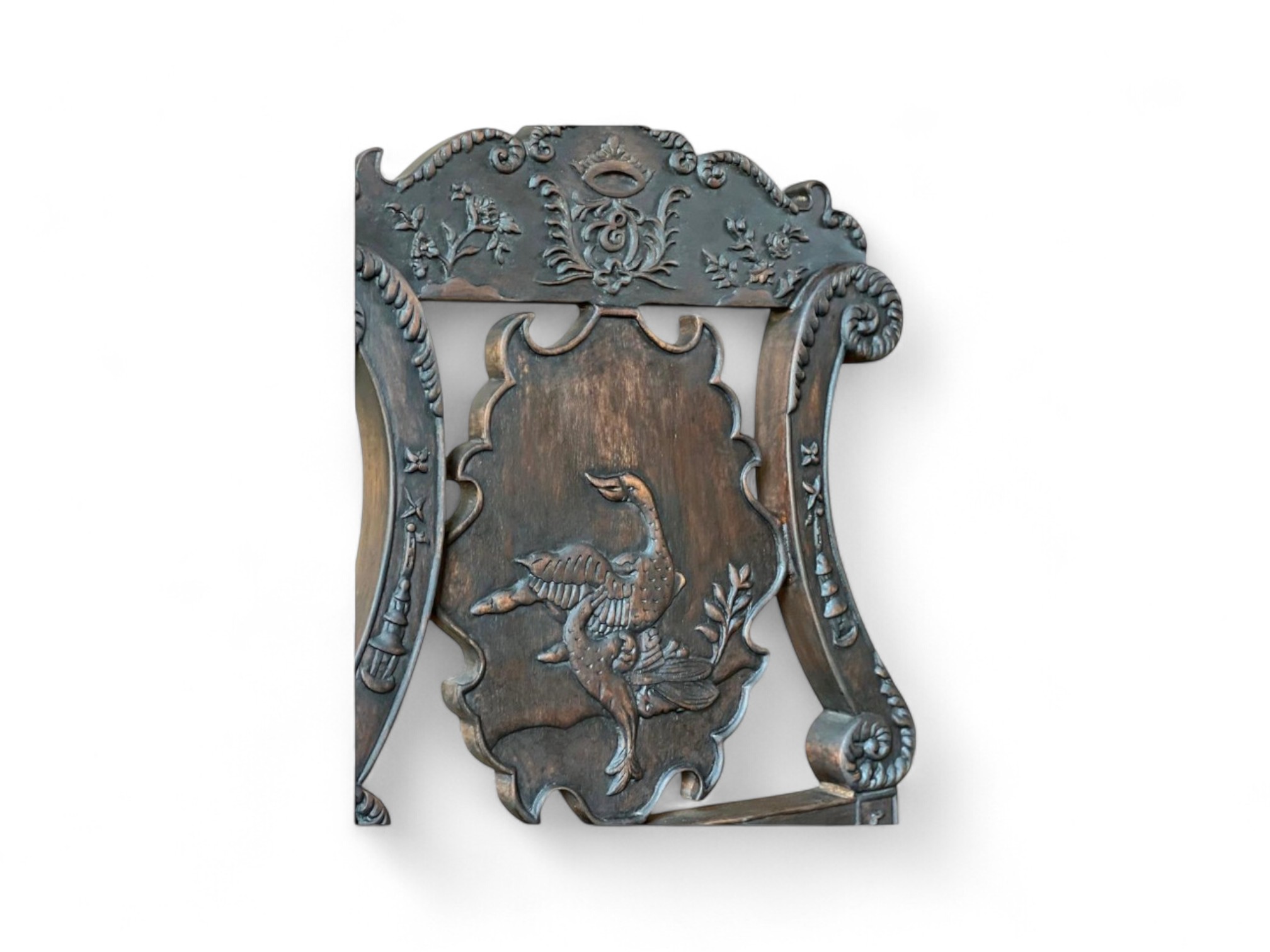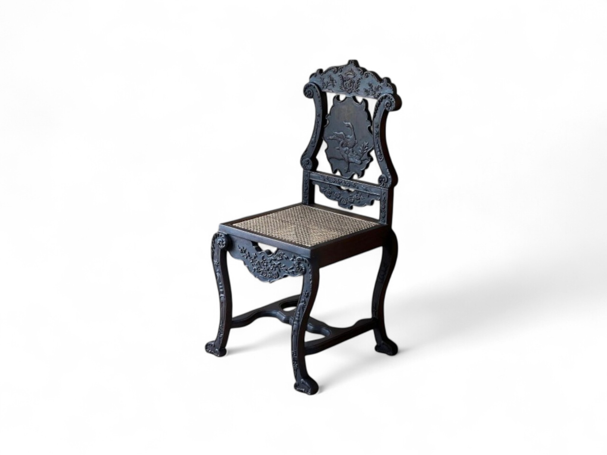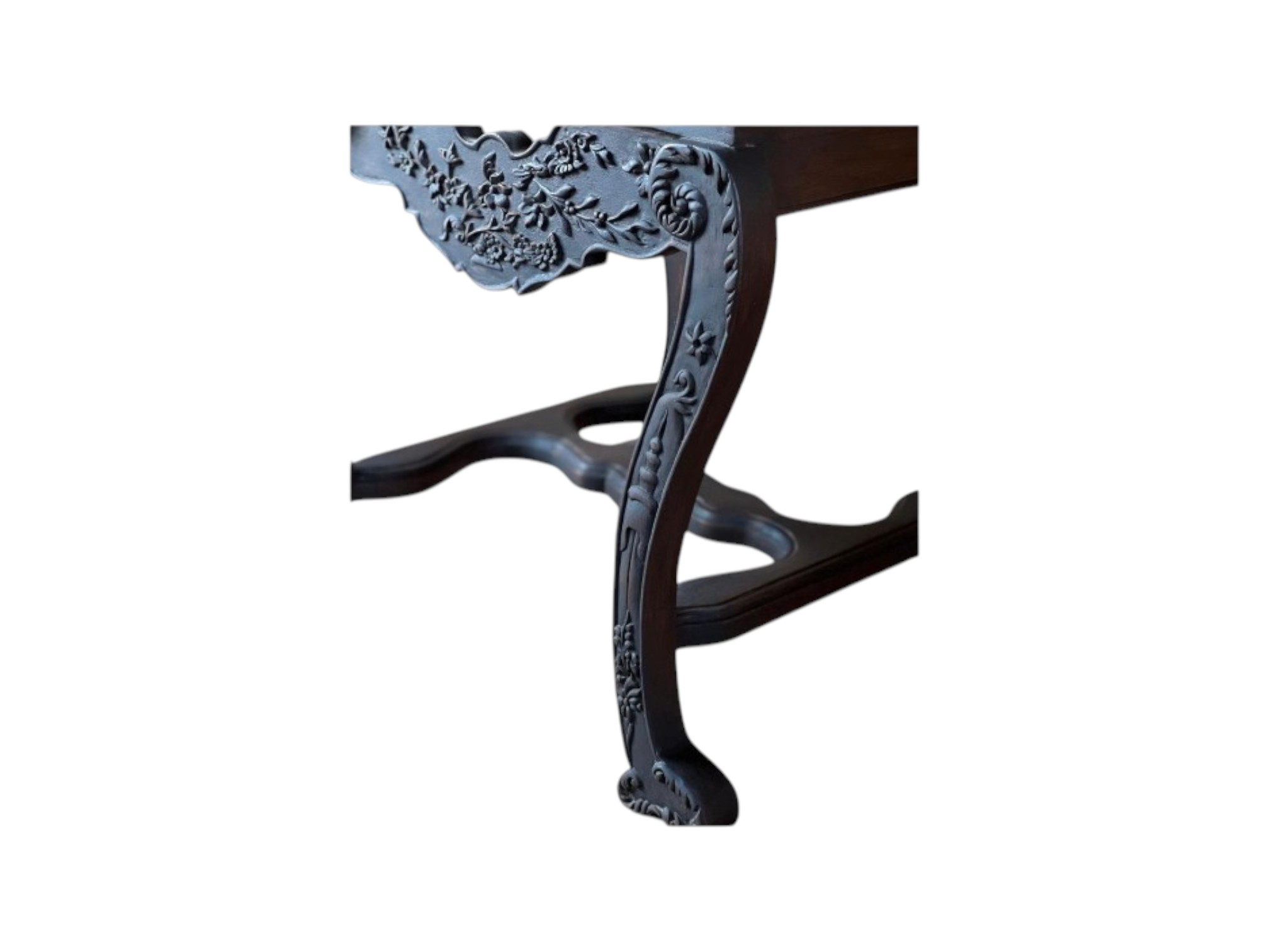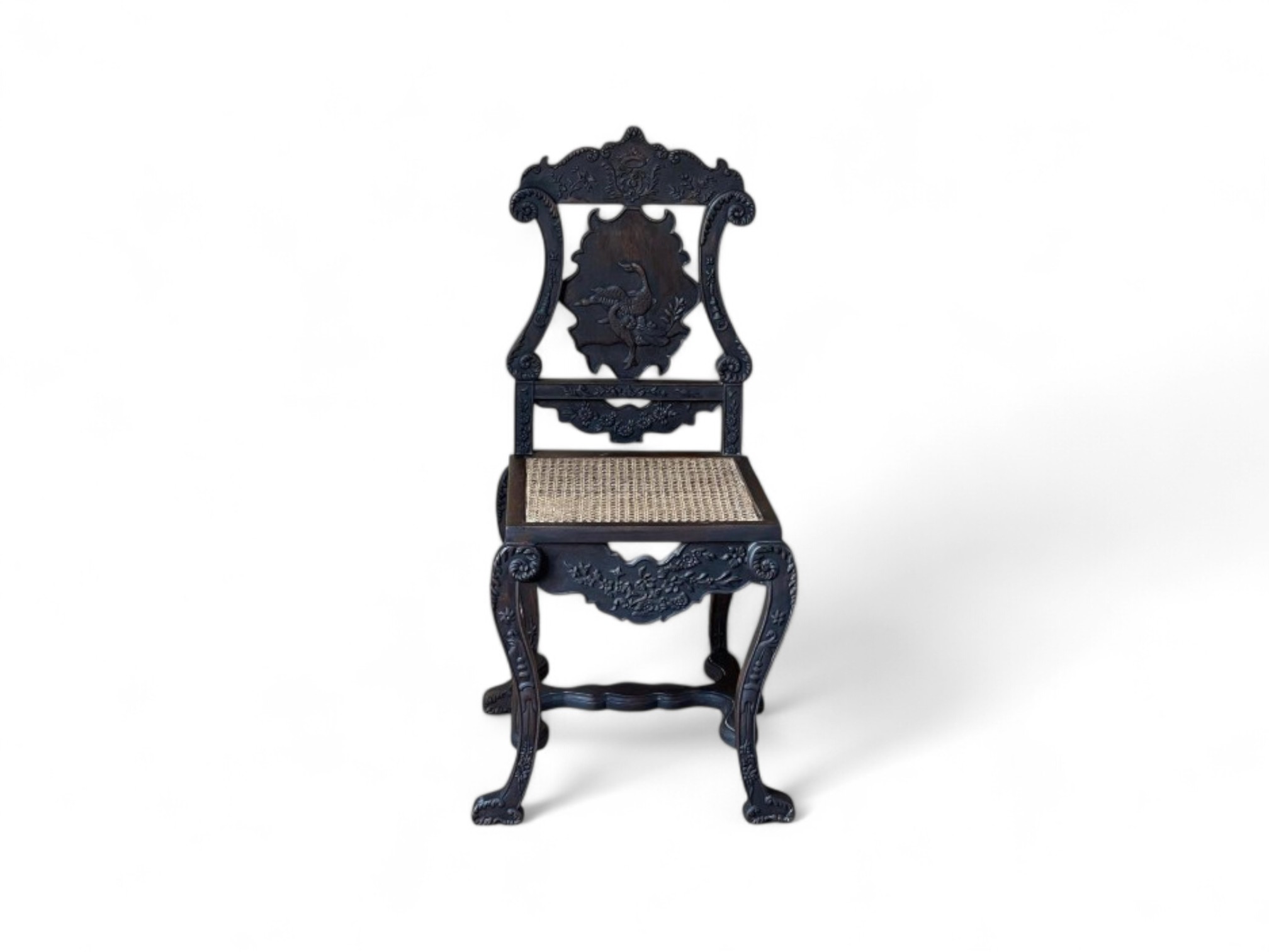 The Noir Crest Chair blends vintage opulence with sculptural elegance, creating a refined statement in any interior. Its hand-carved wooden frame, finished in rich black, highlights every floral detail and graceful curve of its Rococo-inspired silhouette. Meanwhile, the arched cane backrest introduces both airiness and texture, softening the dramatic profile without losing its bold presence. As a result, this chair stands out effortlessly in both traditional and contemporary spaces.