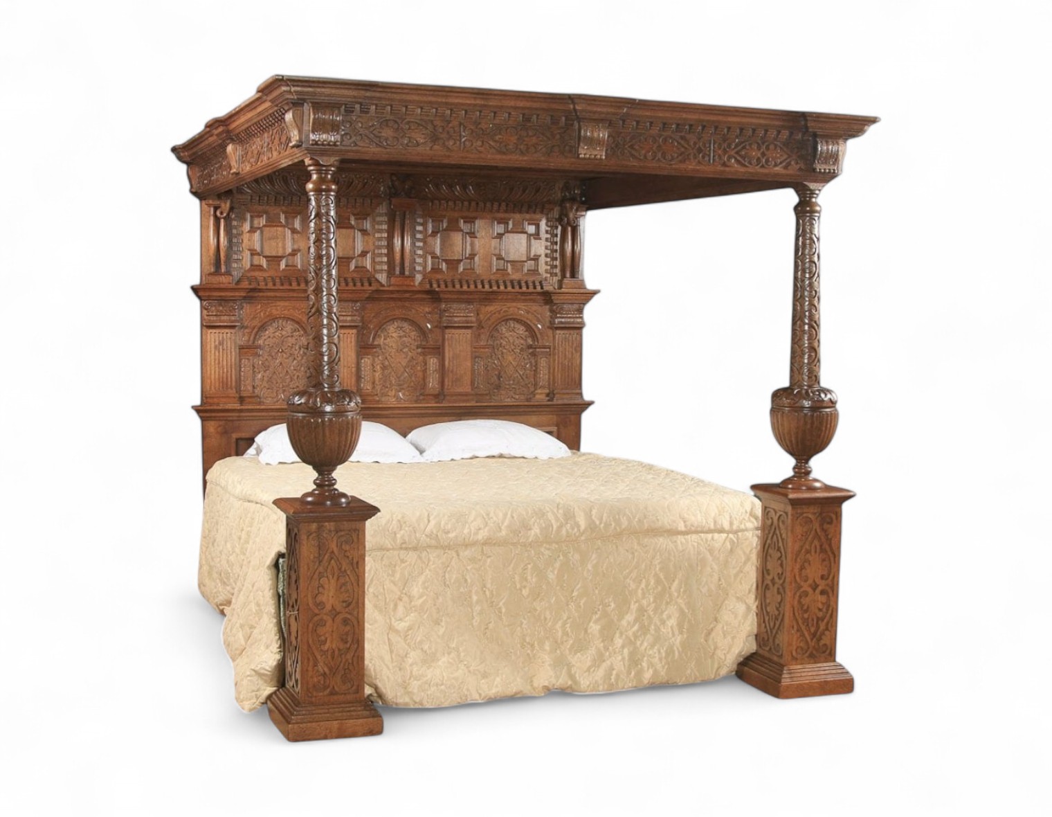 The Oak Majesty Canopy Bed is a stunning statement of craftsmanship and heritage design. This bed features a commanding headboard adorned with carved arches and intricate detailing, supported by four bold pillars that rise to hold the exquisite canopy. The polished oak finish brings out the natural grain of the wood, creating warmth and depth in every curve and motif.