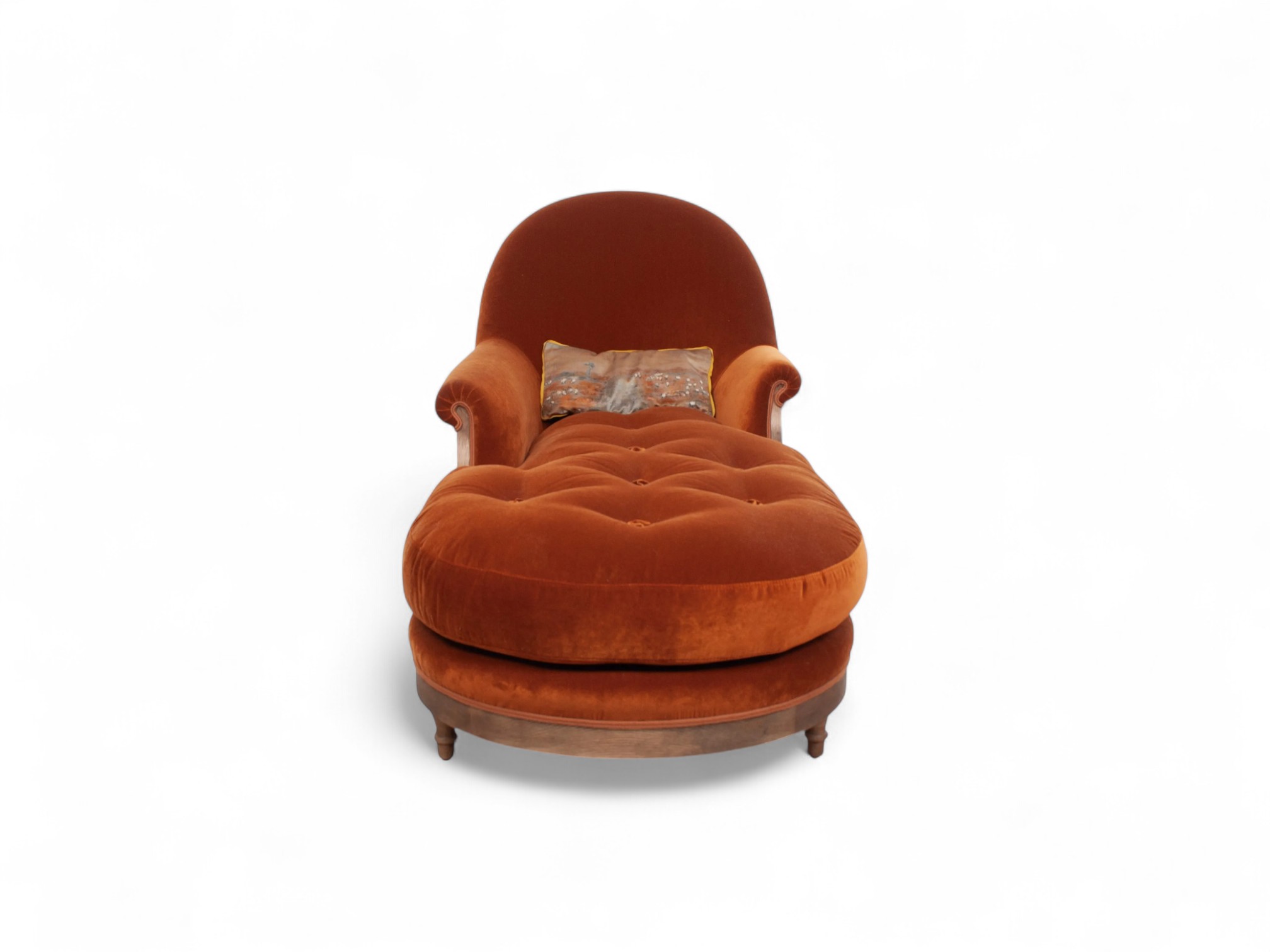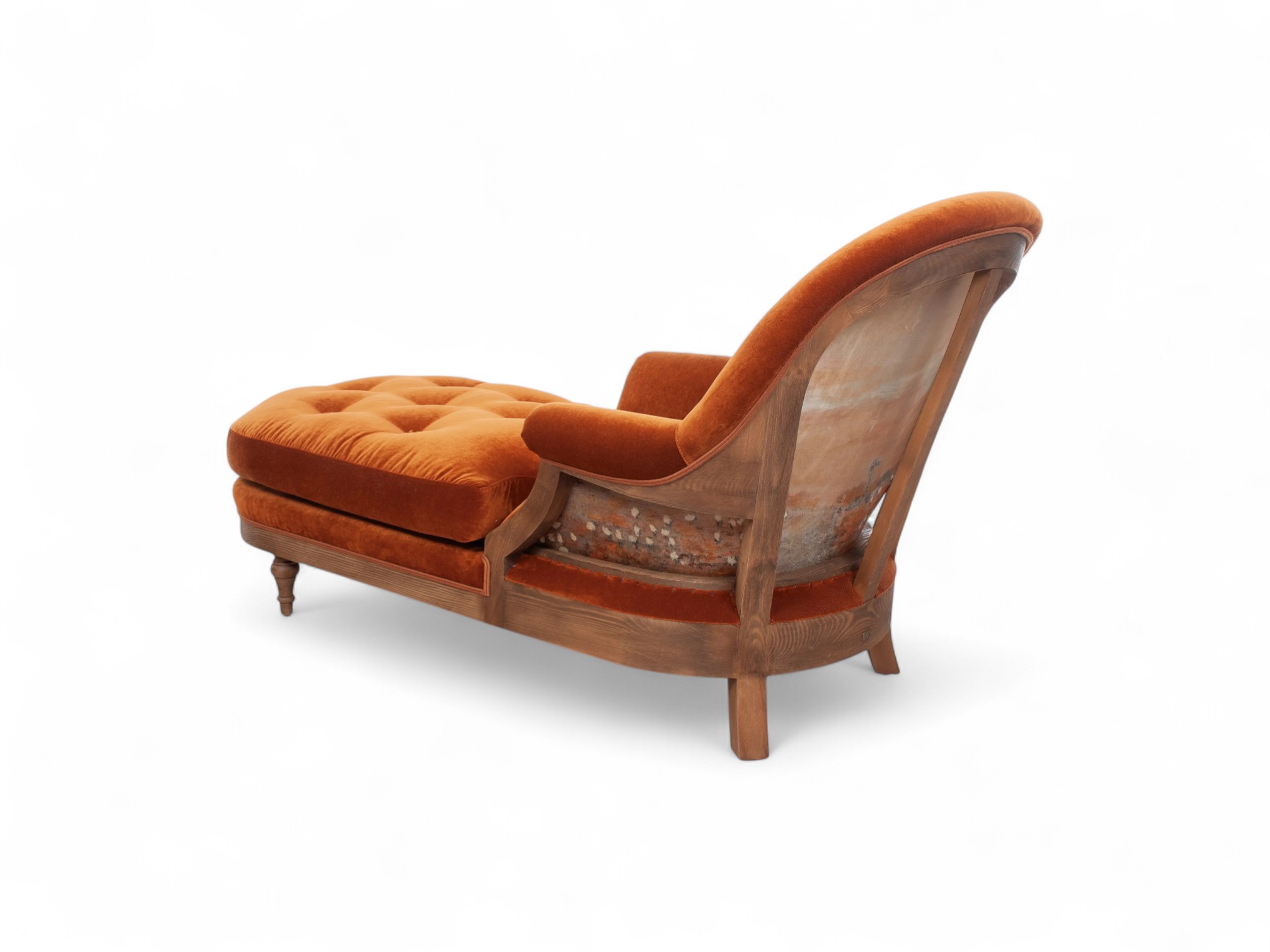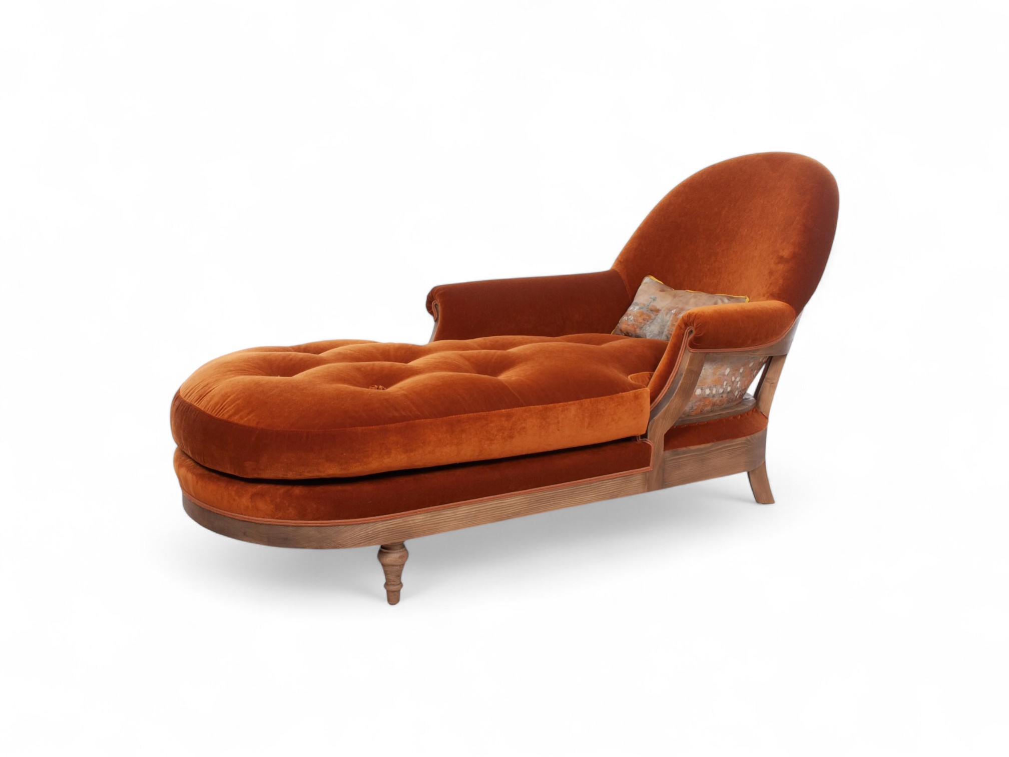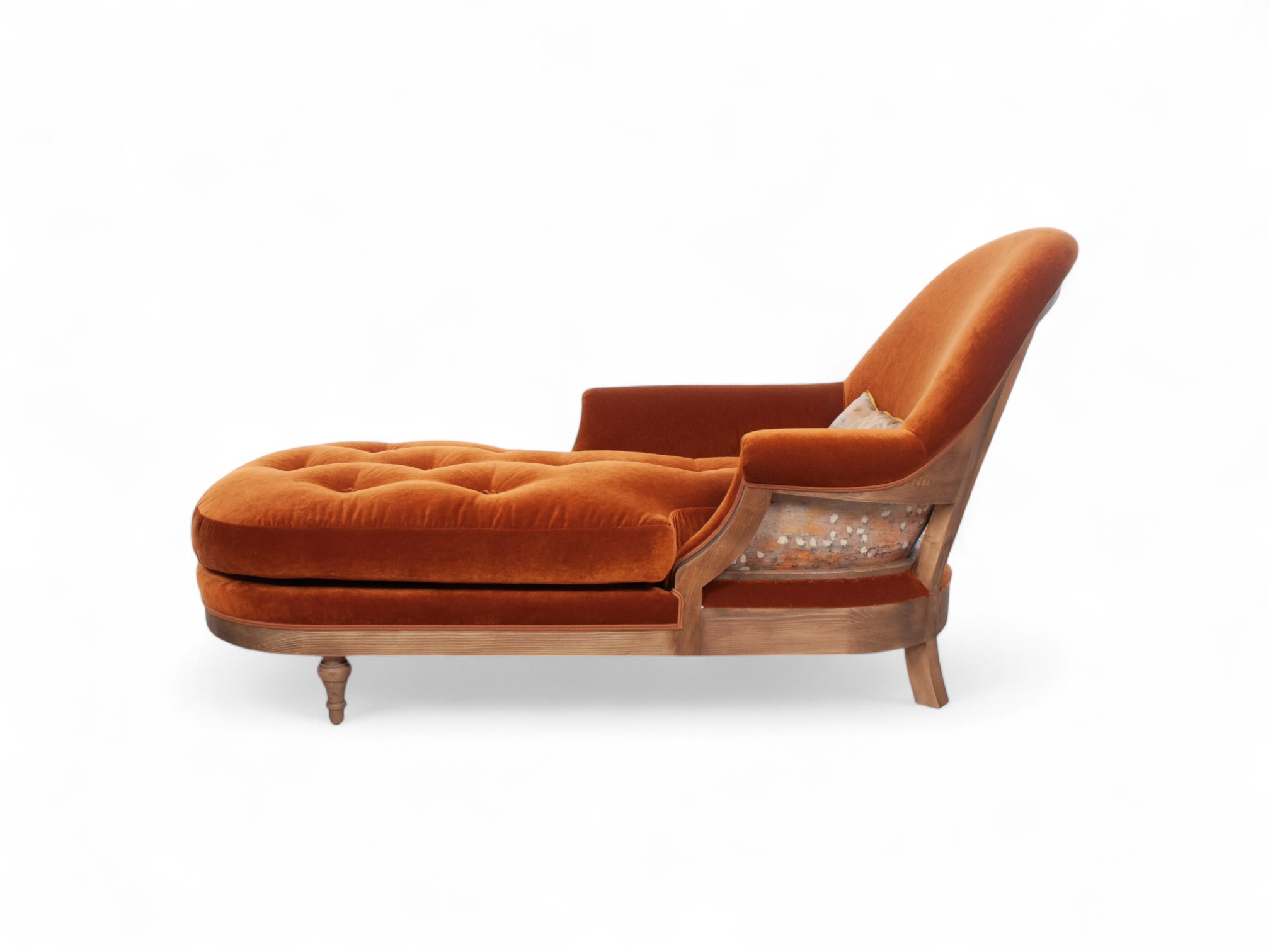 With its gracefully curved backrest and intricately designed wooden frame, this lounge combines vintage-inspired aesthetics with modern refinement. Ideal for a living room, bedroom, or reading nook, the Opulent Orange Chaise Lounge is the perfect place to unwind in style.