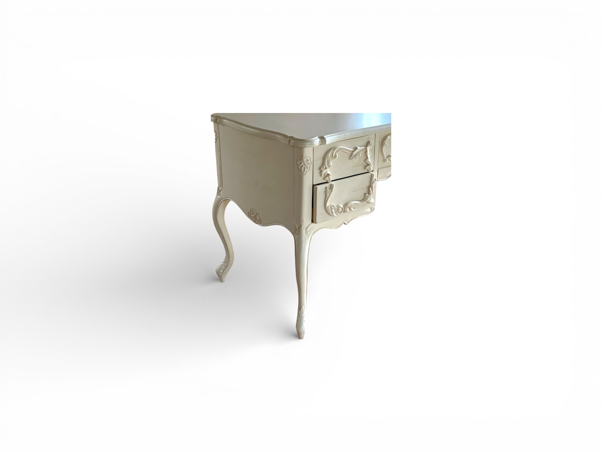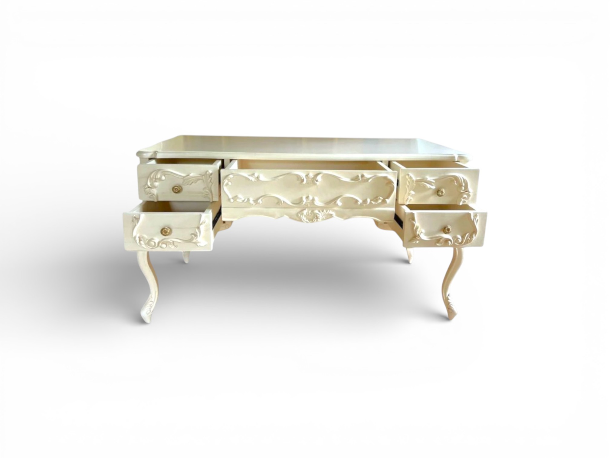 Ornate Heritage Desk showcases timeless European craftsmanship with its sculpted apron, intricately carved drawer fronts, and gracefully curved cabriole legs. Designed to elevate refined interiors, it creates a commanding yet elegant workspace while adding decorative richness to bedrooms, studies, or boutique office settings. Its balanced proportions and artistic detailing reflect classic luxury with enduring appeal.