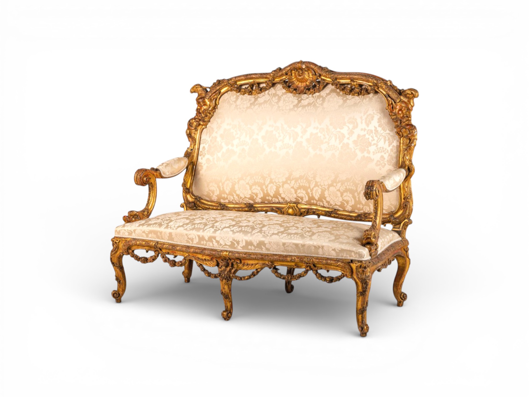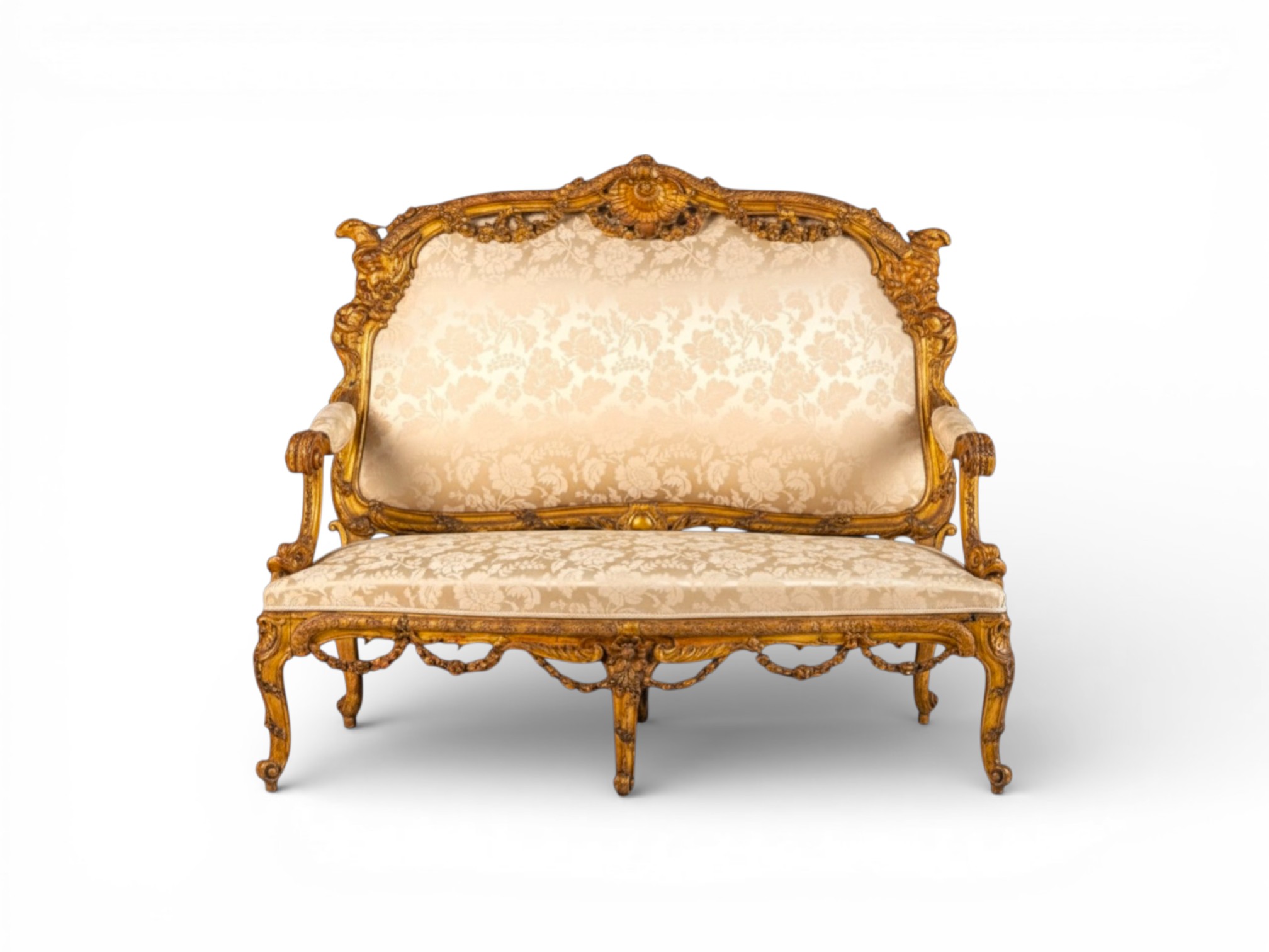 Master artisans craft the structure from solid hardwood and meticulously carve decorative motifs along the arms, apron, and legs. Consequently, every contour reveals remarkable craftsmanship and timeless baroque elegance. The supportive backrest ensures comfortable seating, while the generously cushioned seat provides lasting relaxation. In addition, the reinforced frame enhances strength and durability. Therefore, the sofa suits luxury villas, classic residences, and refined reception areas perfectly.