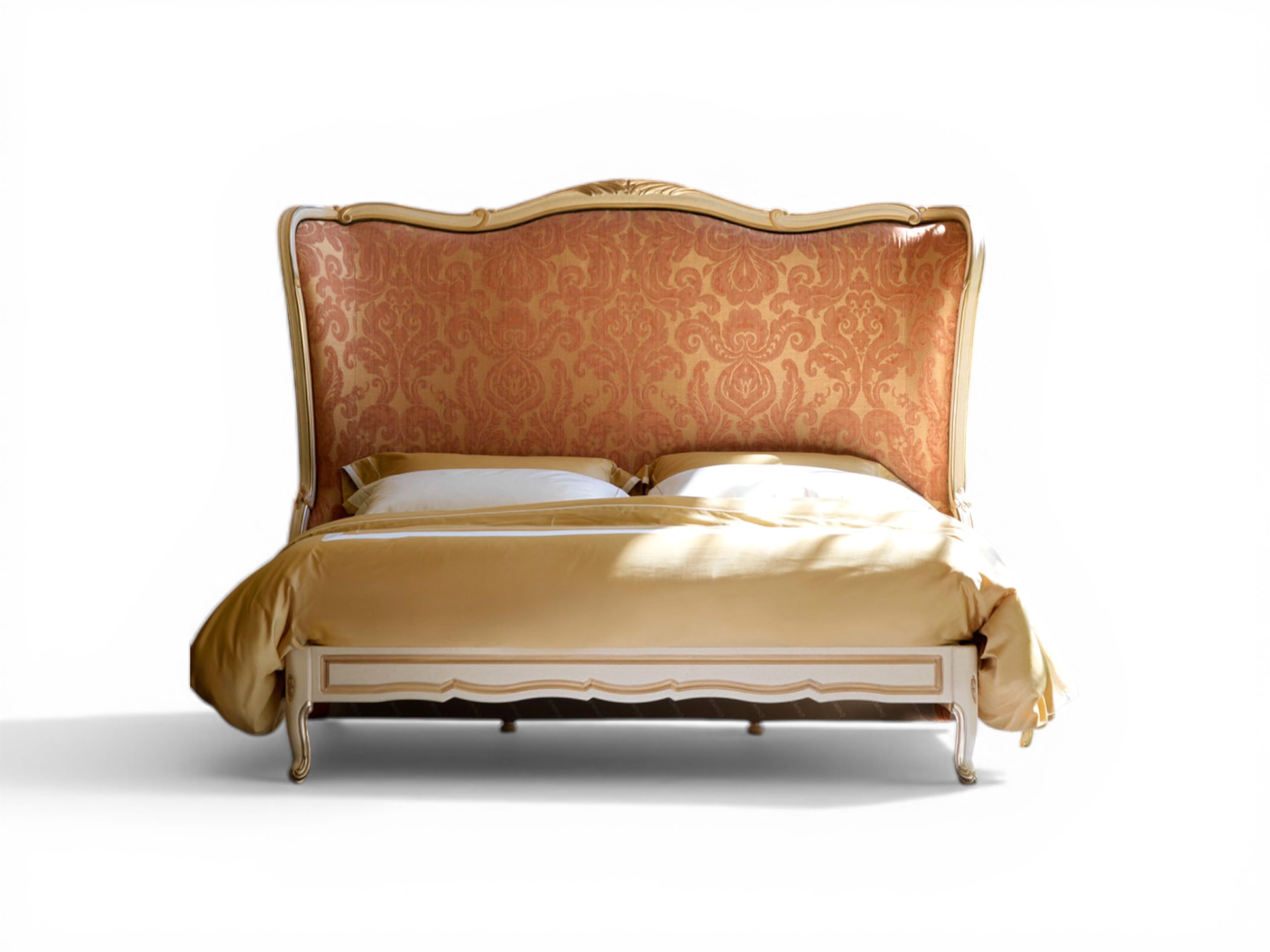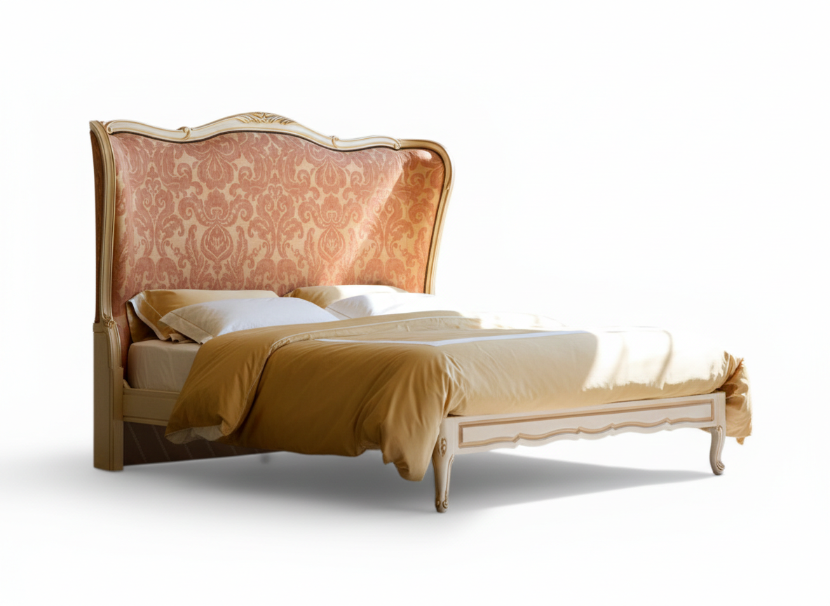 The Palace Rouge Bed radiates regal warmth through its tall upholstered headboard wrapped in rich damask-inspired fabric. Its gently curved silhouette and refined wooden frame create a harmonious balance between classical elegance and commanding presence. Moreover, the Palace Rouge Bed transforms grand bedrooms into statement spaces with its elevated proportions and refined European character.