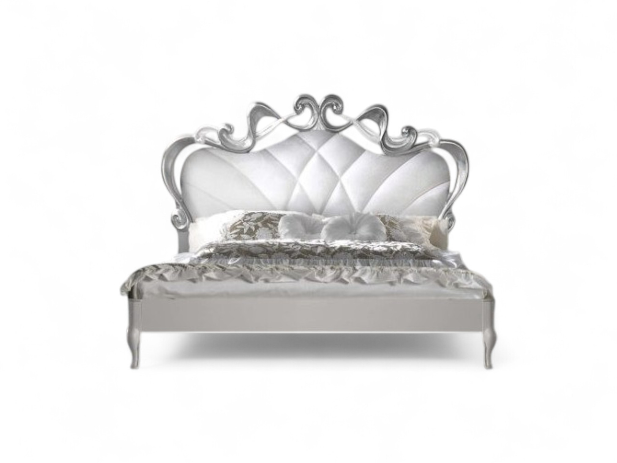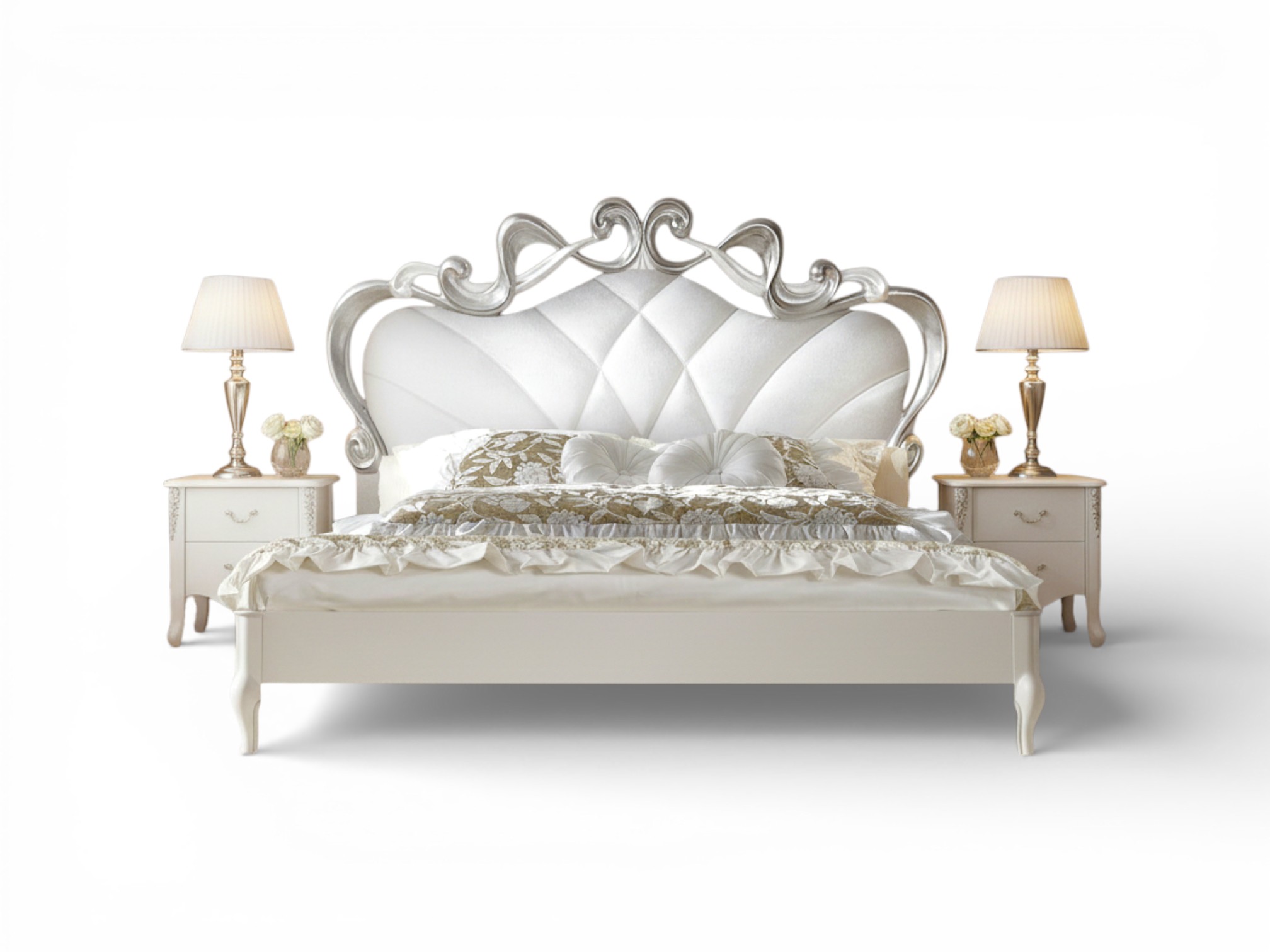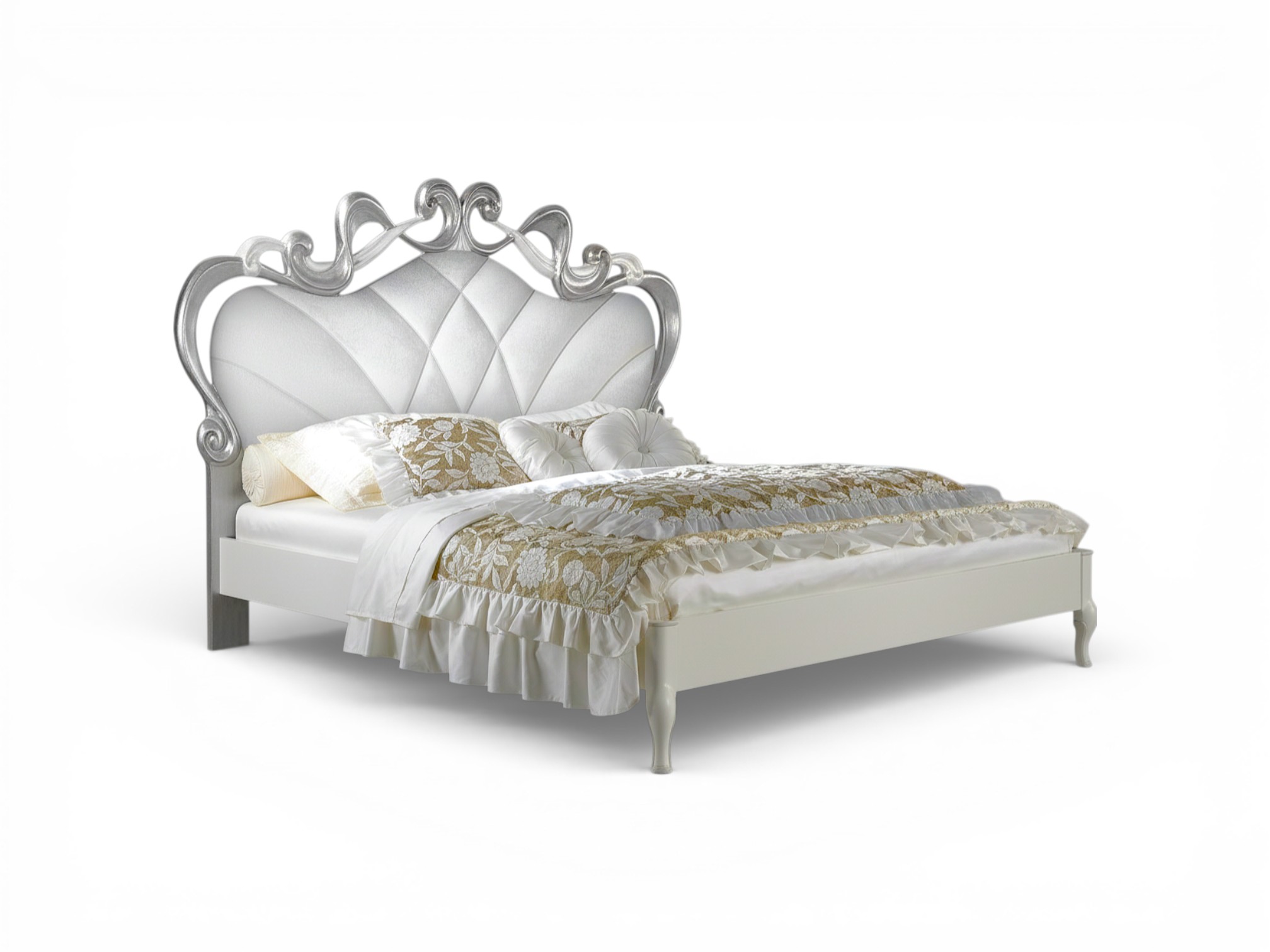 The Pearl and Silver Carved Bed introduces refined grandeur into the bedroom, masterfully blending sculptural form with delicate tones. Its high, sweeping headboard curves into an ornate silver-carved frame, creating an elegant silhouette that immediately draws the eye. Moreover, the luminous pearl-toned upholstery enhances the soft elegance of the design, while silver-leaf accents add a layer of luxurious sophistication.