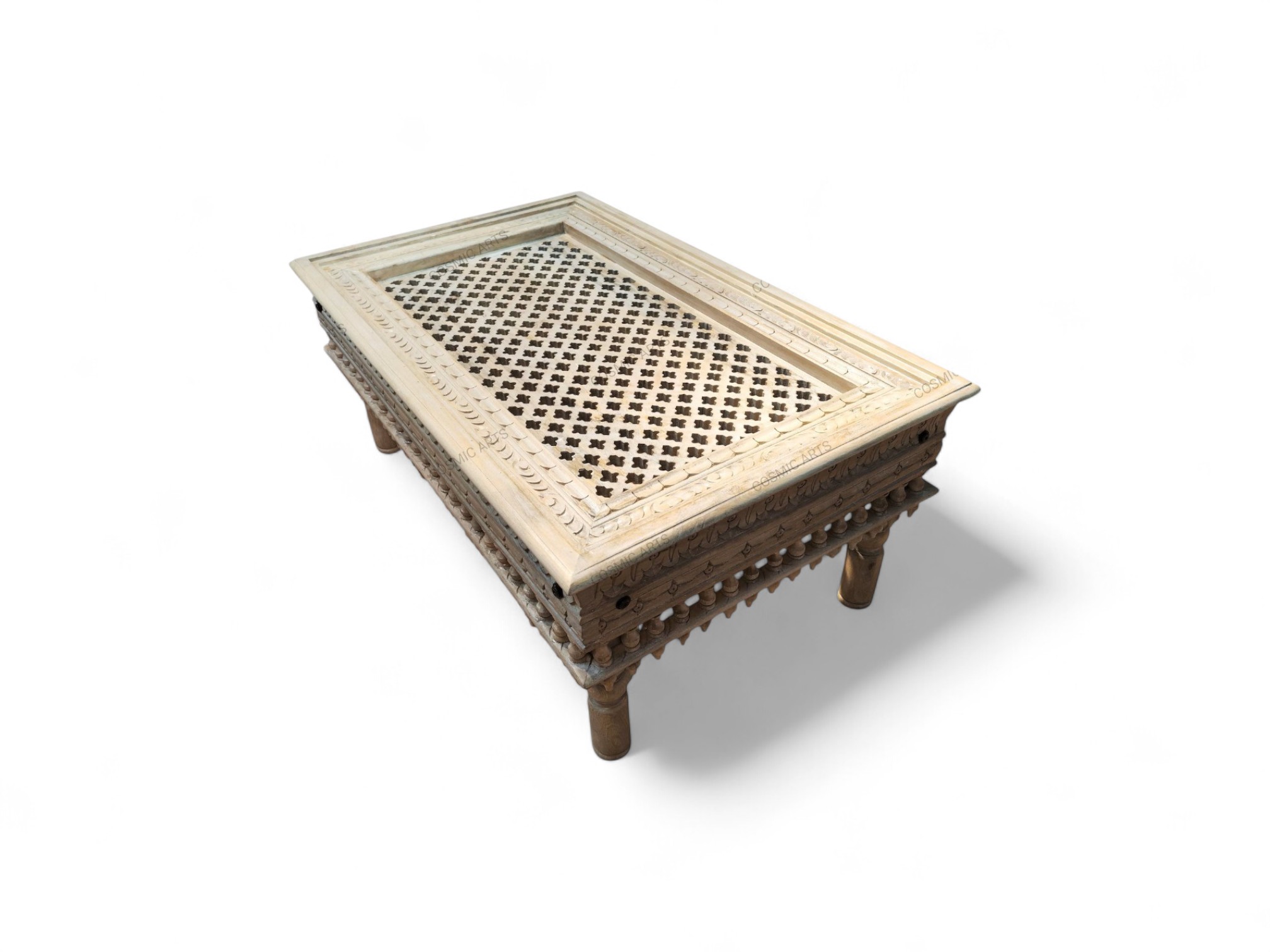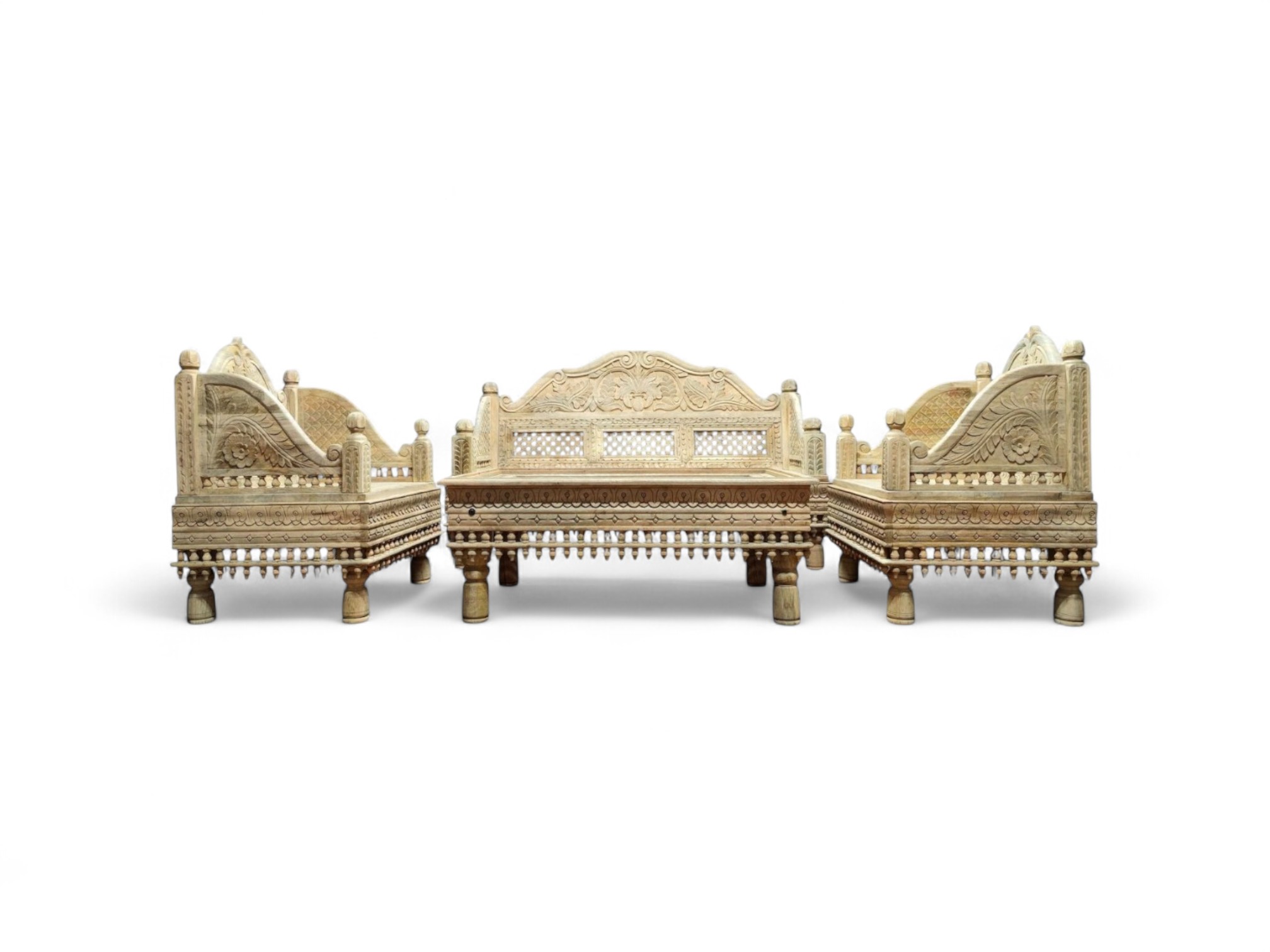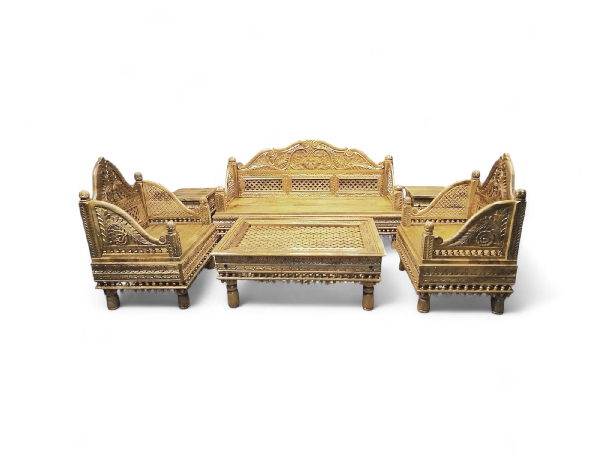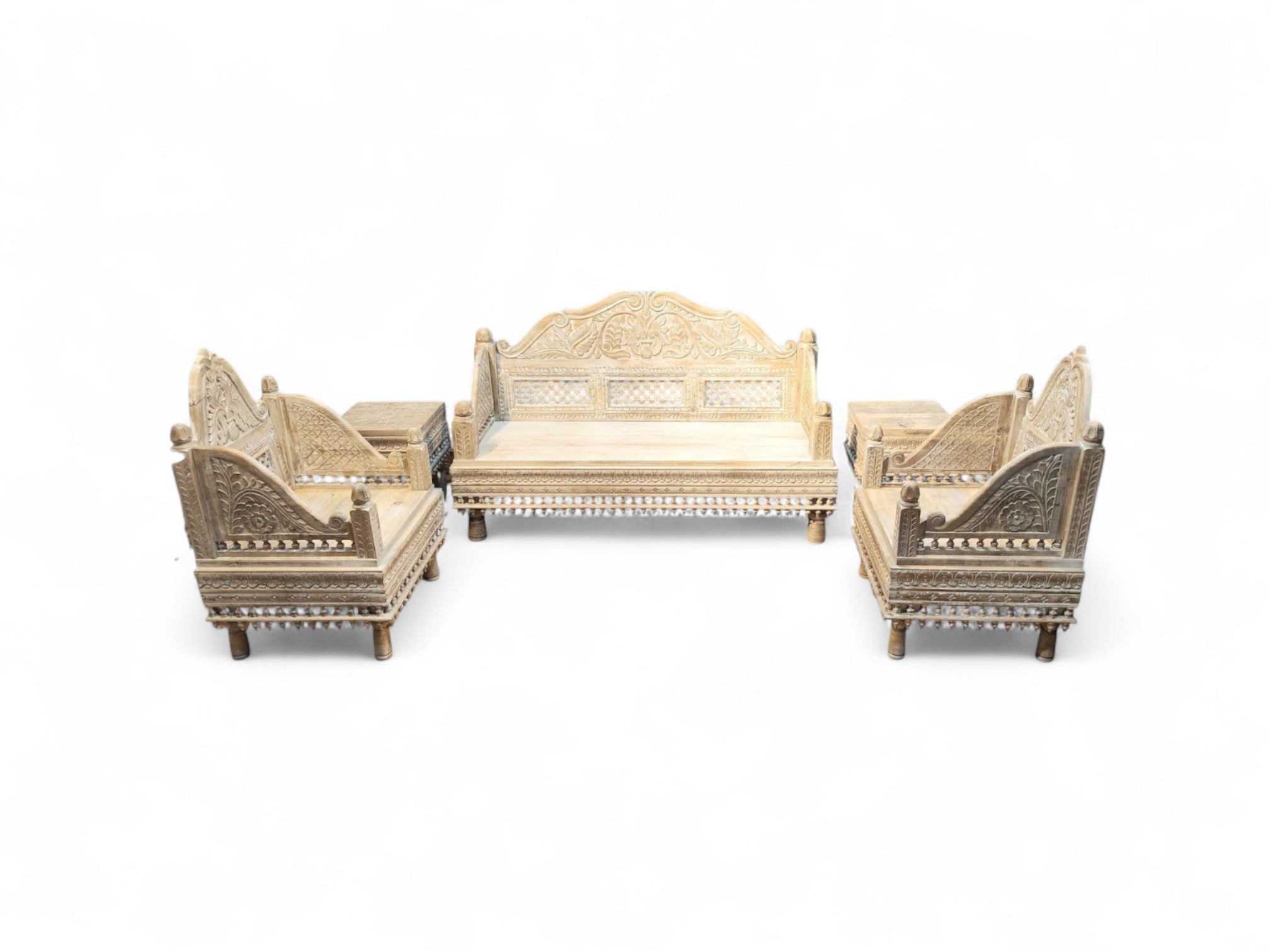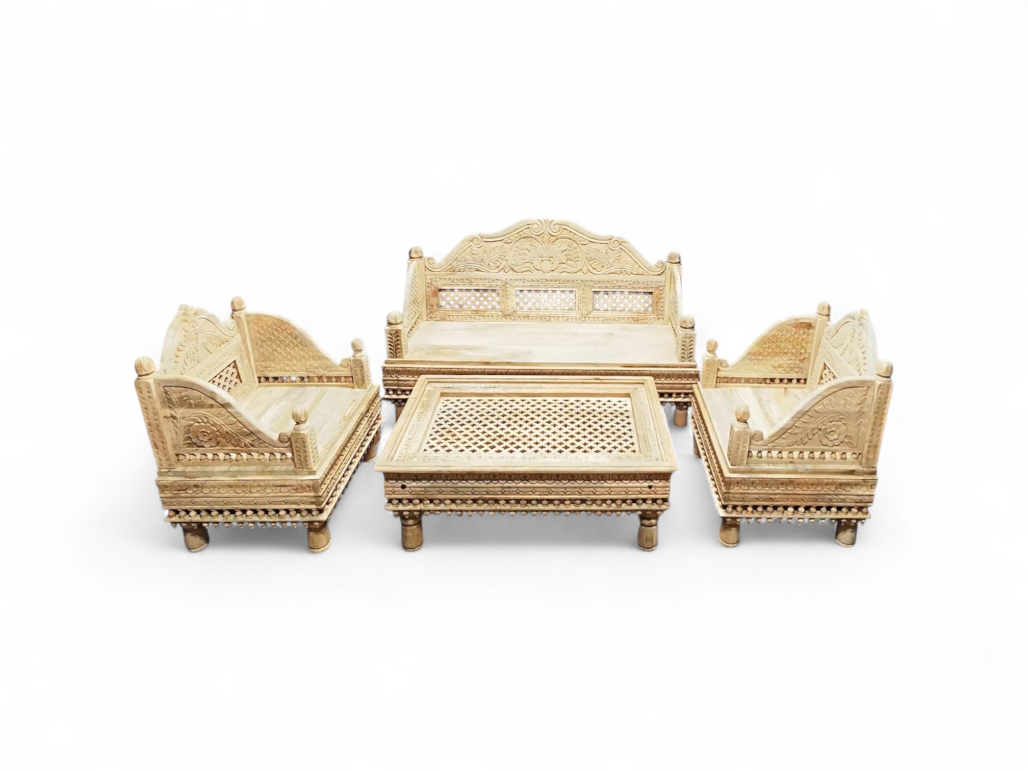The ornate floral and geometric motifs highlight the skills of master artisans, giving the set a royal character that elevates any interior. Its polished wooden finish enhances the depth of the carvings while offering strength and durability for everyday use. Perfect for formal drawing rooms, cultural spaces, or royal-inspired living areas, this set combines functionality with timeless grandeur.