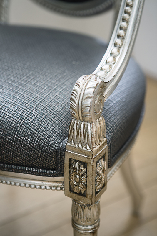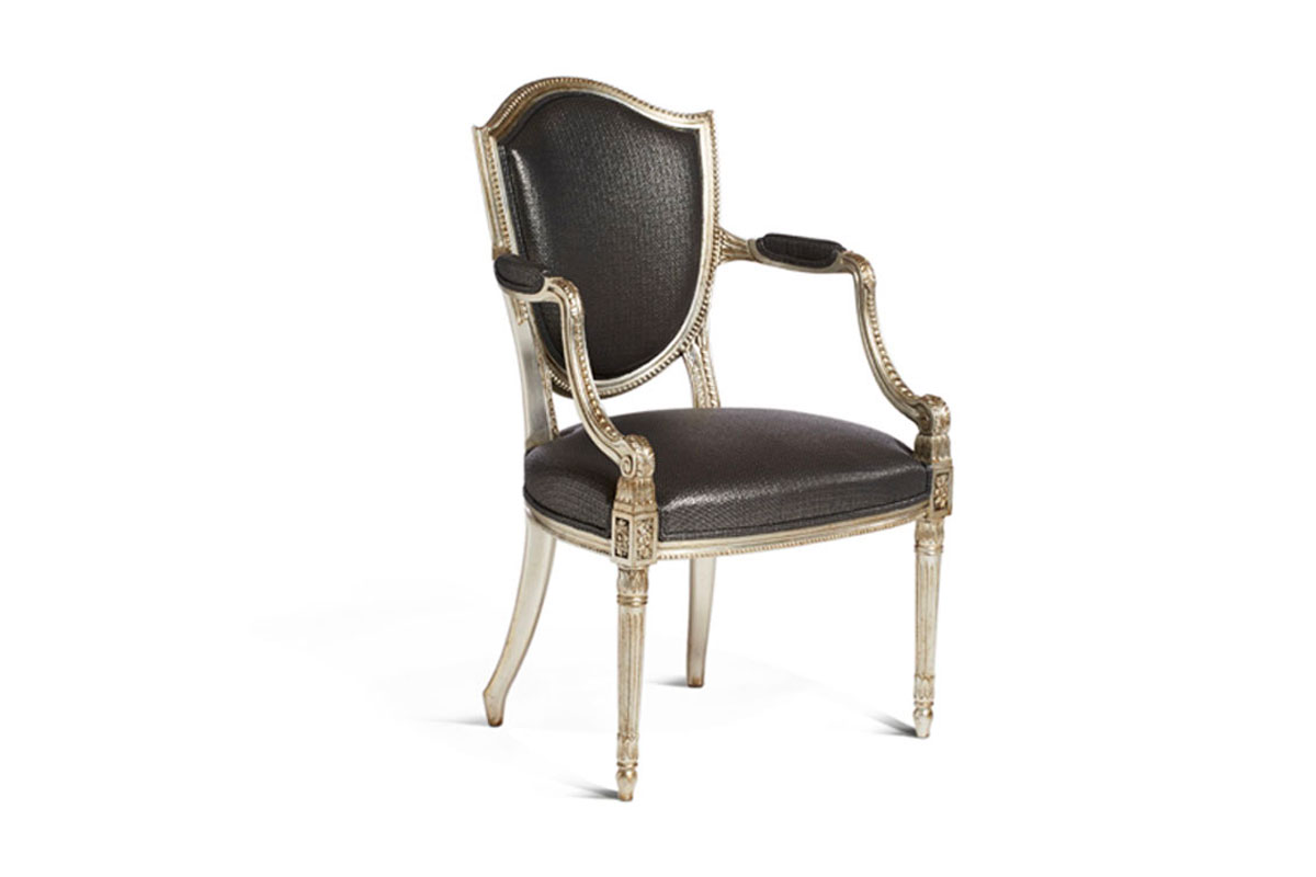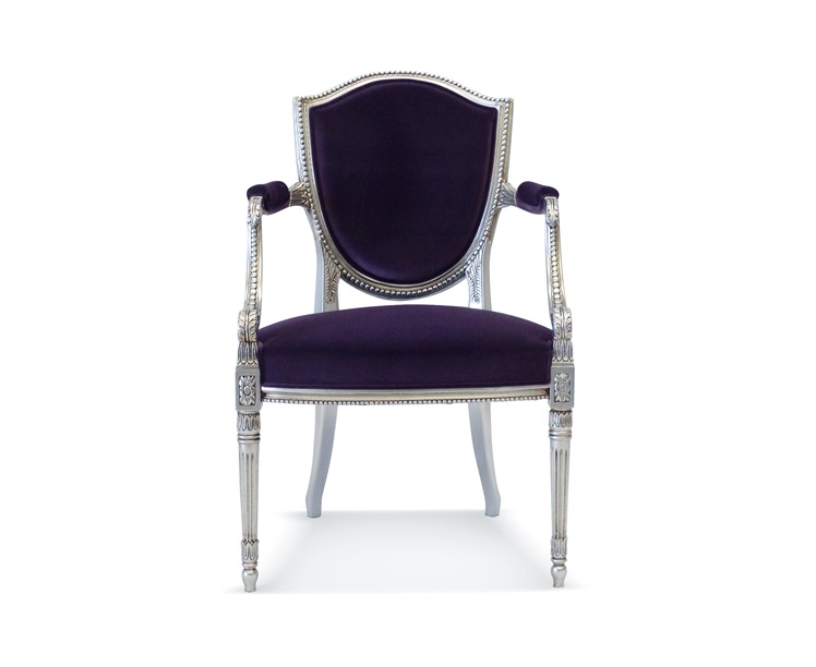 The Regal Contrast Armchair effortlessly blends luxury and refinement. Upholstered in rich purple velvet, it exudes regal charm, while the intricately detailed silver frame adds a touch of grandeur. The classic shield-shaped back and elegant armrests are complemented by finely carved legs, making it a sophisticated addition to any space.