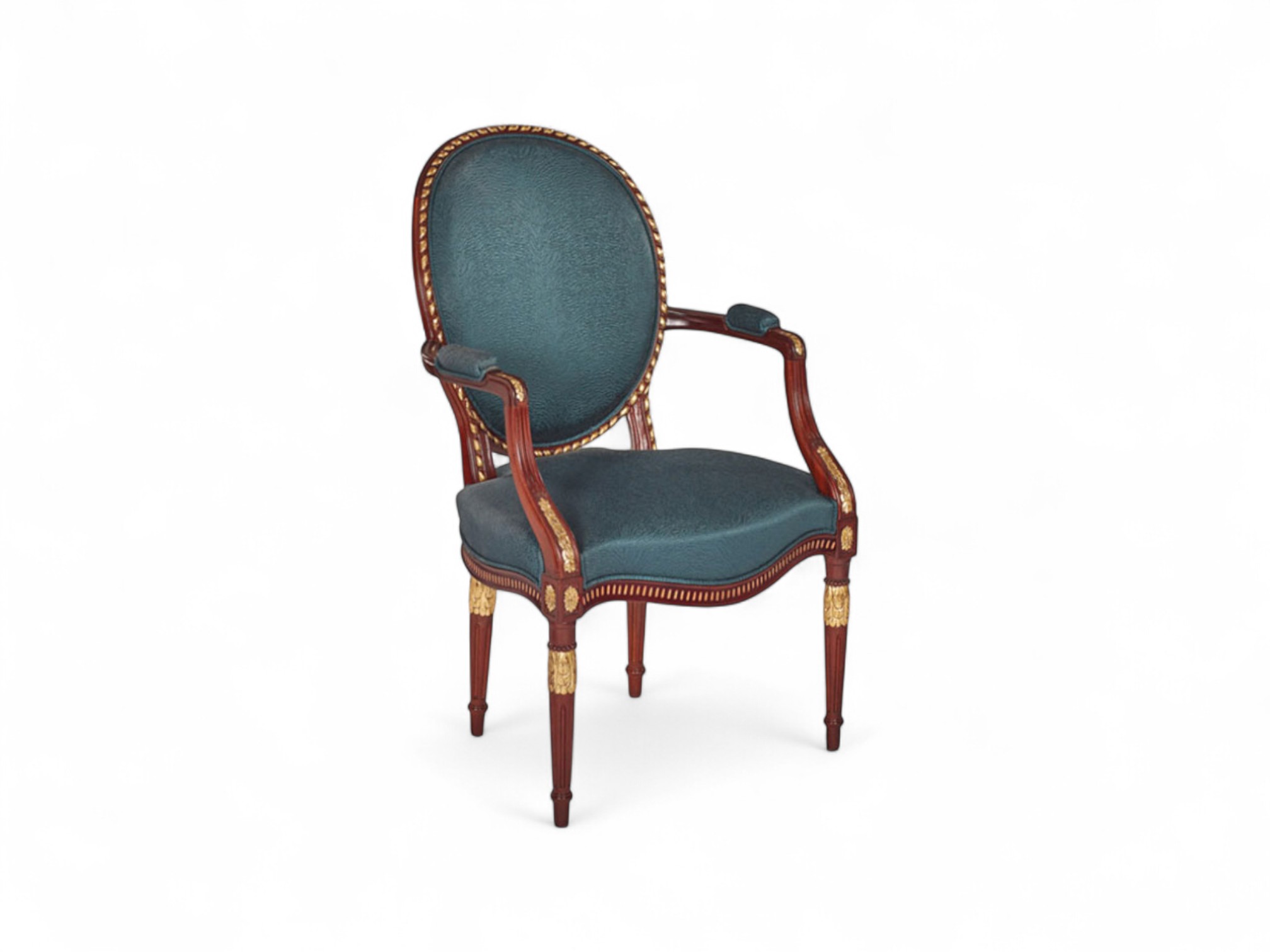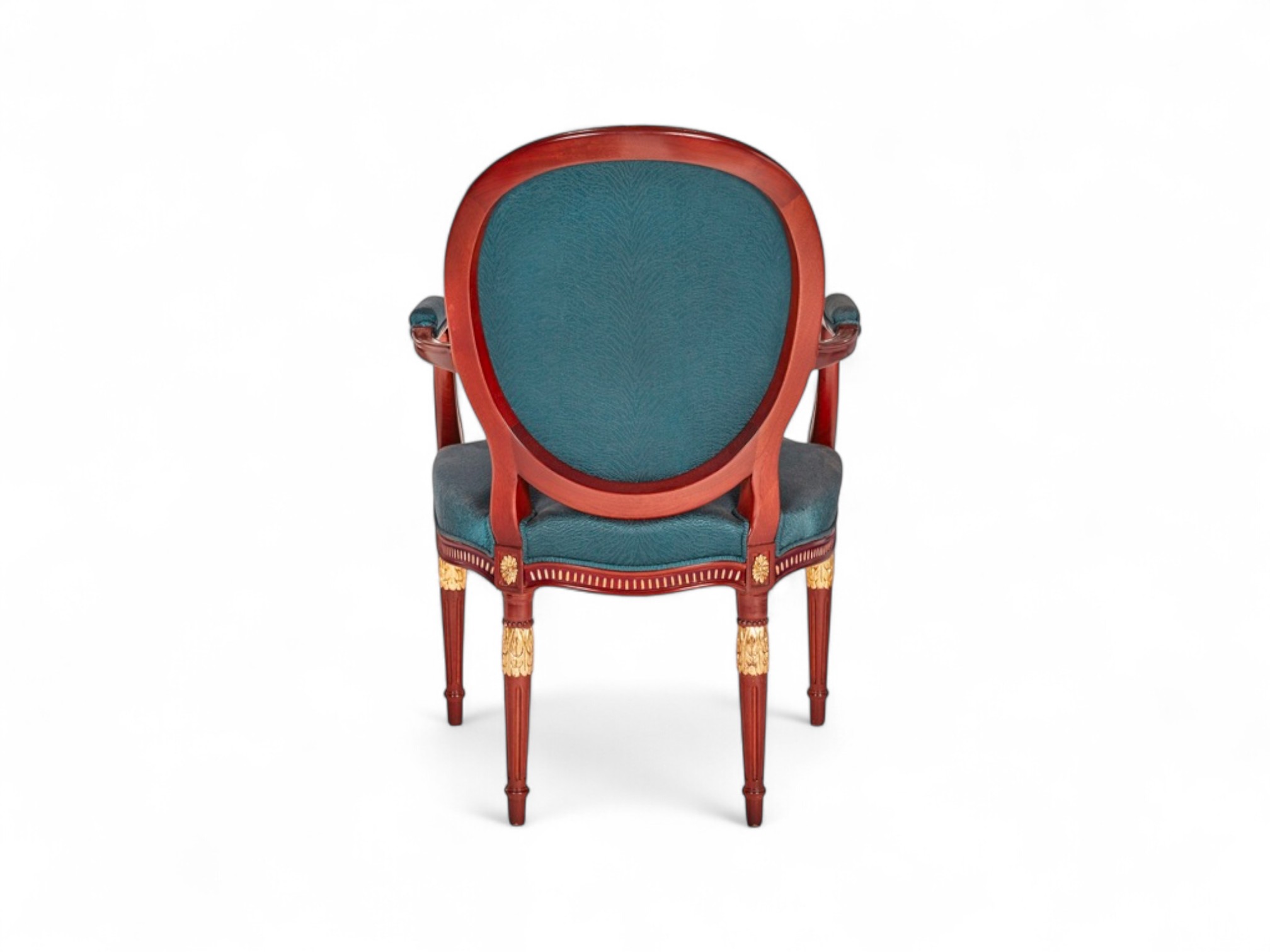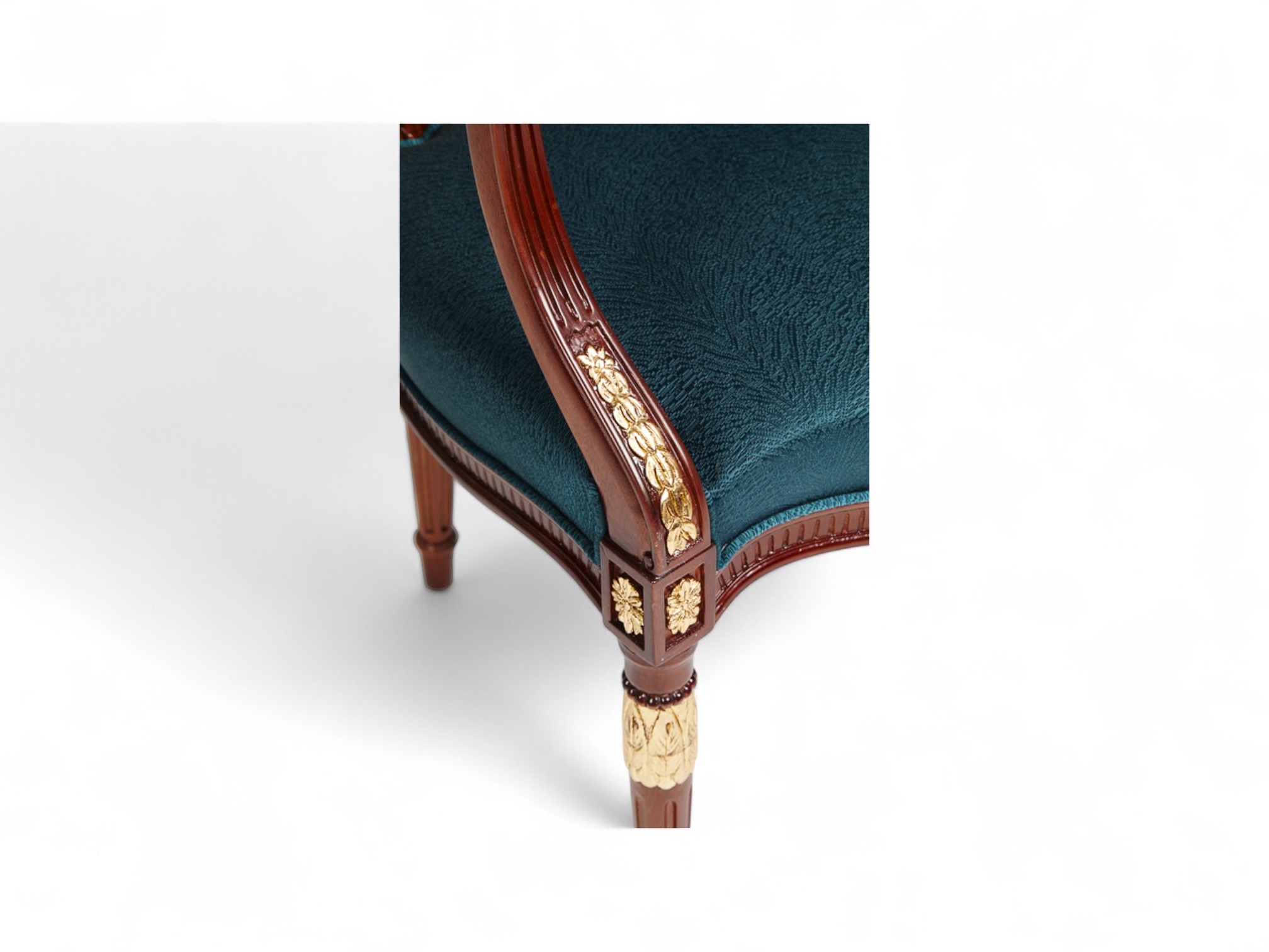 The Regal Teal Louis-Style Armchair brings historical elegance into the modern home. Its carved hardwood frame, finished in rich mahogany, features ornate gold detailing that elevates any classic or transitional space. Upholstered in deep teal fabric, this chair creates a refined contrast that captures attention without overwhelming the room.