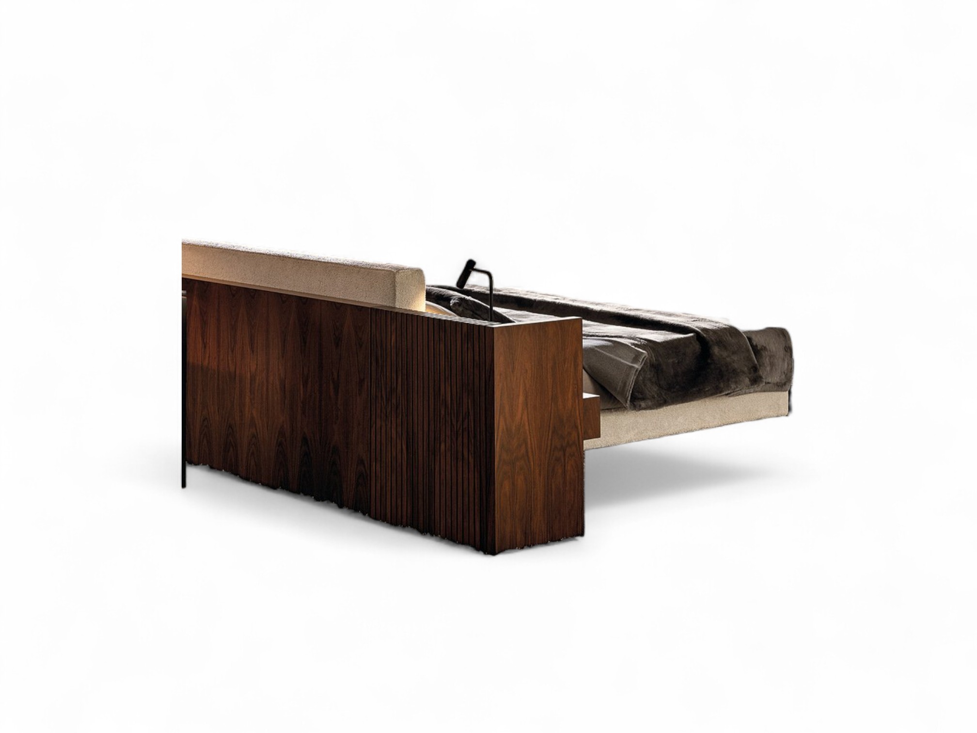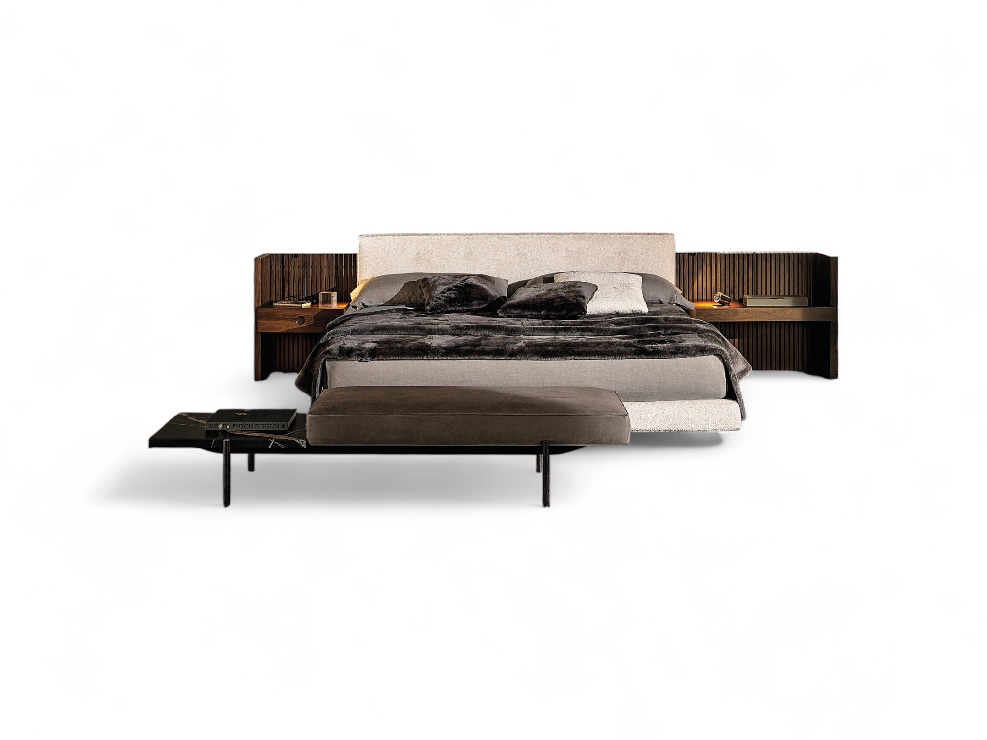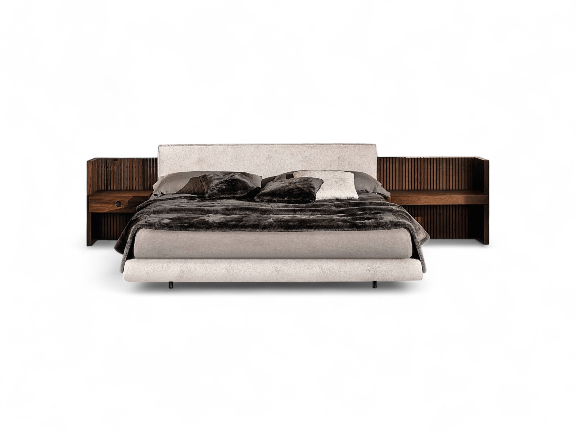 The Riviera Wide Headboard Bed is a seamless fusion of modern elegance and functional design. With its clean lines, low-profile silhouette, and refined detailing, it creates a luxurious focal point for contemporary interiors. The upholstered frame, paired with sleek wooden side panels, highlights a balance of warmth and sophistication.
