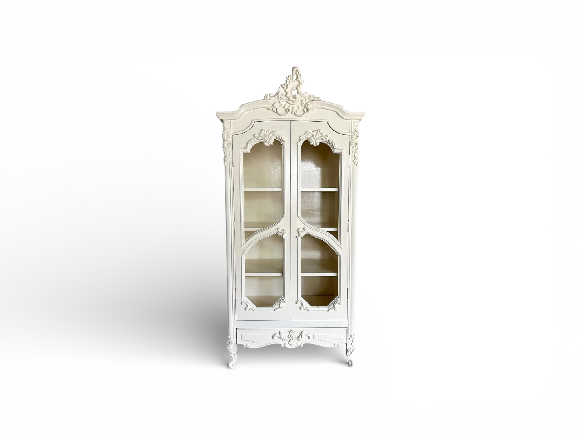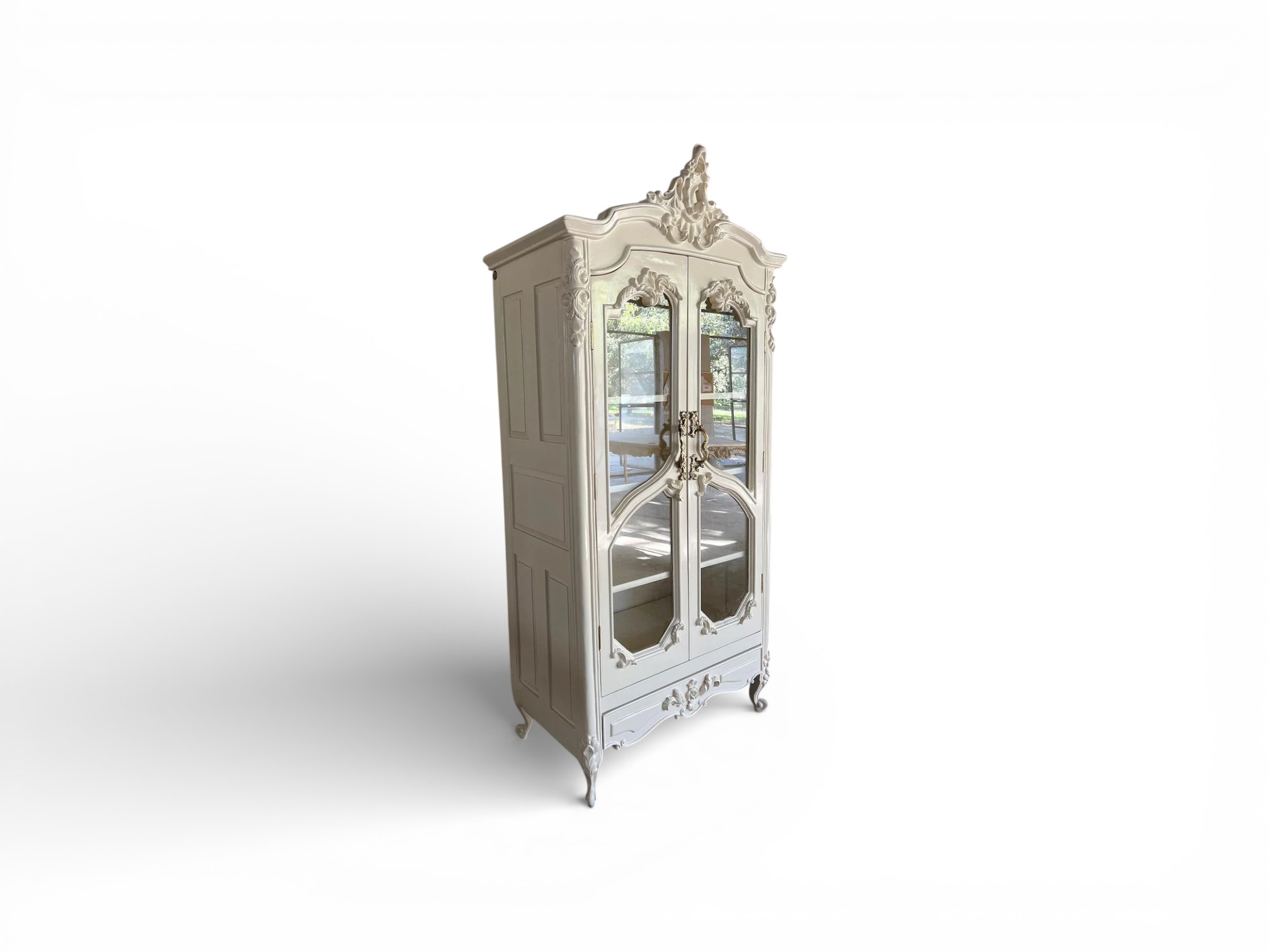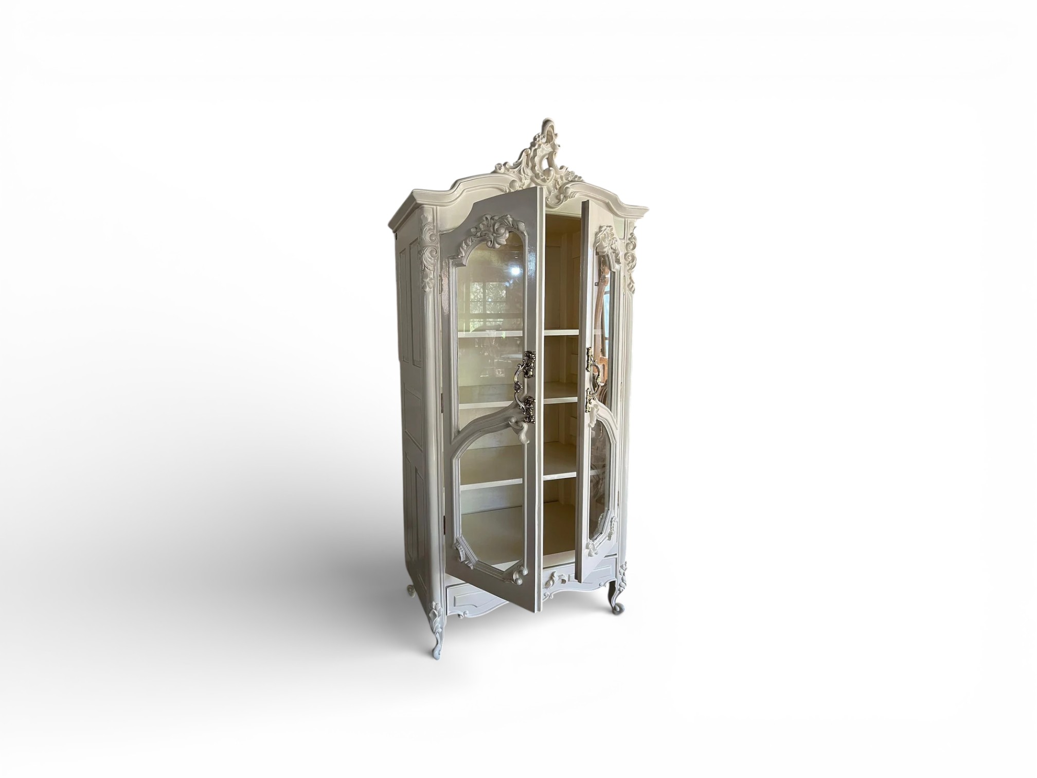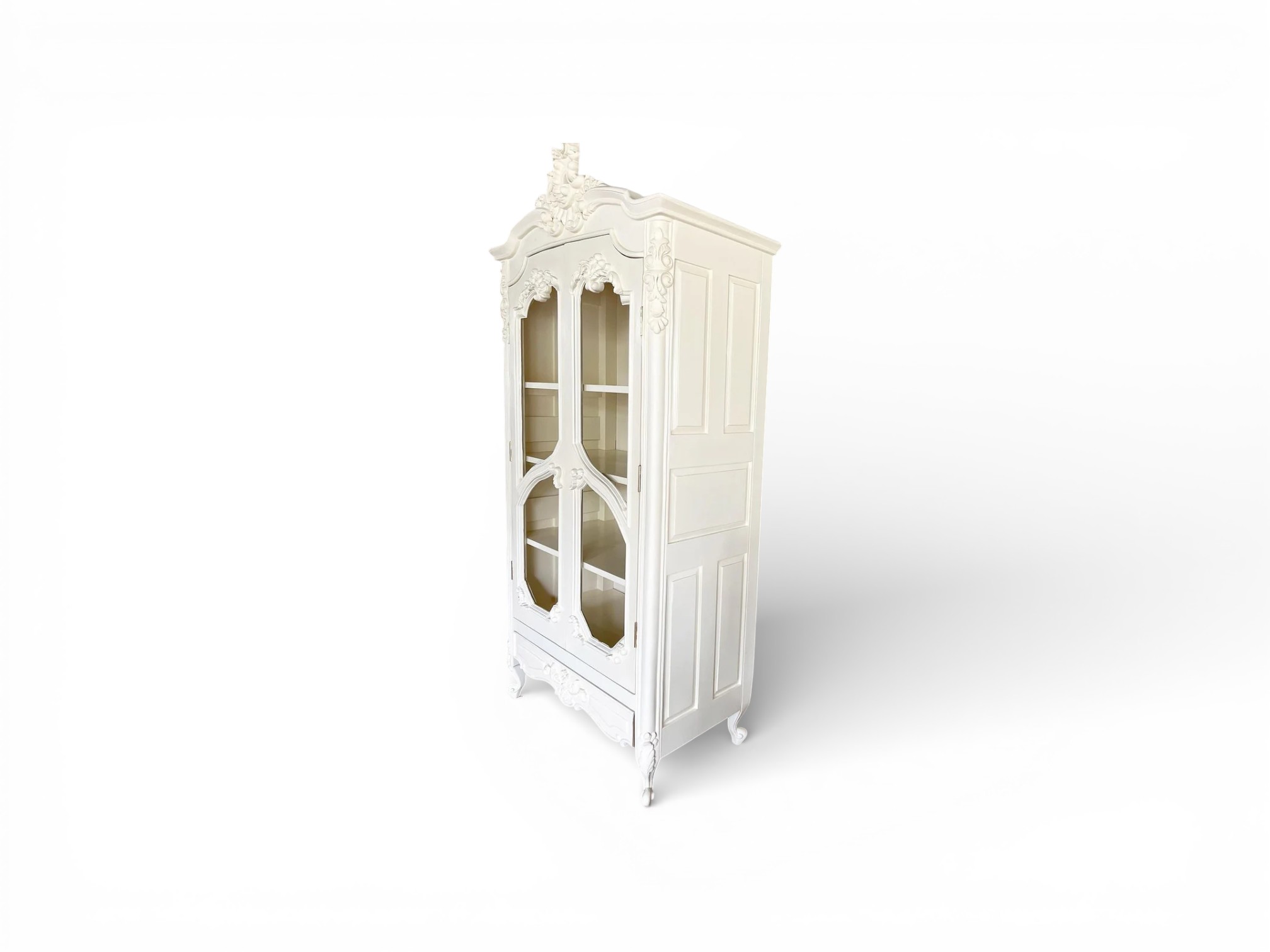 The Roselle Louis XV Armoire reflects timeless French elegance through its flowing Rococo curves, ornate carvings, and soft ivory finish. Inspired by classic Louis XV design, this piece brings refined luxury into bedrooms or dressing spaces while maintaining graceful proportions. The sculpted crown, delicately contoured glass-panelled doors, and curved legs create a harmonious silhouette that feels regal yet inviting.