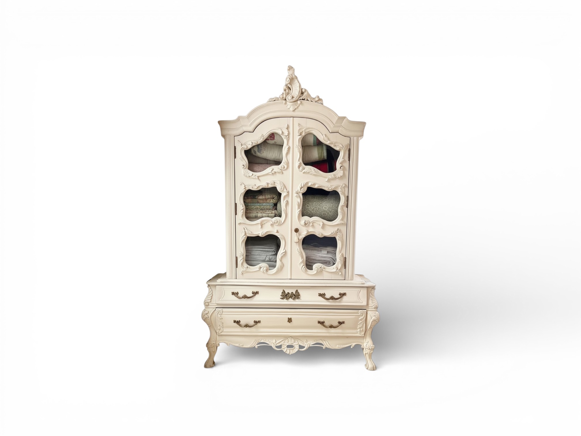 Crafted for both beauty and everyday practicality, this cabinet features a solid wooden structure designed for long-lasting durability. In addition, the spacious interior provides organised storage for linens, textiles, or curated décor, while the lower drawers offer concealed functionality. As a result, this design balances decorative artistry with dependable storage, making it a sophisticated addition to classic interiors.