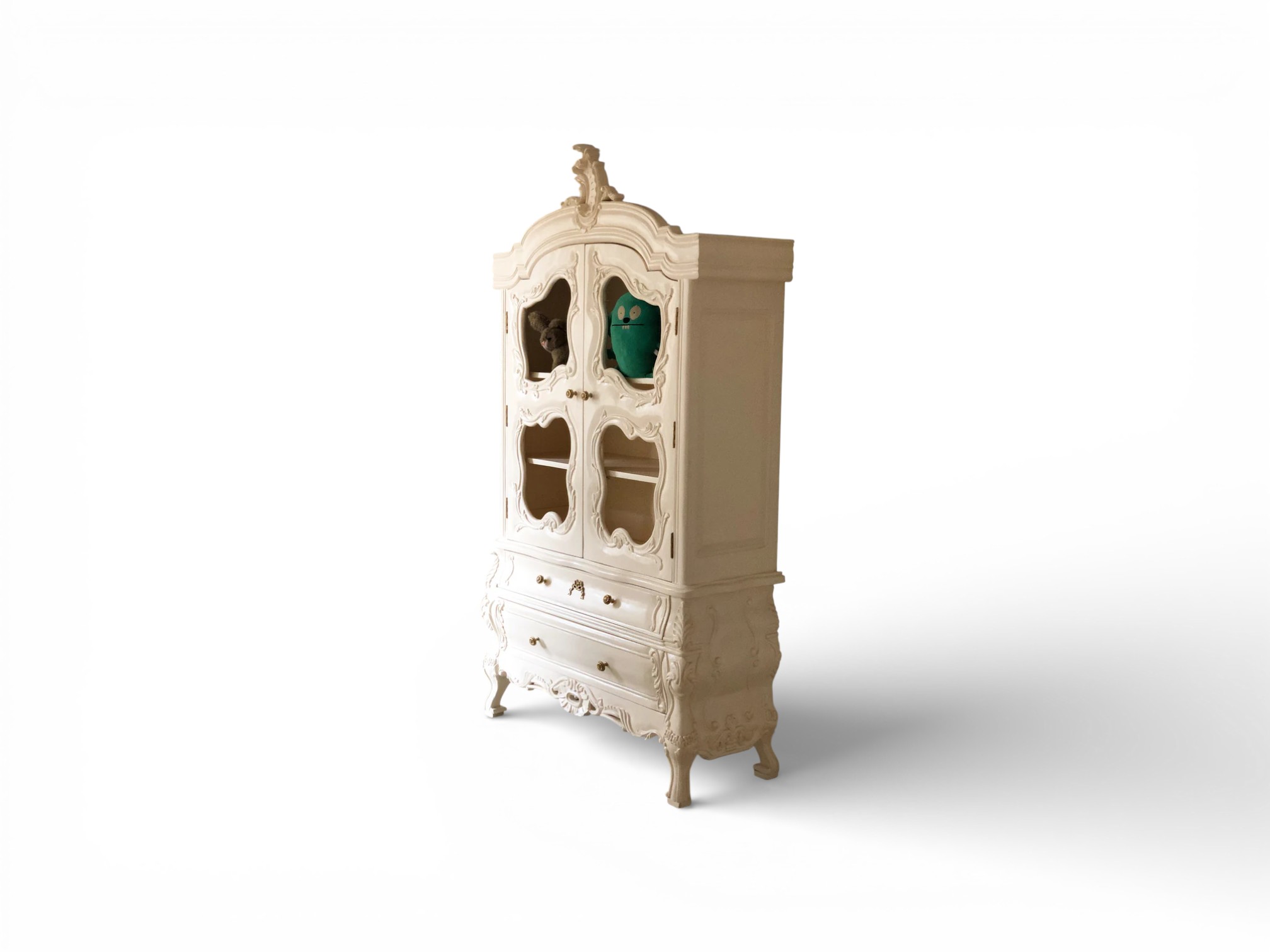 The Rosette Rococo Cabinet captures the romance of classic Rococo design with its flowing curves, ornate carvings, and soft ivory finish. Inspired by European heritage furniture, this piece creates a refined visual statement while maintaining graceful proportions. Moreover, the sculpted crest, delicately shaped glass panels, and elegant base detailing allow the Rosette Rococo Cabinet to elevate bedrooms, linen rooms, or formal living spaces with timeless charm.