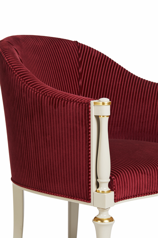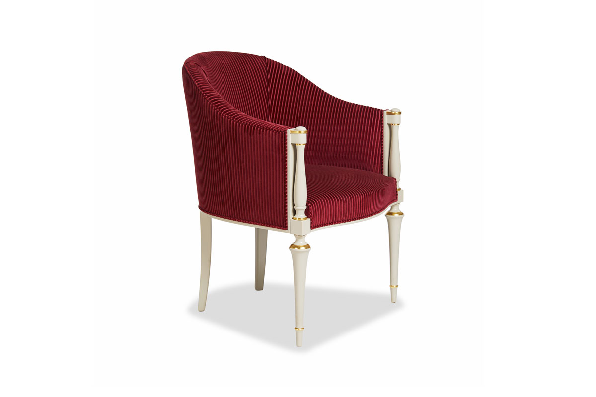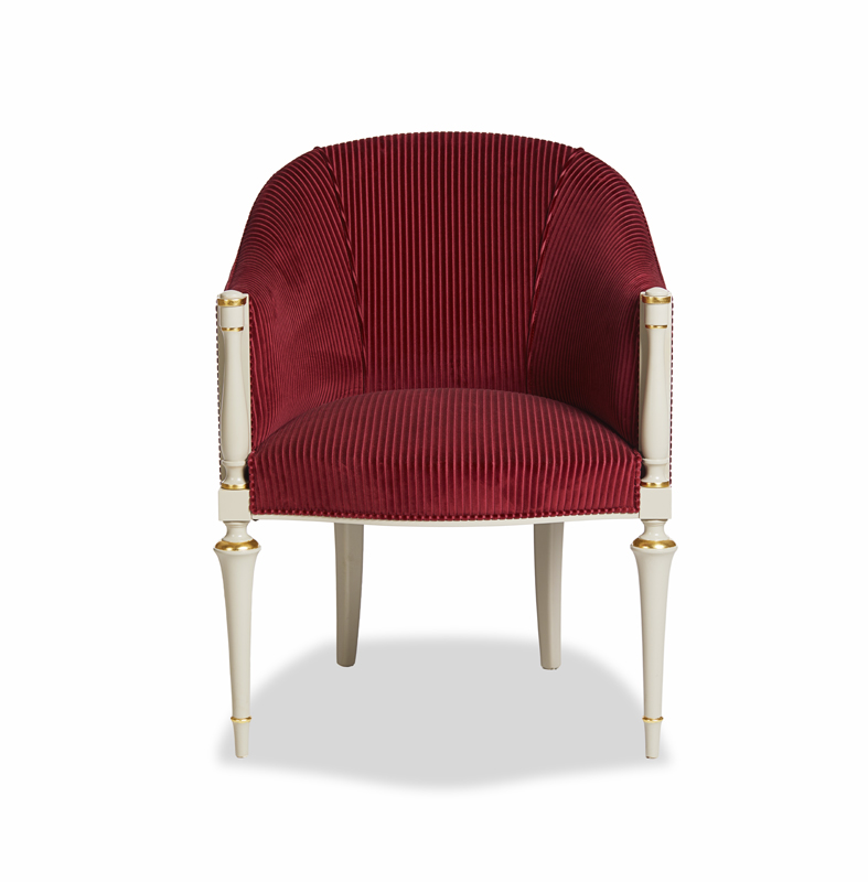 The Royal Barrel Chair brings a stately elegance to any interior with its graceful curves and richly textured upholstery. Wrapped in deep crimson corduroy velvet, this chair offers both visual drama and tactile charm. The barrel-shaped backrest flows seamlessly into the arms, creating an embracing silhouette, while the turned ivory-toned legs and gold accents add a refined classical touch.