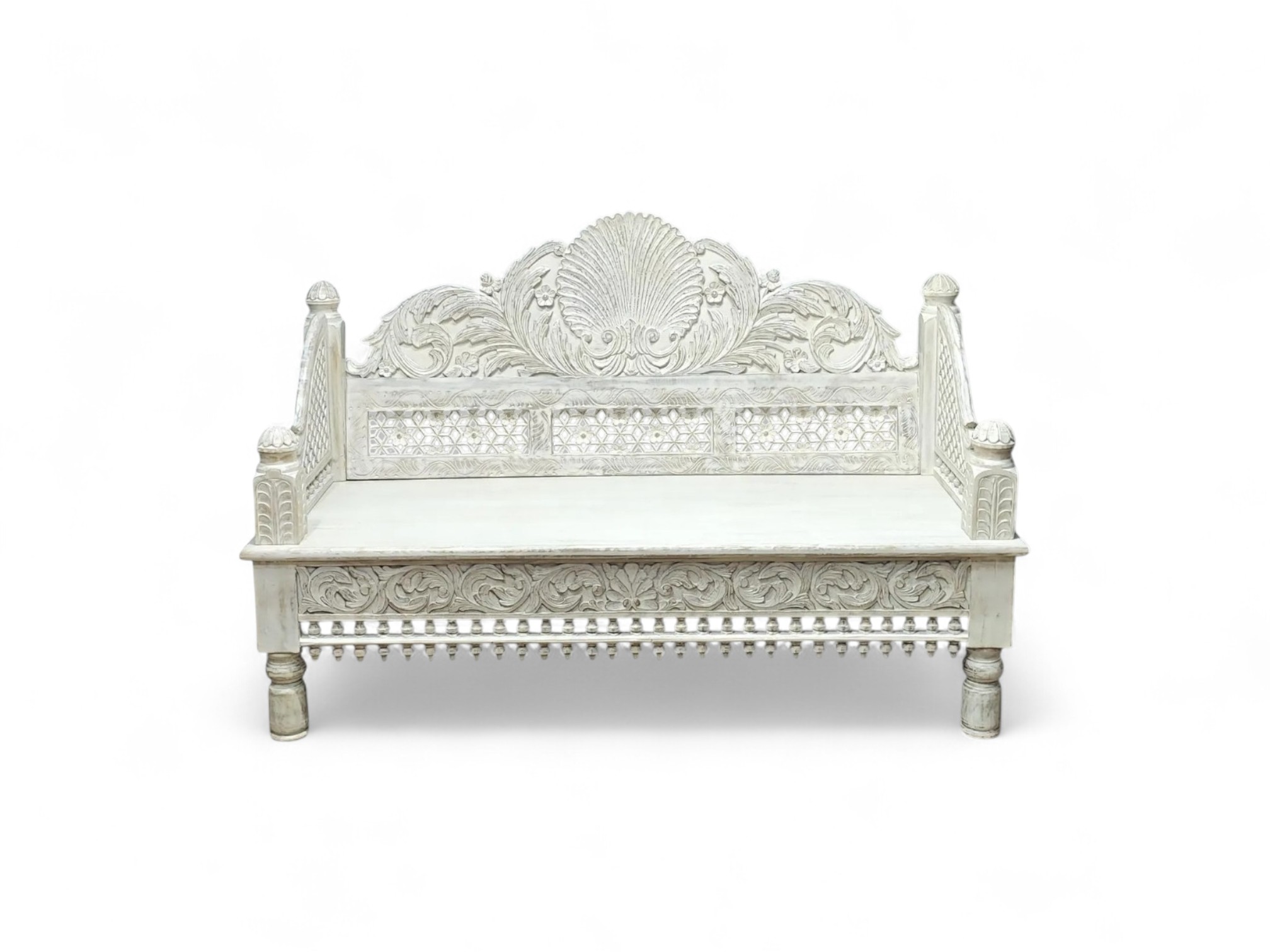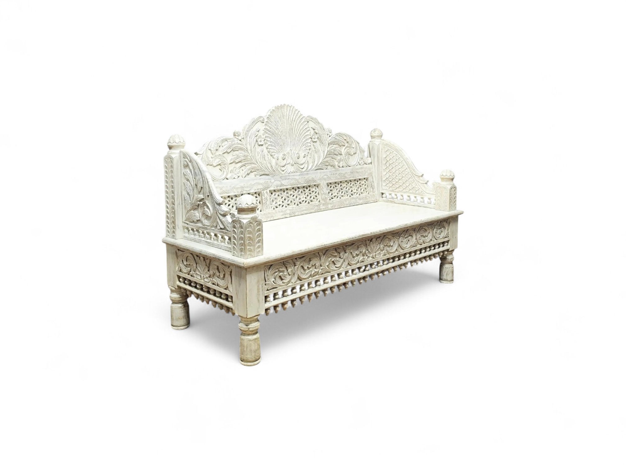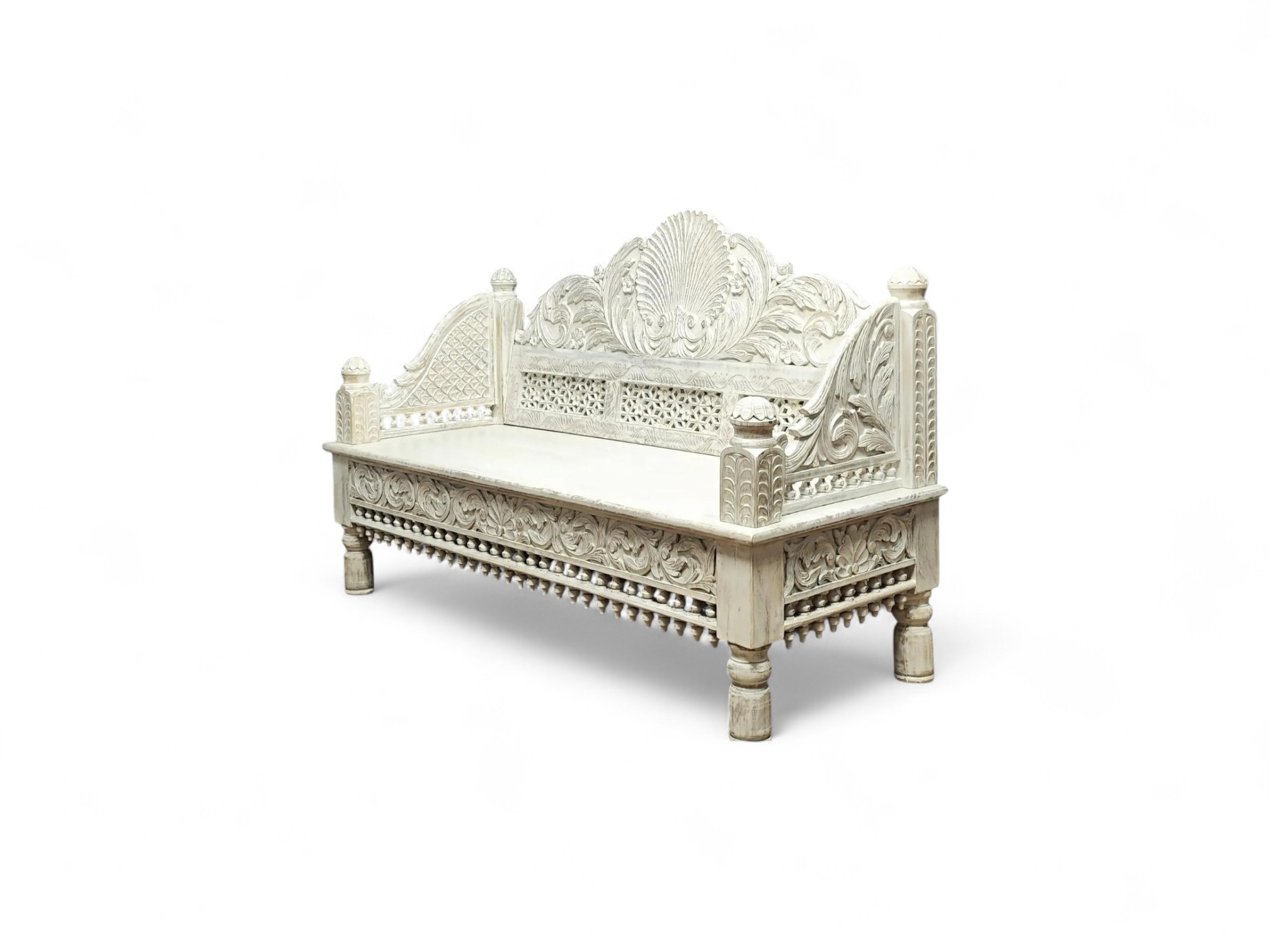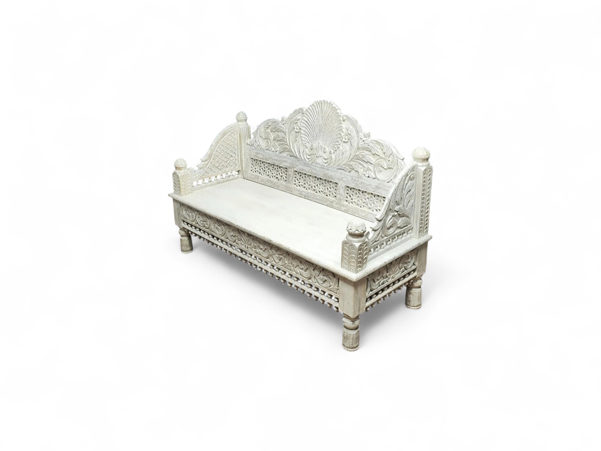 The Royal Maharaja Daybed is an embodiment of regal charm and craftsmanship, inspired by traditional Indian designs. This intricately carved daybed features a beautiful white finish that highlights the exquisite detailing on the wooden frame. The ornate carvings on the backrest, sides, and base reflect the royal artistry, making this daybed a statement piece that adds vintage elegance to any space.