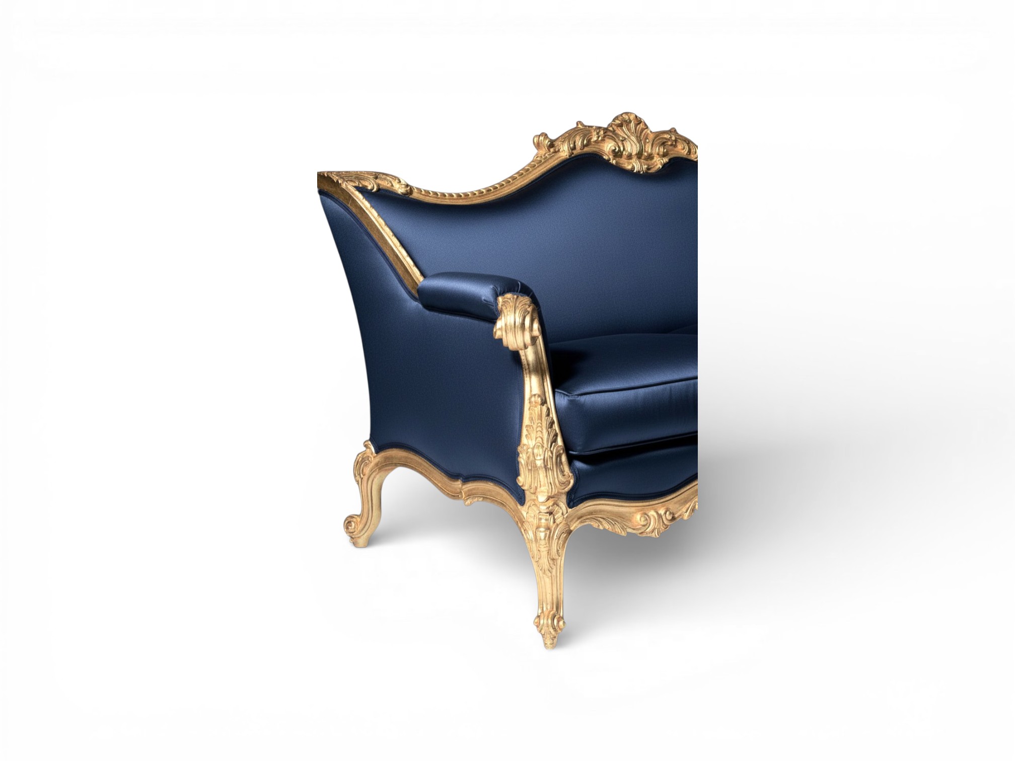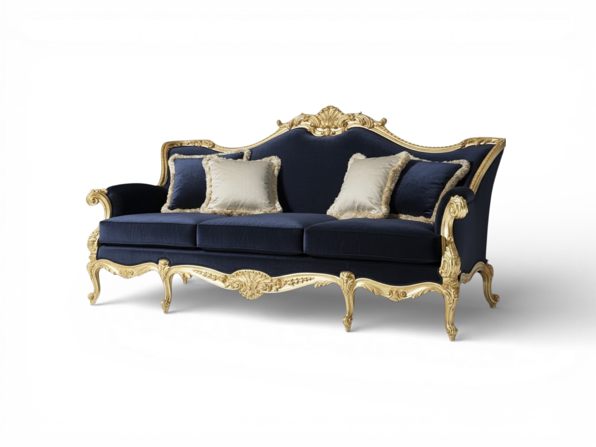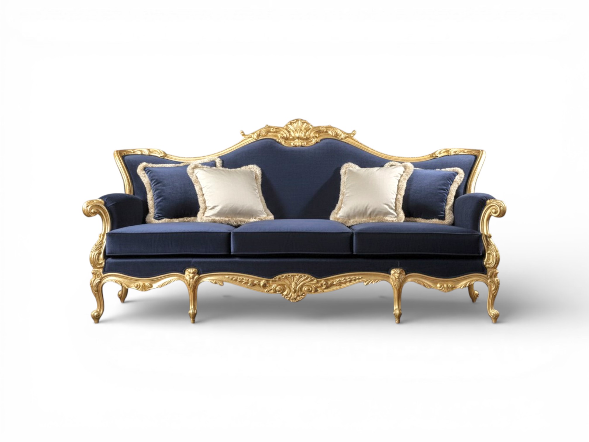 The Royale Throne Sofa expresses regal sophistication through its grand silhouette, deep navy velvet upholstery, and exquisitely carved hardwood frame finished in radiant gold. The sculpted crest rail and sweeping arms evoke the elegance of royal salons, while the plush cushions add refined comfort and visual richness. Moreover, the Royale Throne Sofa transforms luxury living rooms into statement interiors with its commanding palace-inspired presence.