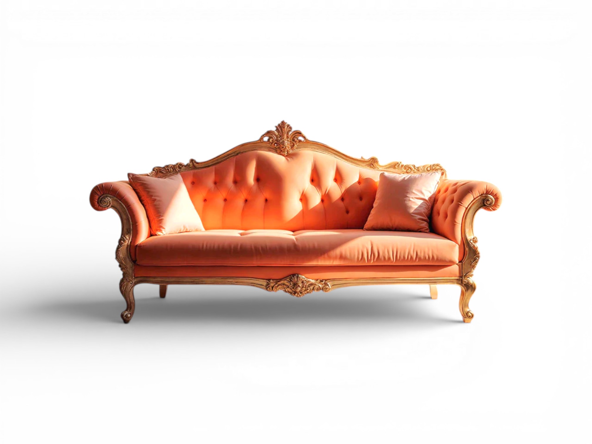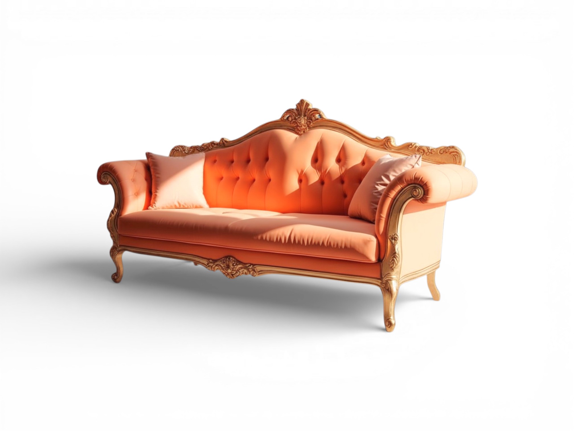 The Saffron Sovereign Carved Sofa showcases regal elegance through vibrant saffron velvet upholstery and a beautifully hand-carved hardwood frame finished in warm antique gold. The gracefully tufted backrest enhances the royal silhouette, while the sculpted crest rail adds architectural depth. Moreover, the sweeping scroll arms create a refined palace-inspired presence. As a result, Saffron Sovereign Carved Sofa becomes a striking centrepiece for luxury living rooms and classic interiors.