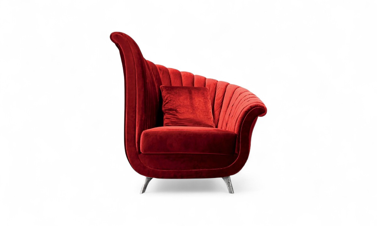 The Scarlet Majesty Armchair embodies grandeur and sophistication, crafted for those who value artistic design and luxurious comfort. Its dramatic winged silhouette, sculpted curves, and rich scarlet velvet upholstery create a striking focal point in any space. The vertically channelled backrest enhances its visual depth while ensuring lasting comfort and support.