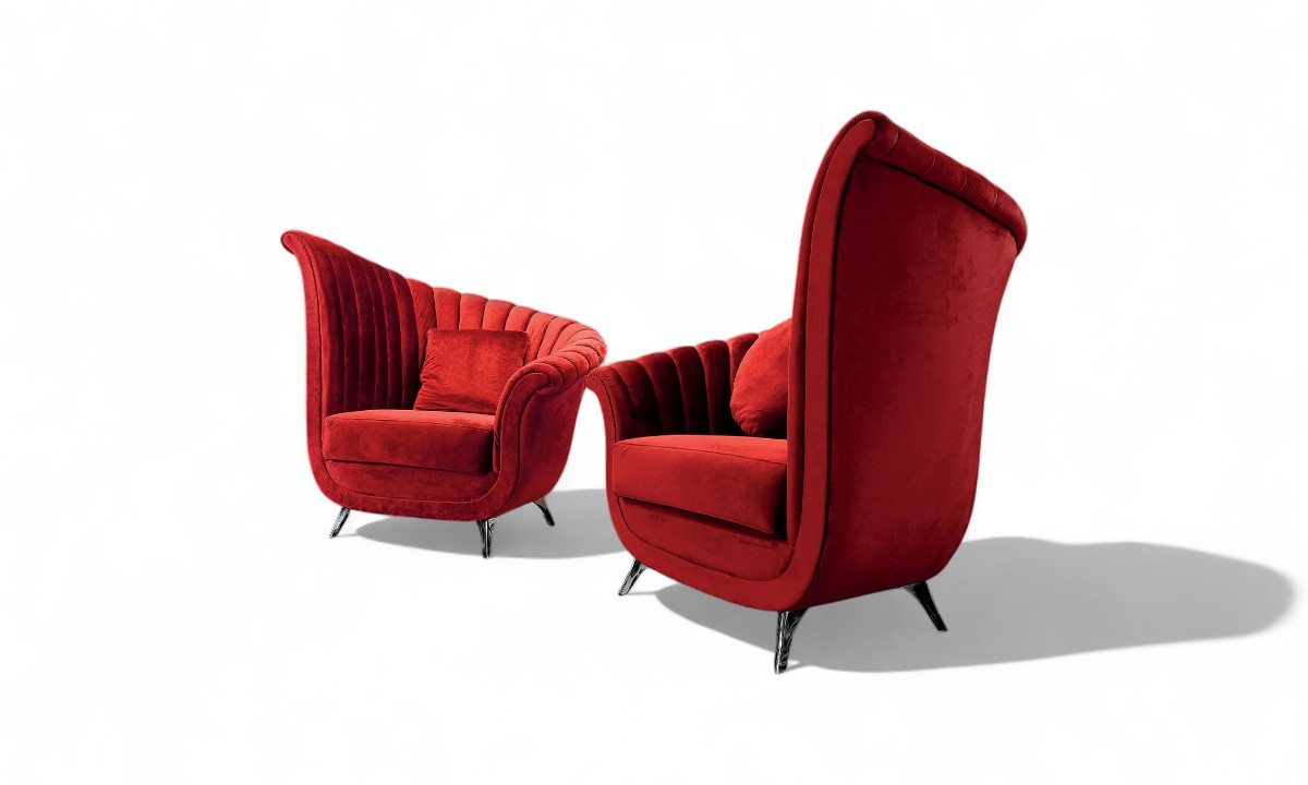 Supported by sleek metallic legs, the Scarlet Majesty Armchair achieves the perfect blend of elegance and stability. The generously cushioned seat and matching accent pillow provide superior relaxation, making it an ideal choice for high-end living rooms, luxury lounges, or statement interiors where bold design takes centre stage.