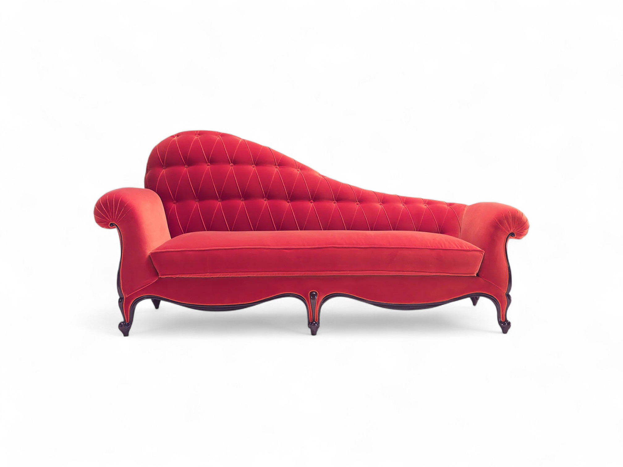 The Scarlet Royale Chaise Lounge is an opulent statement piece designed to bring drama and elegance to any space. Its vivid scarlet velvet upholstery and diamond-tufted backrest exude luxury, while the sweeping silhouette creates a regal and inviting presence. The rolled arms and gently curved legs enhance its traditional charm, making it a centrepiece in both classic and eclectic interiors.