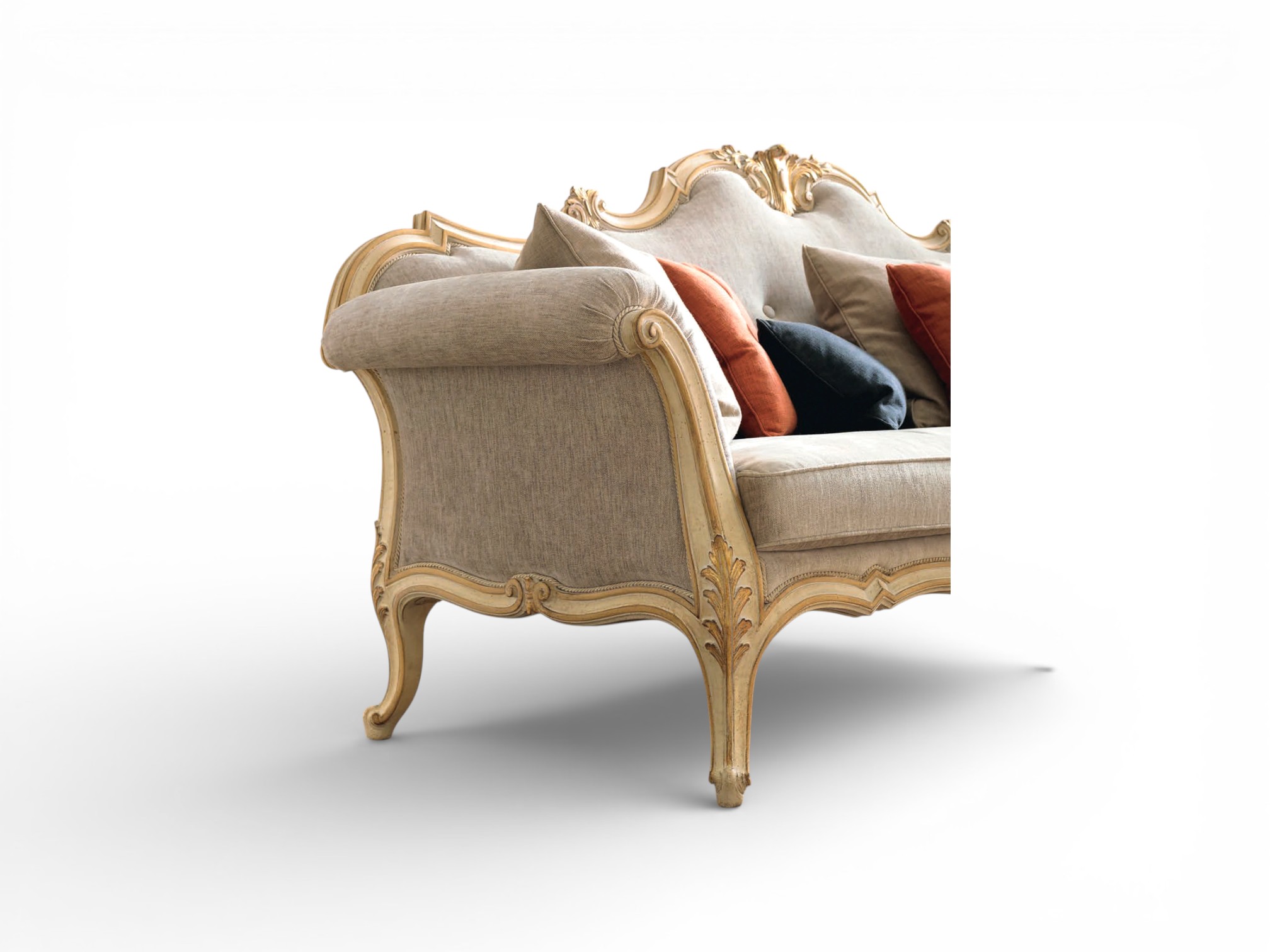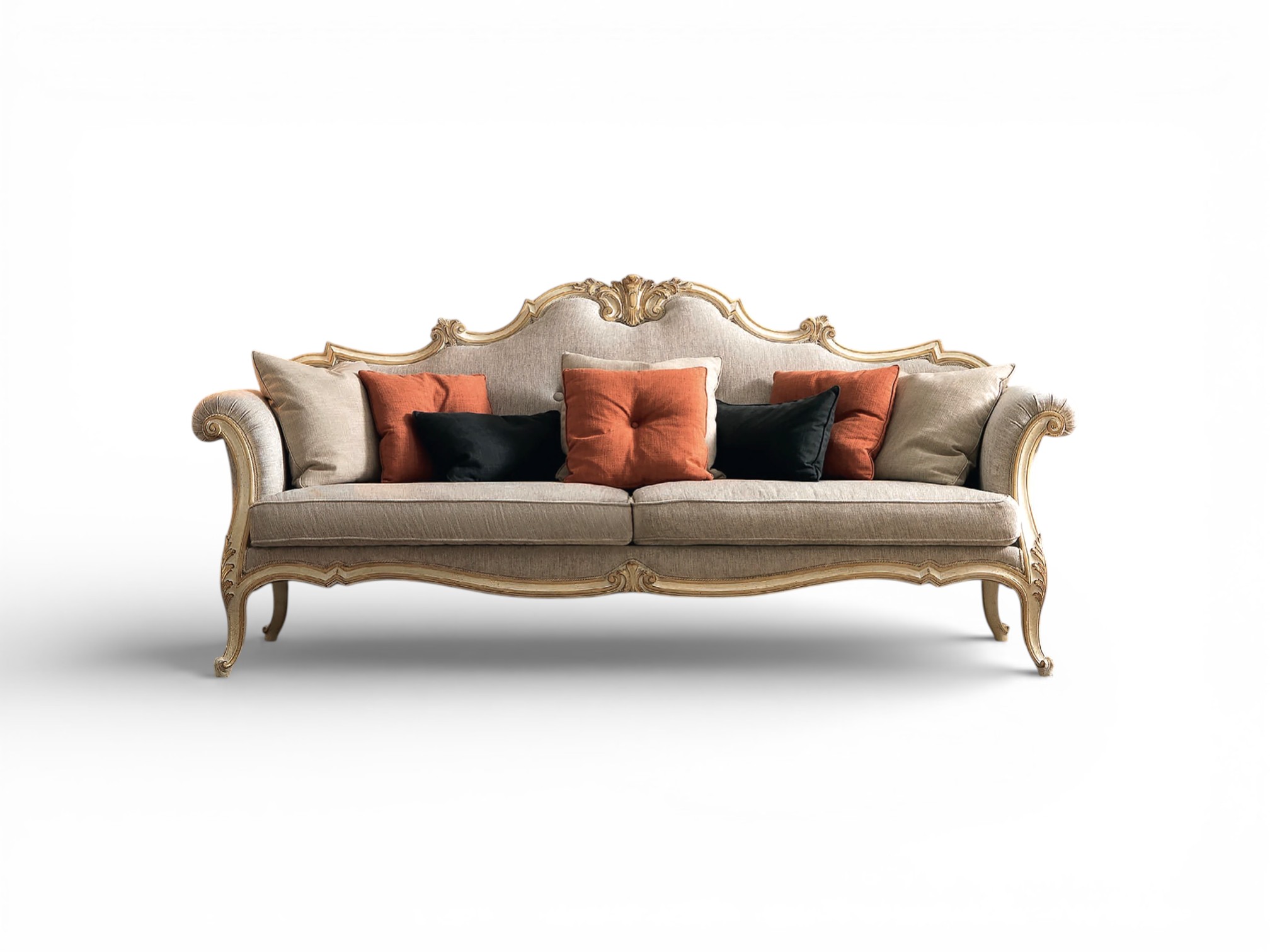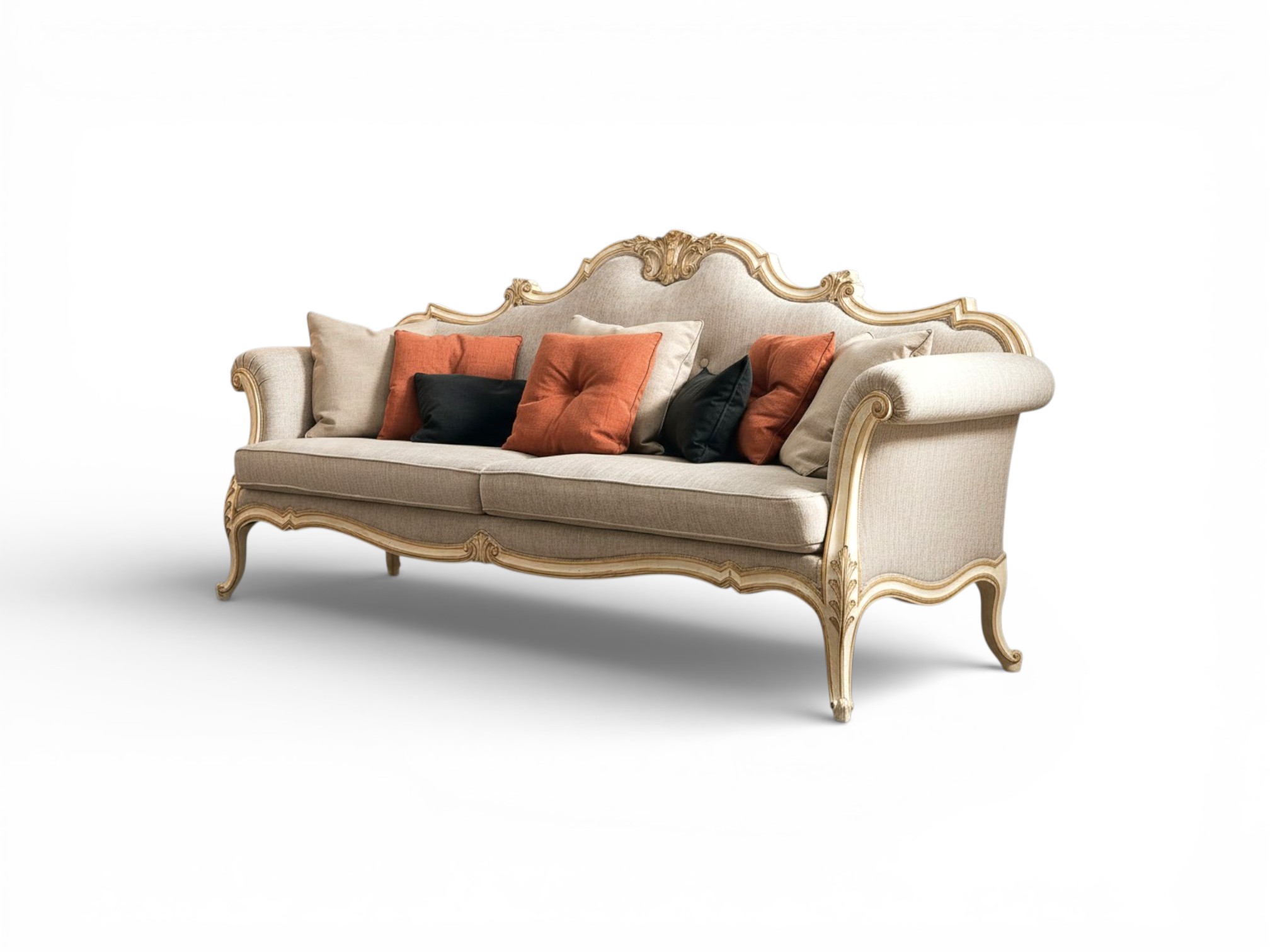 Skilled artisans shape the solid hardwood frame with intricate detailing and carefully finished contours that emphasise the sofa’s regal character. Plush seat cushions and supportive back padding provide exceptional comfort for everyday lounging, while the slender curved legs add a sense of lightness and elegance. Additionally, the reinforced internal structure ensures durability and stability, therefore making it an ideal centrepiece for refined salons, villas, and luxury residences.