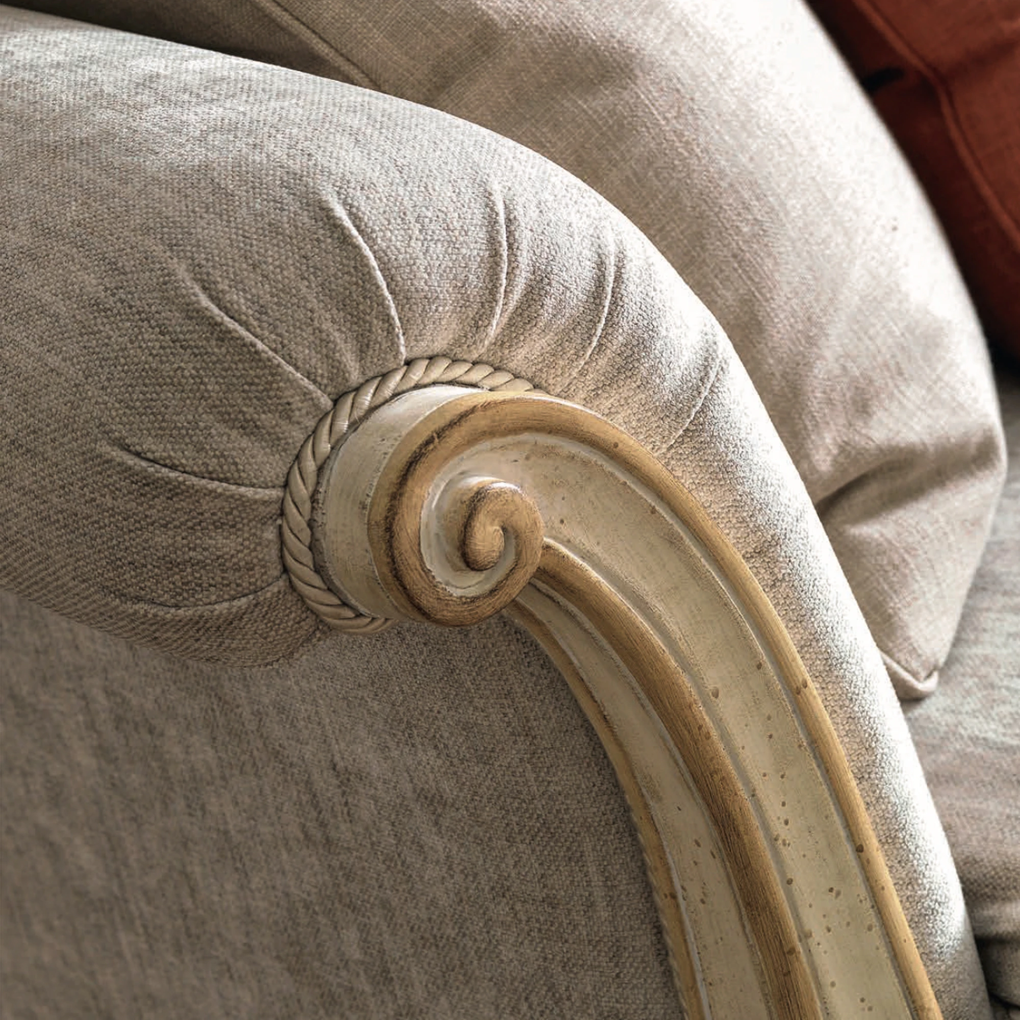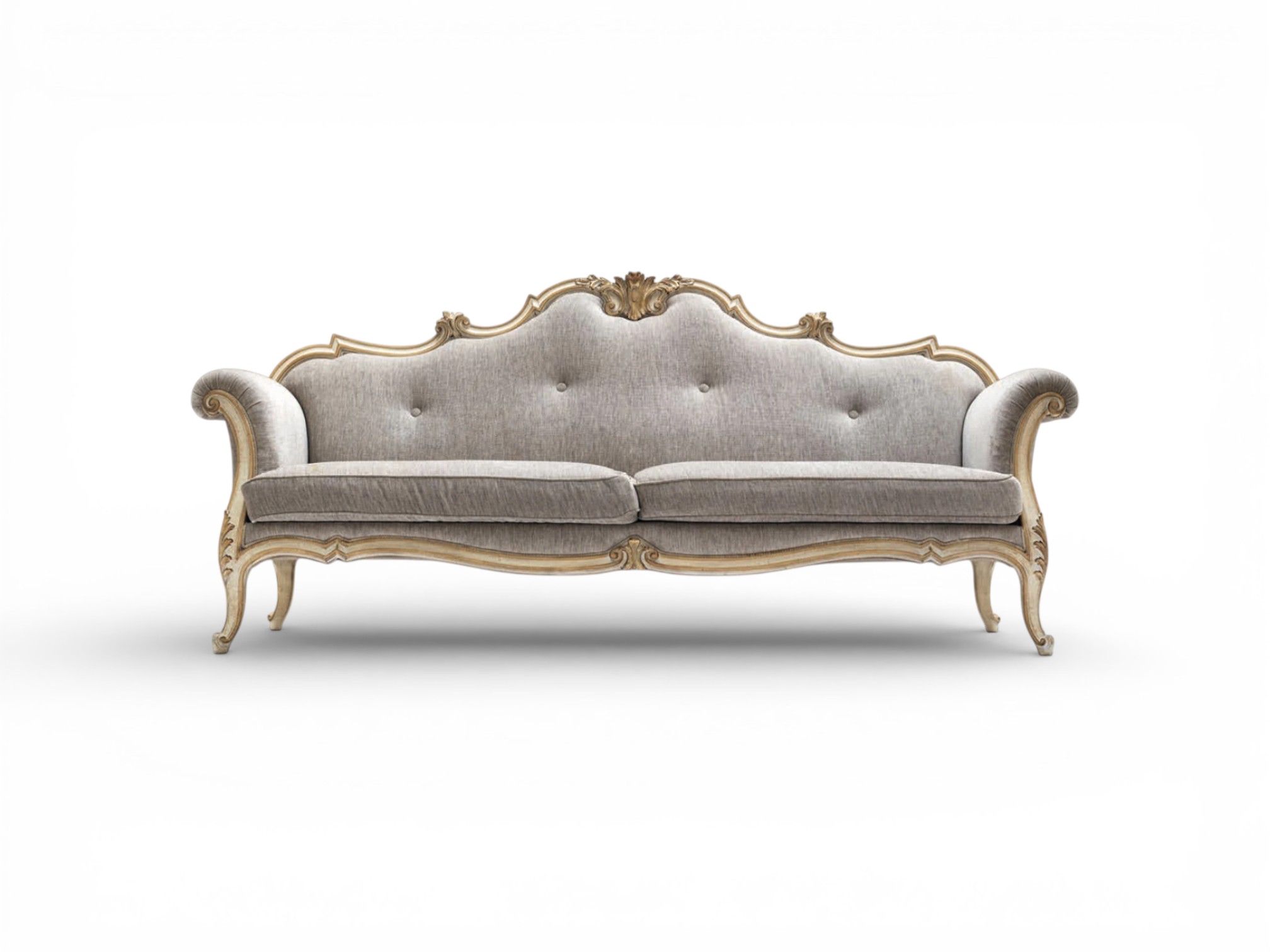 Valmonti Estate Sofa reflects refined Italian elegance through its graceful silhouette, hand-carved hardwood frame, and softly upholstered seating. The sculpted crest rail and delicate carvings highlight classical artistry, while the warm neutral upholstery introduces understated sophistication. Moreover, the Valmonti Estate Sofa enhances luxurious interiors with timeless charm and balanced proportions suited for elegant living spaces.