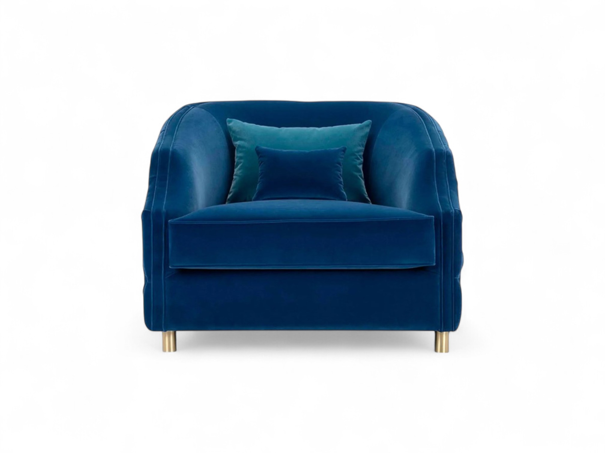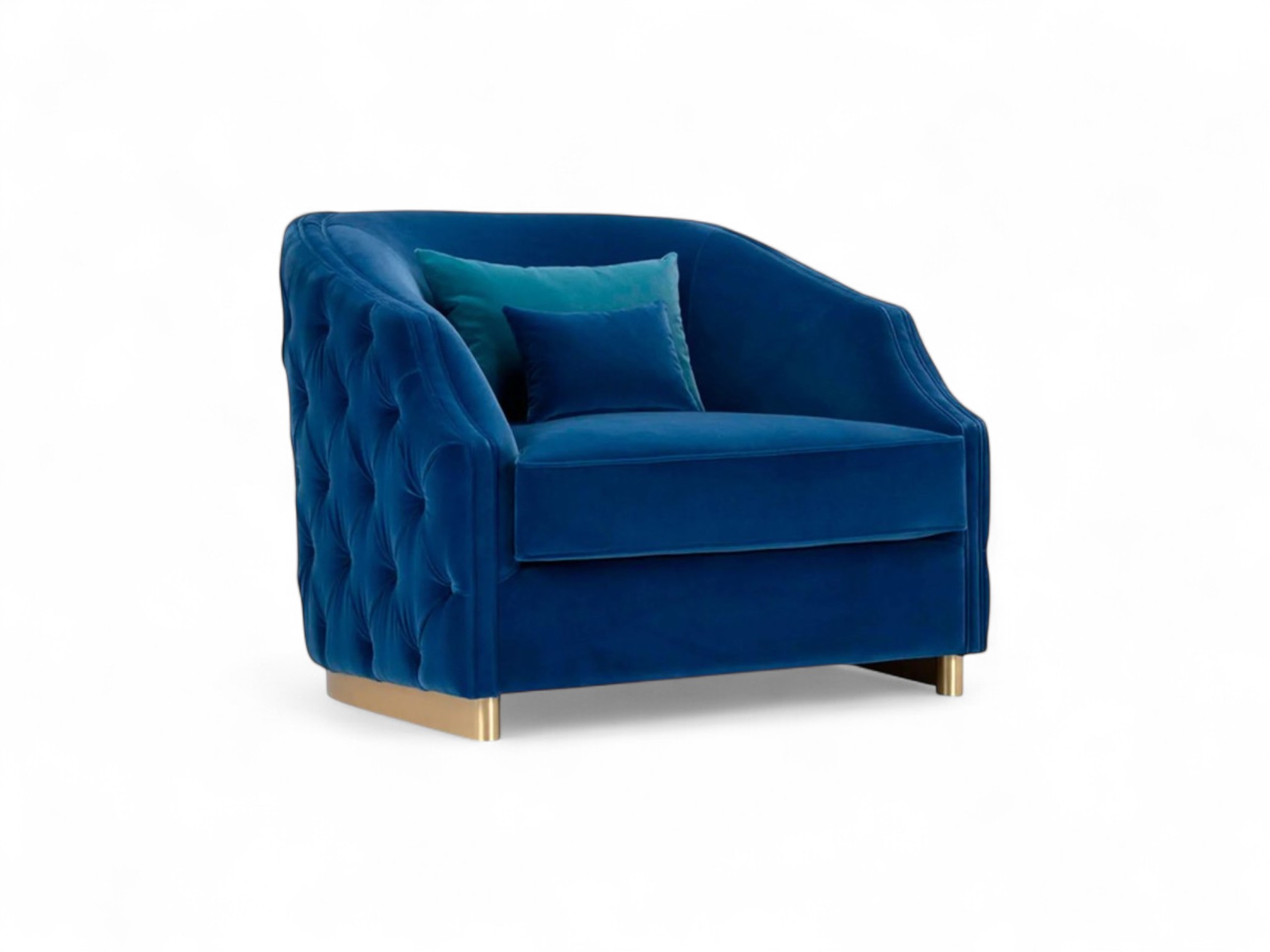 The Velvet Royalty Armchair is the epitome of sophistication, blending opulence with comfort. Upholstered in a striking deep blue velvet, it offers a lavish touch to any space while providing unparalleled relaxation. The tufted backrest and elegant gold metal legs create a perfect balance of classic design and modern appeal, making it a statement piece for contemporary interiors.