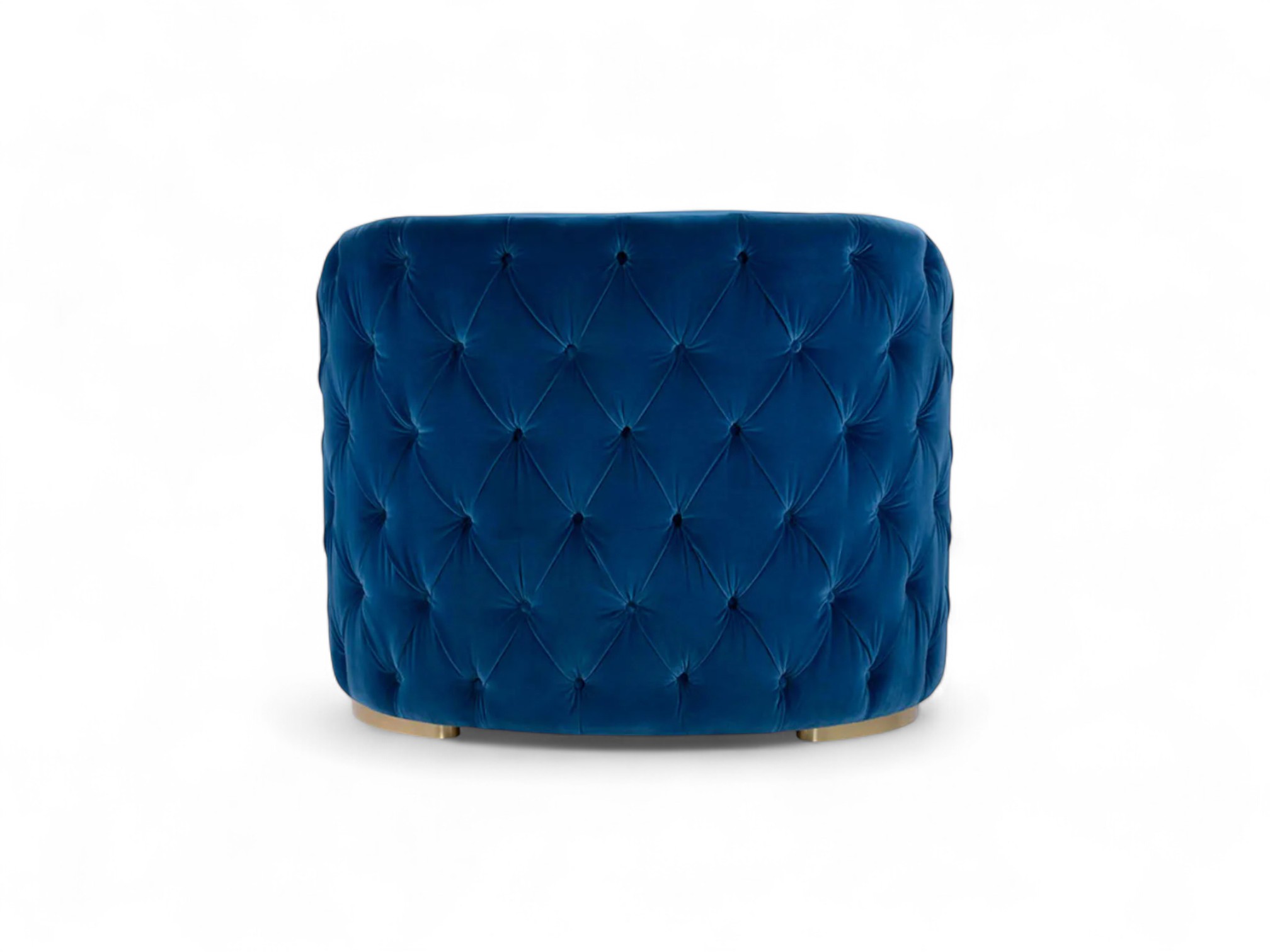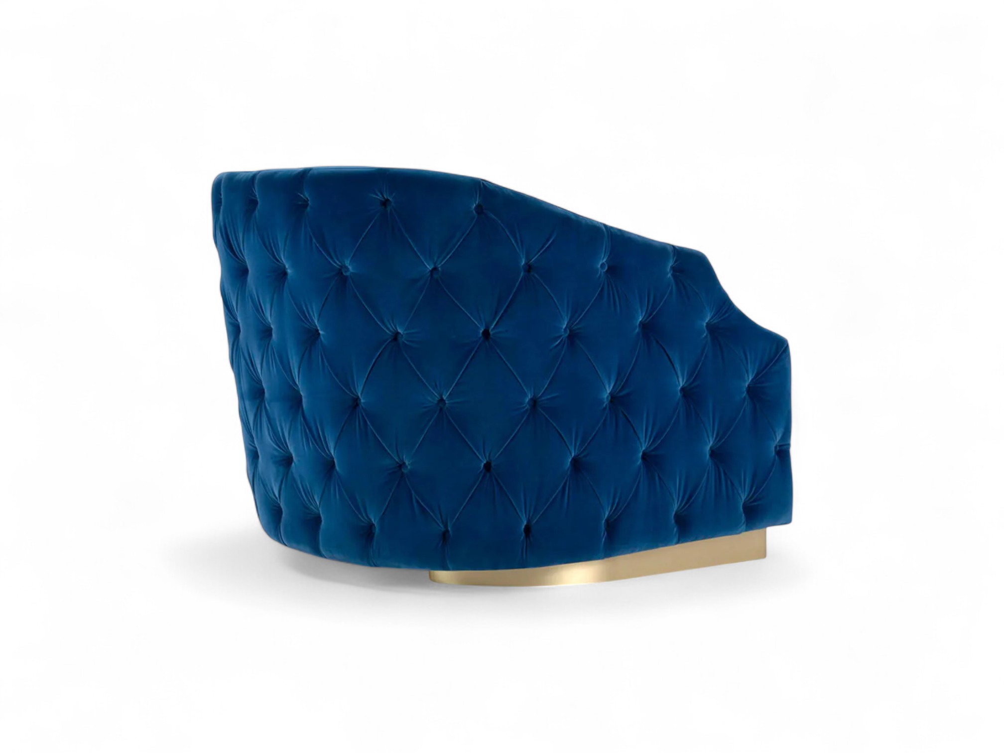 Design: Elegant deep blue velvet with tufted backrest and gold metal legs