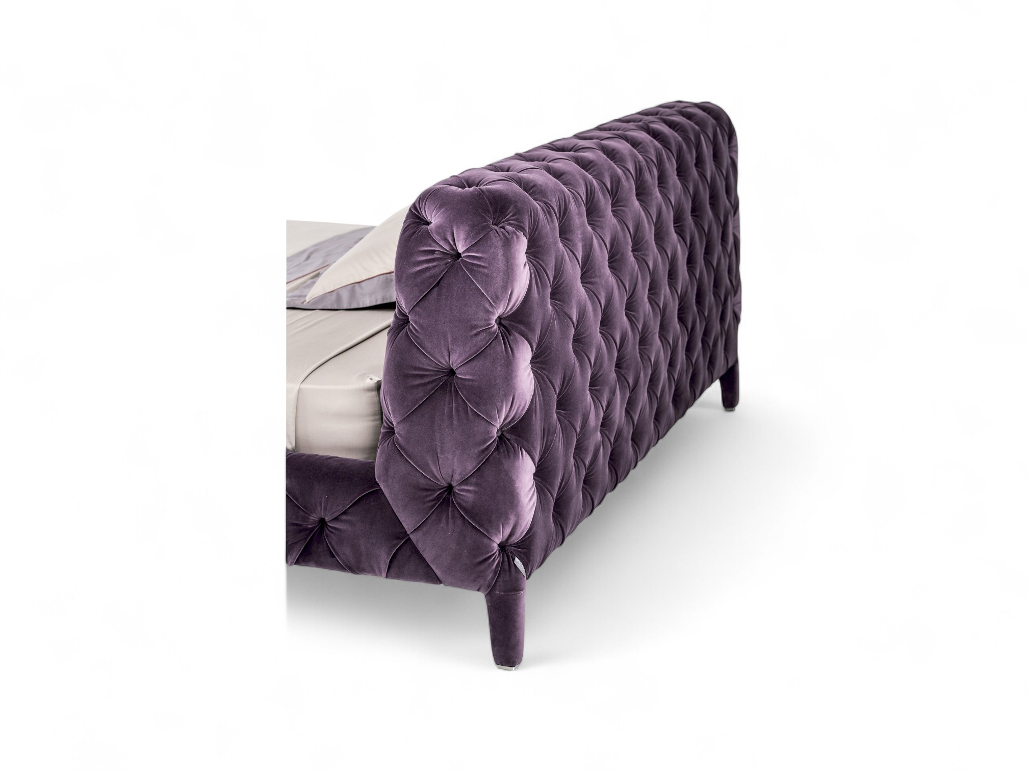 Design: Fully tufted velvet bed with an elegantly curved silhouette.