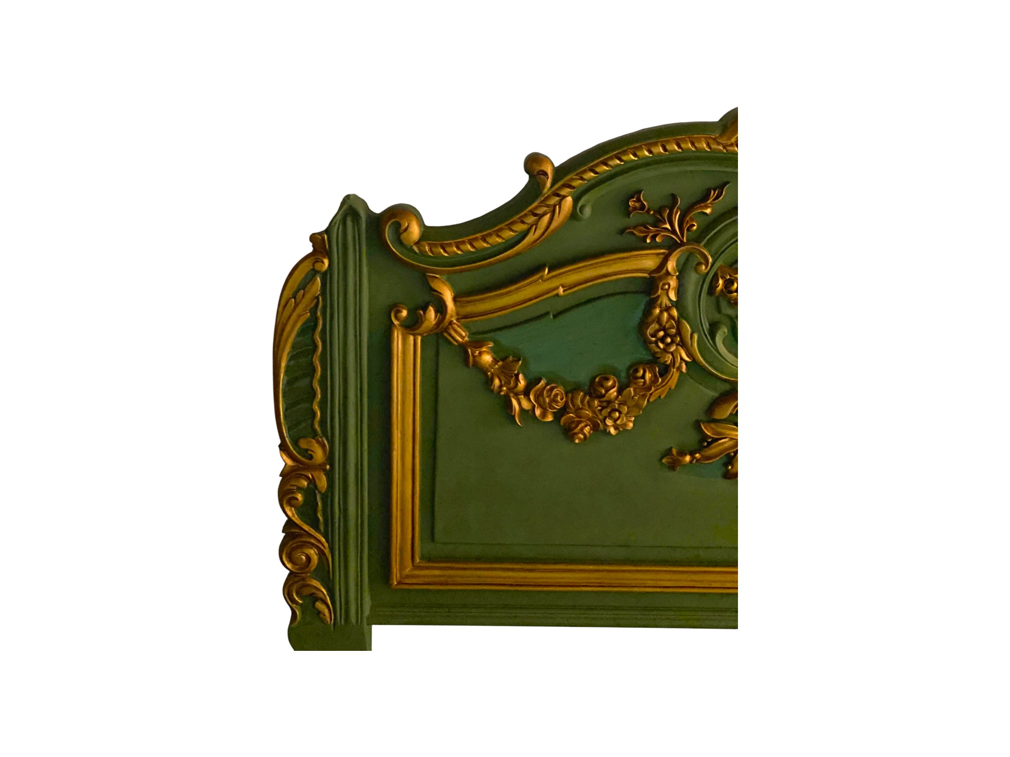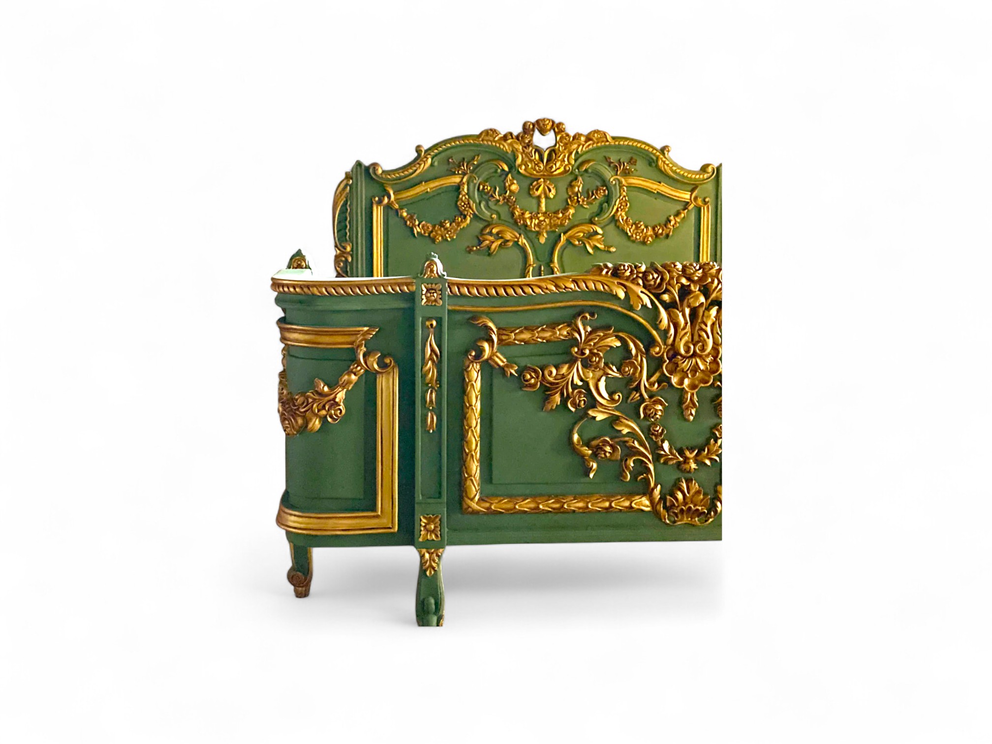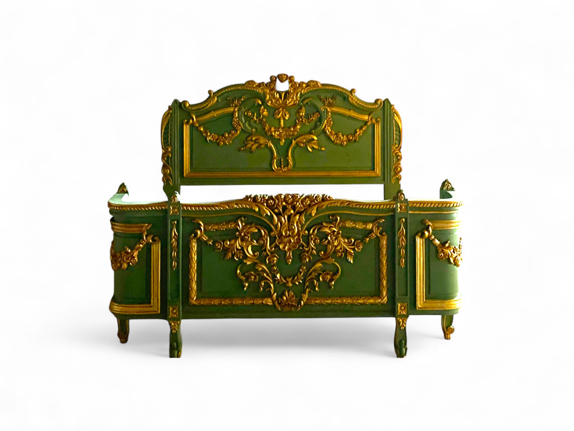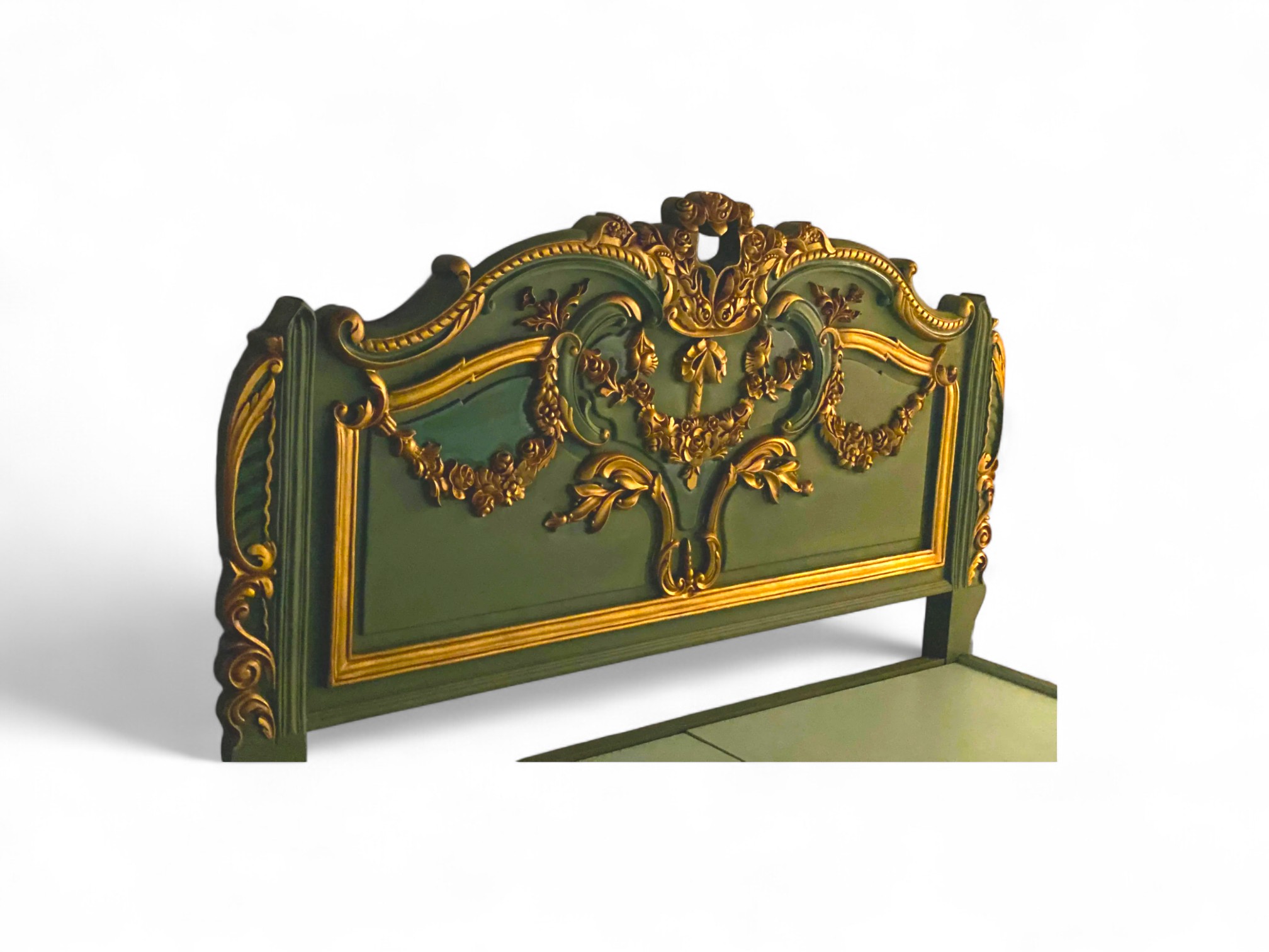 The Verde Royale Bed brings opulent grandeur to life with its rich emerald finish and gilded Baroque carvings. Inspired by classical European interiors, its sweeping crest and ornate scrollwork are all hand-carved, showcasing masterful craftsmanship. Gold leaf detailing catches the light with elegance, contrasting beautifully against the deep green frame.