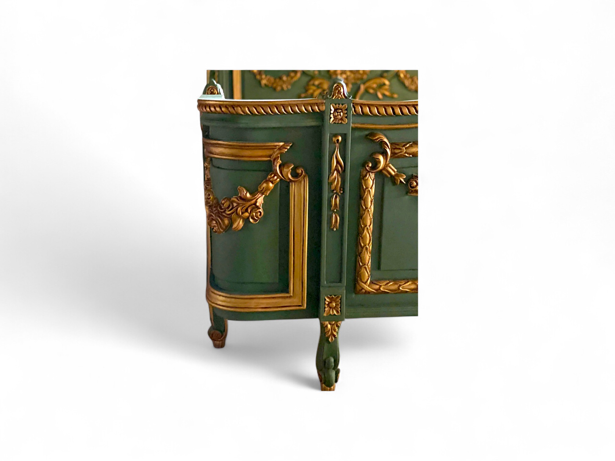 Finish: Deep emerald green with hand-applied antique gold detailing throughout.