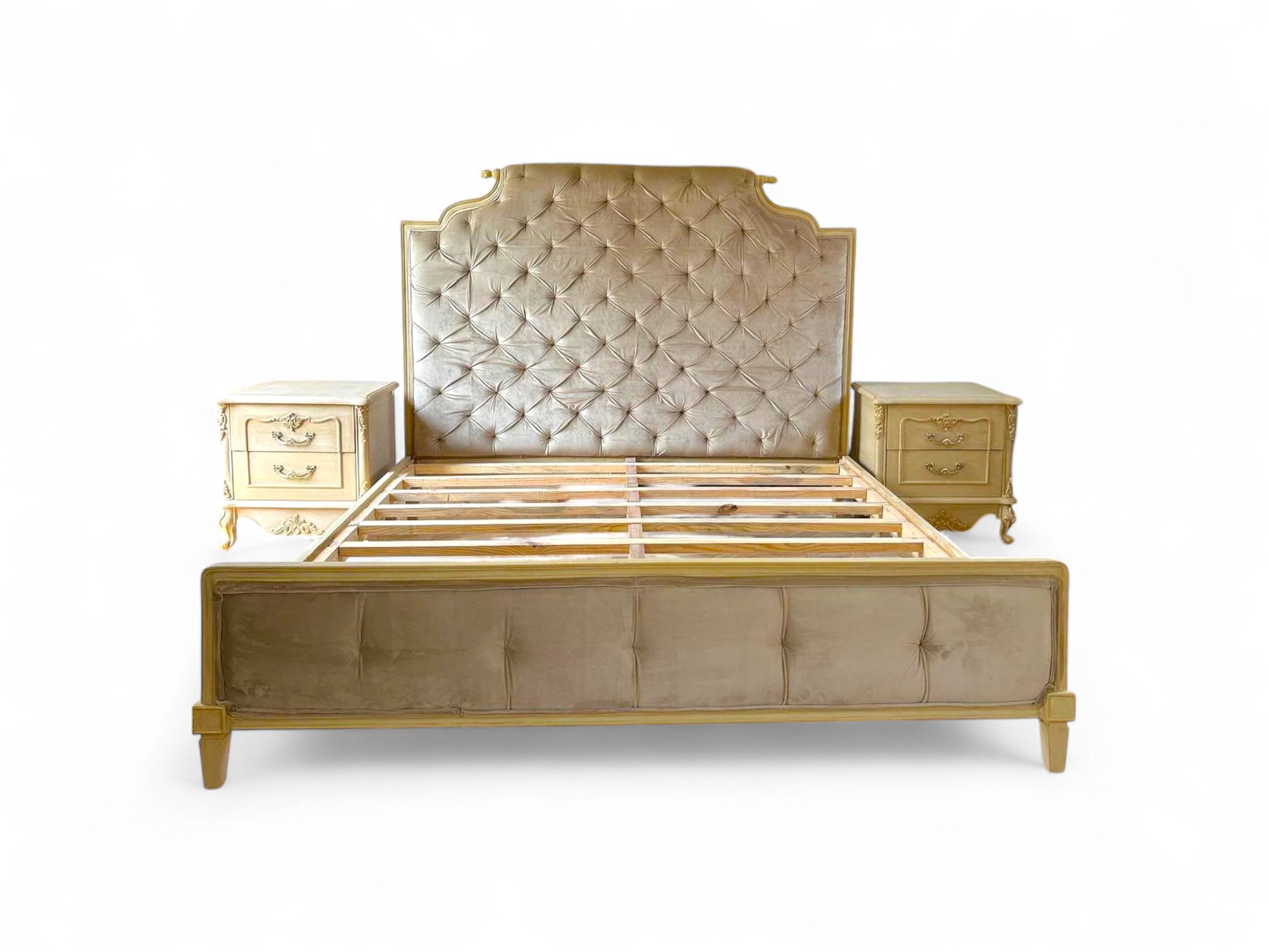 The Versailles Glow Bed captures the refined symmetry of neoclassical French design with a luxurious contemporary finish. Upholstered in a soft champagne velvet, the tall, sculpted headboard features deep button tufting that brings depth and richness to its silhouette. Framed in a subtly gilded structure with sleek lines and matching bedside tables, this bed adds poise and grandeur to any interior.