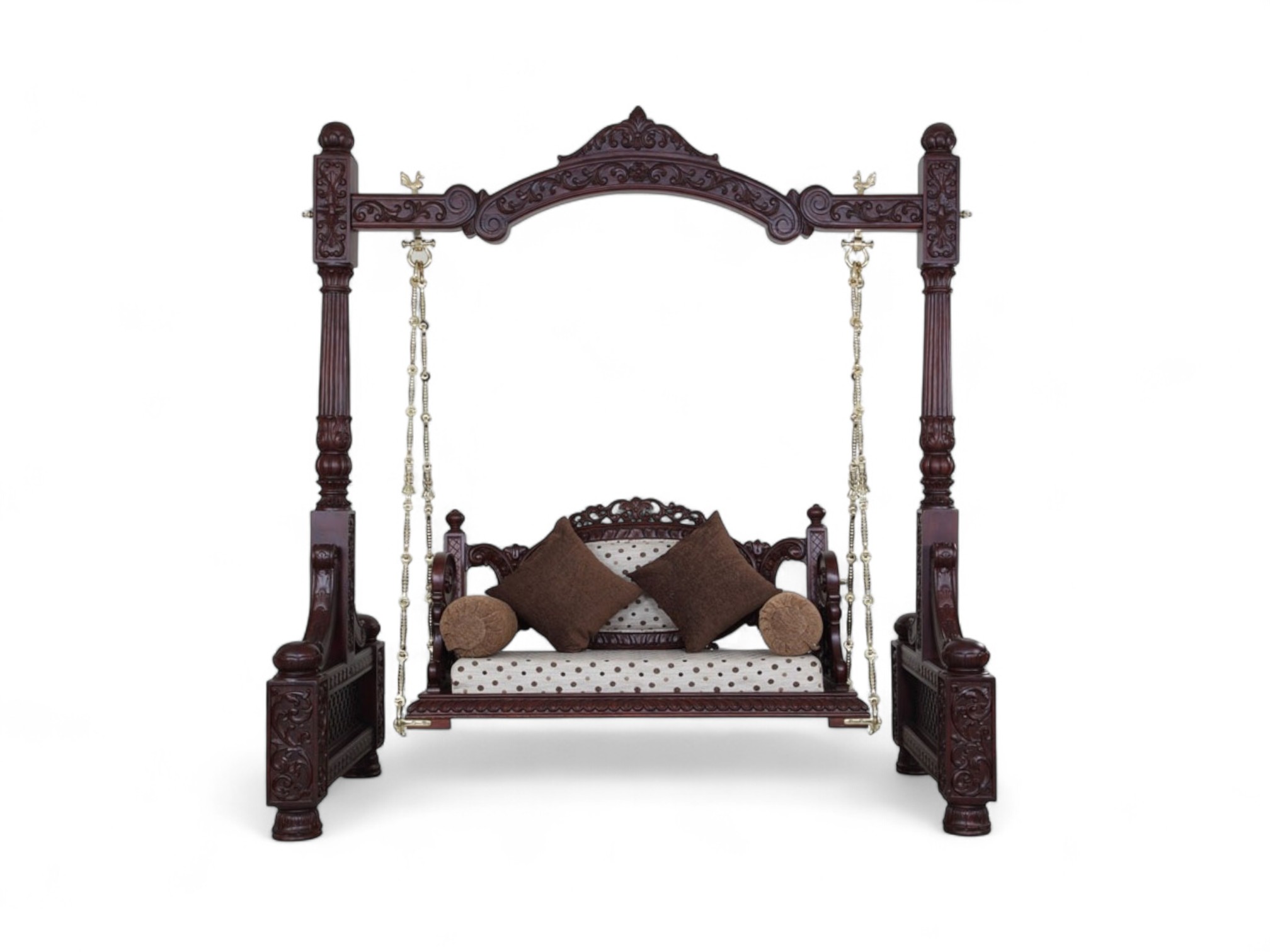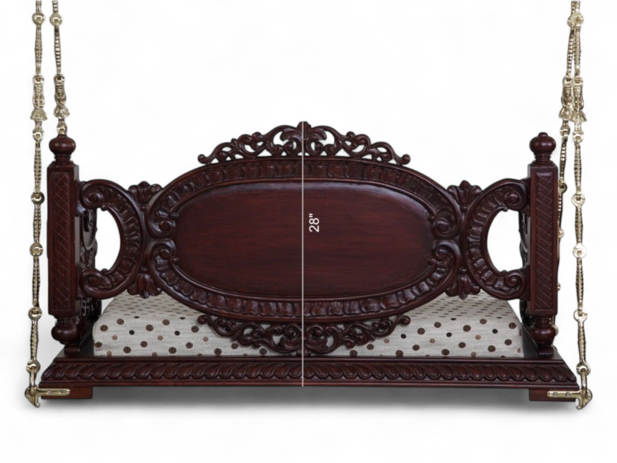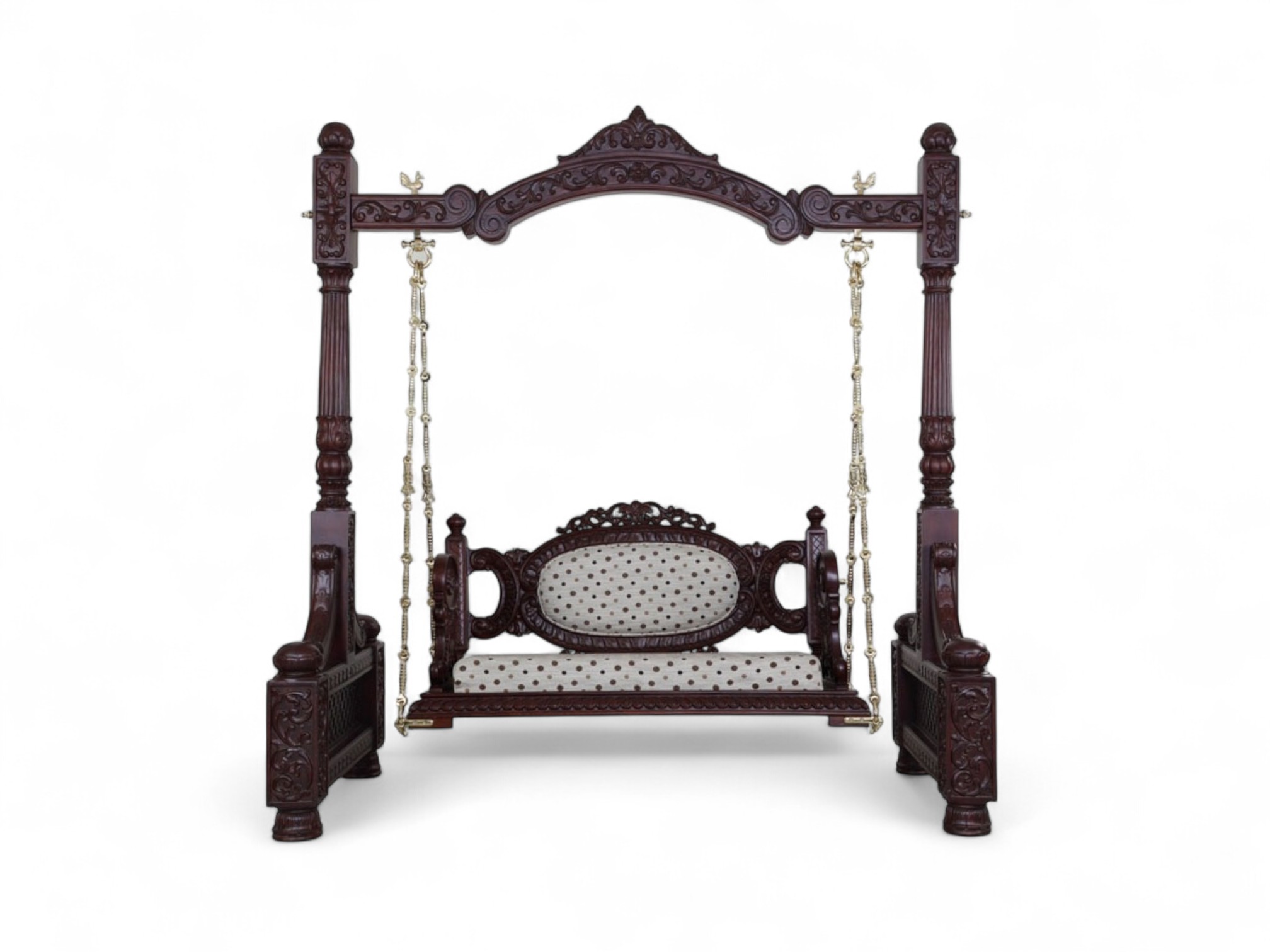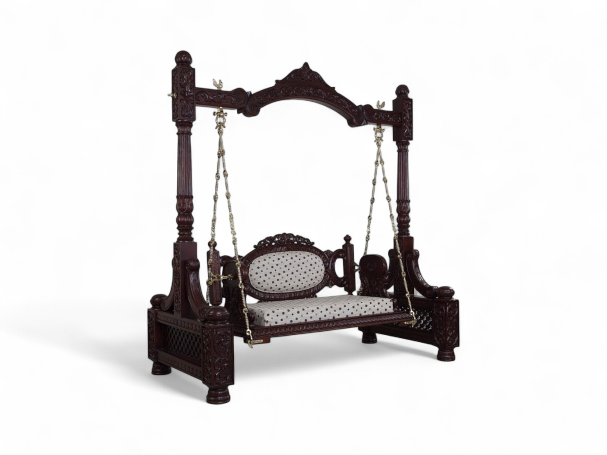 The Victorian Style Swing is a masterpiece of timeless elegance, blending intricate artistry with luxurious comfort. Handcrafted from premium solid wood, this swing features elaborate Victorian-inspired carvings across its frame and posts, reflecting classical European charm with an Indian touch. Suspended on strong brass chains, the swing offers both durability and grandeur, while the upholstered cushioned seat ensures refined comfort.