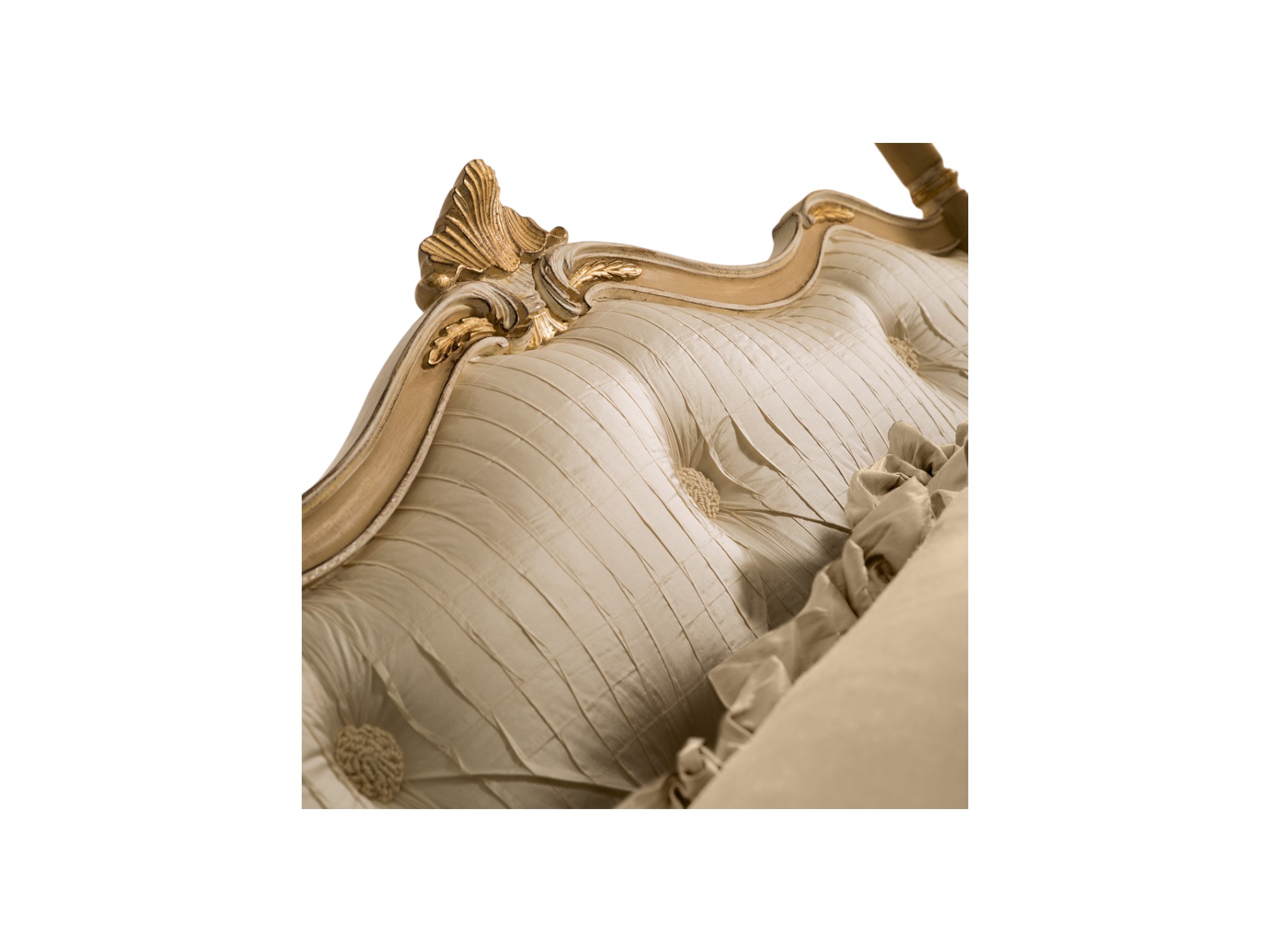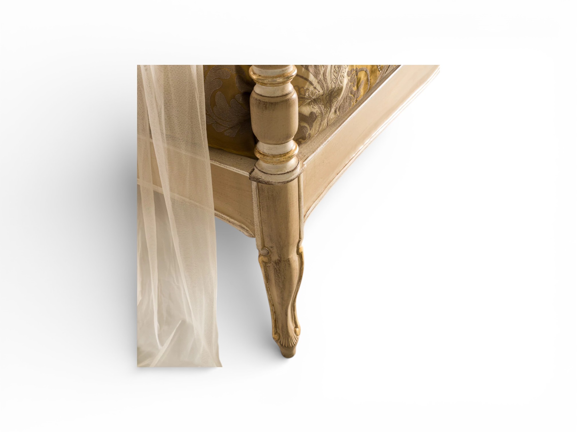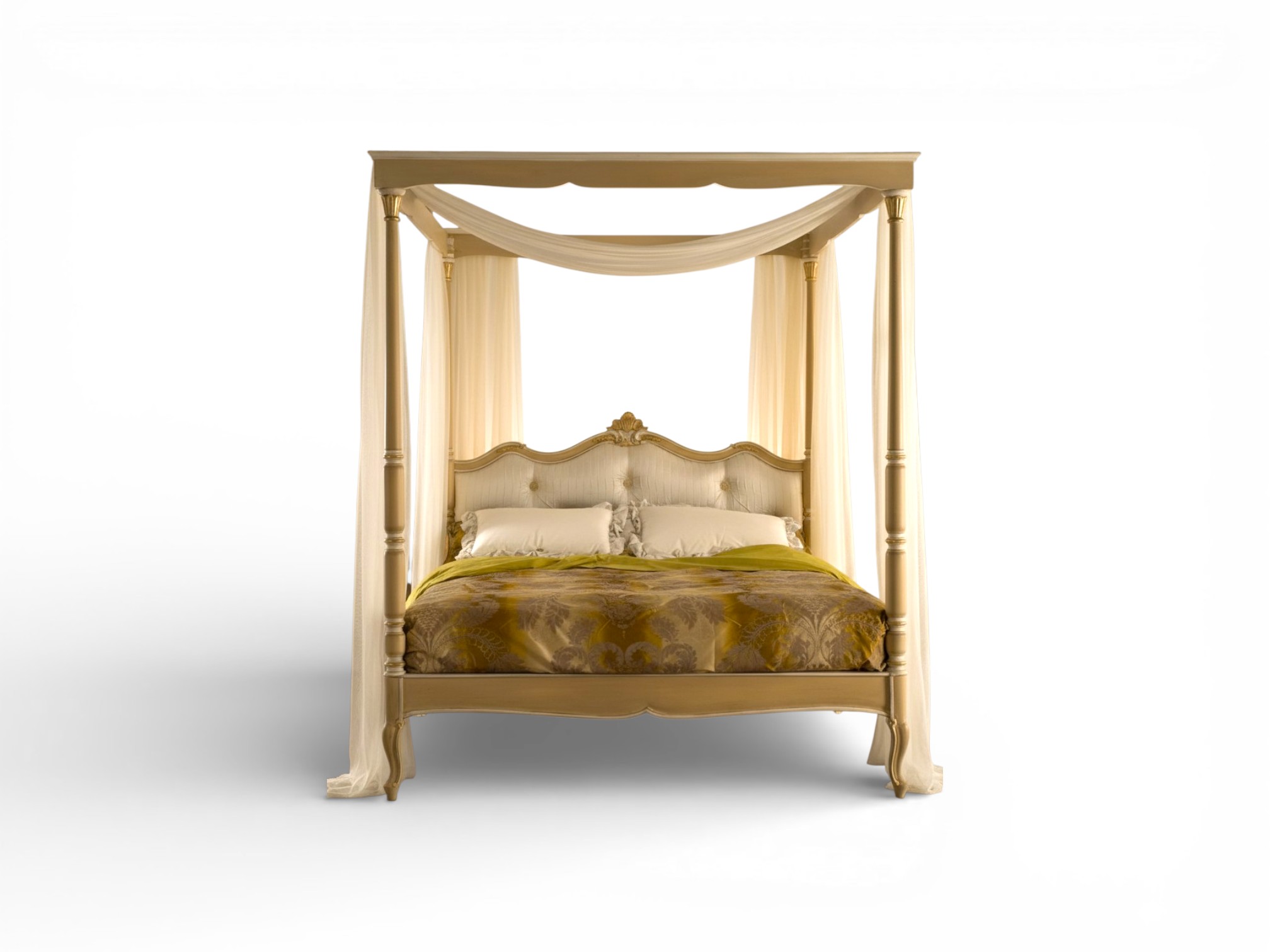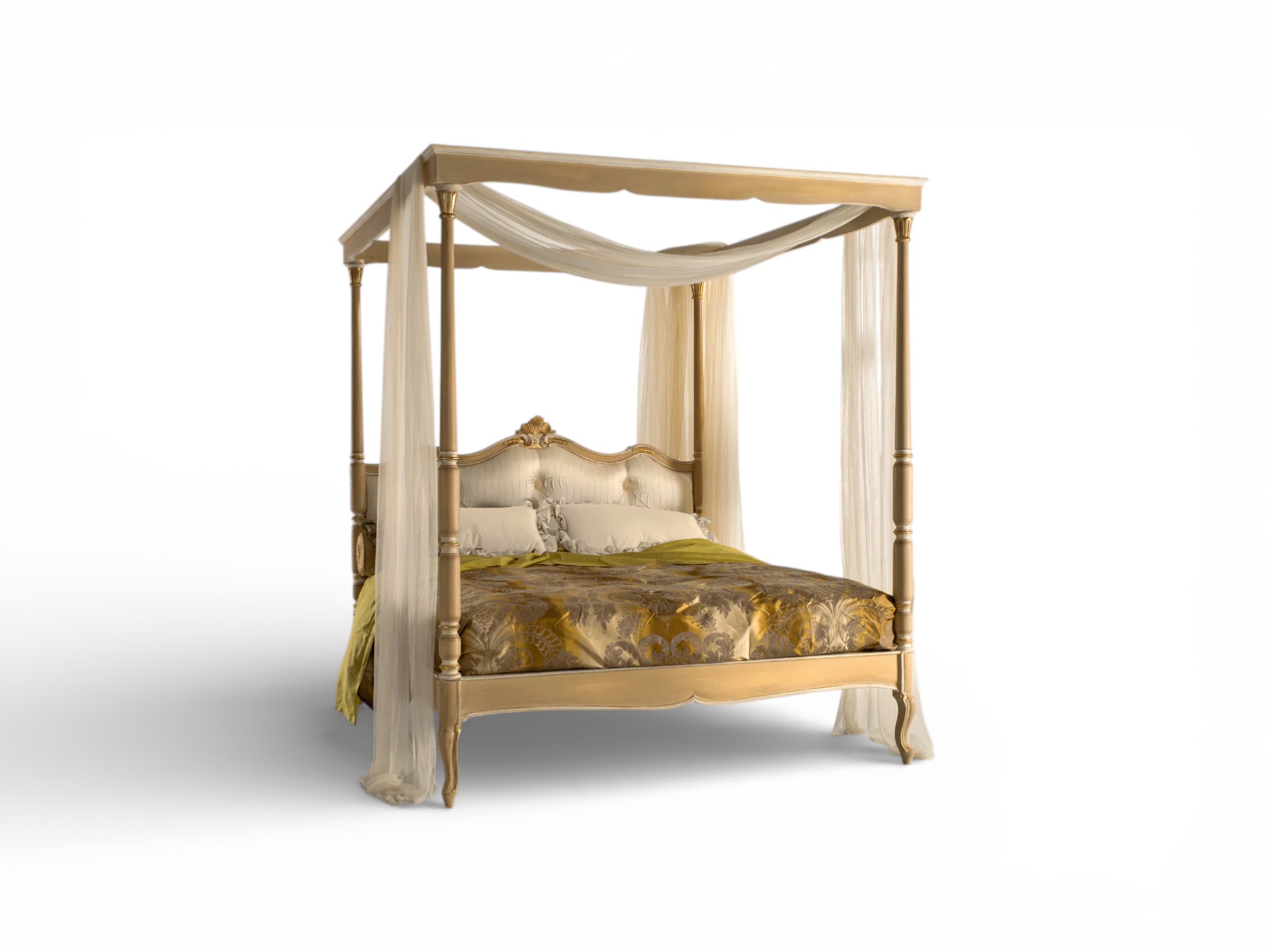 Expert craftsmen shape the solid hardwood frame with precision, ensuring both strength and graceful detailing along every contour. The elevated canopy structure frames the bed beautifully, whereas the flowing drapery adds softness and warmth. In addition, the carved accents and tailored upholstery enhance its refined character, therefore making it ideal for Italian-inspired villas, heritage residences, and luxury estates.