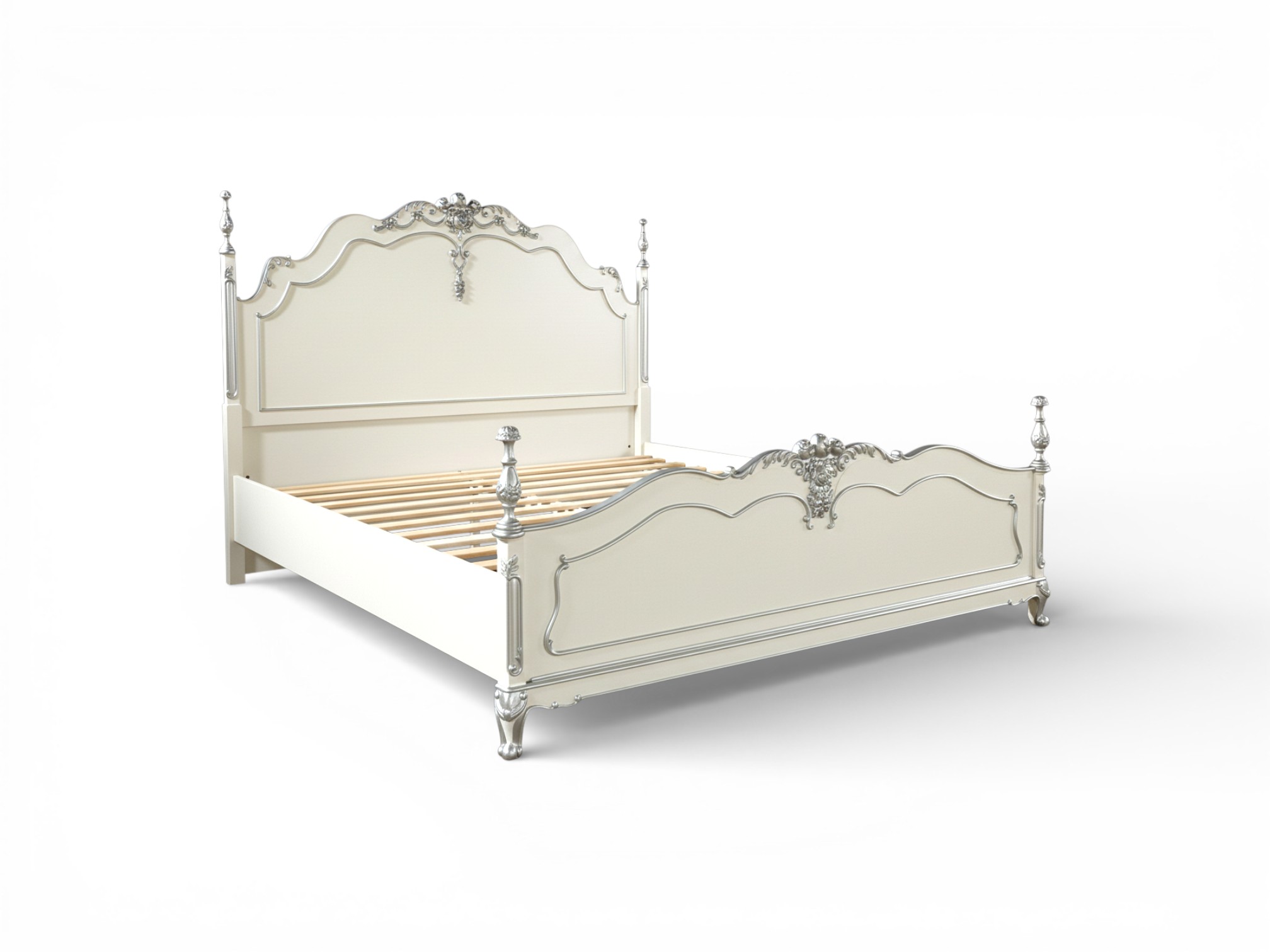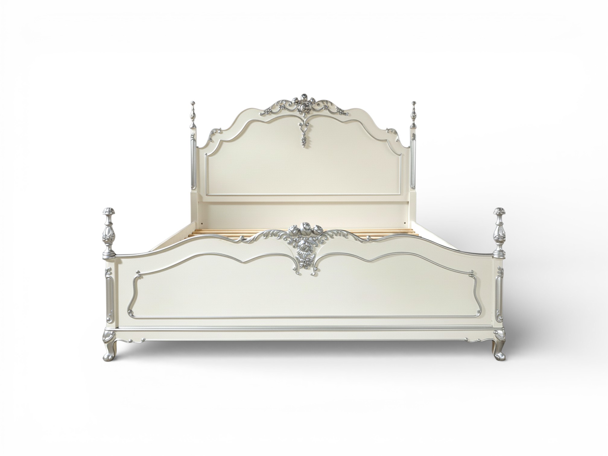 The Elegant Vintage French Bed exudes timeless charm and sophistication. Crafted with intricate detailing, this bed features graceful curves and ornate carvings, creating a statement piece for any bedroom. Its soft white finish adds a touch of lightness and elegance, while the delicate scrollwork along the headboard and footboard enhances its vintage appeal. This bed is perfect for creating a romantic, classic atmosphere, adding both style and comfort to your space.