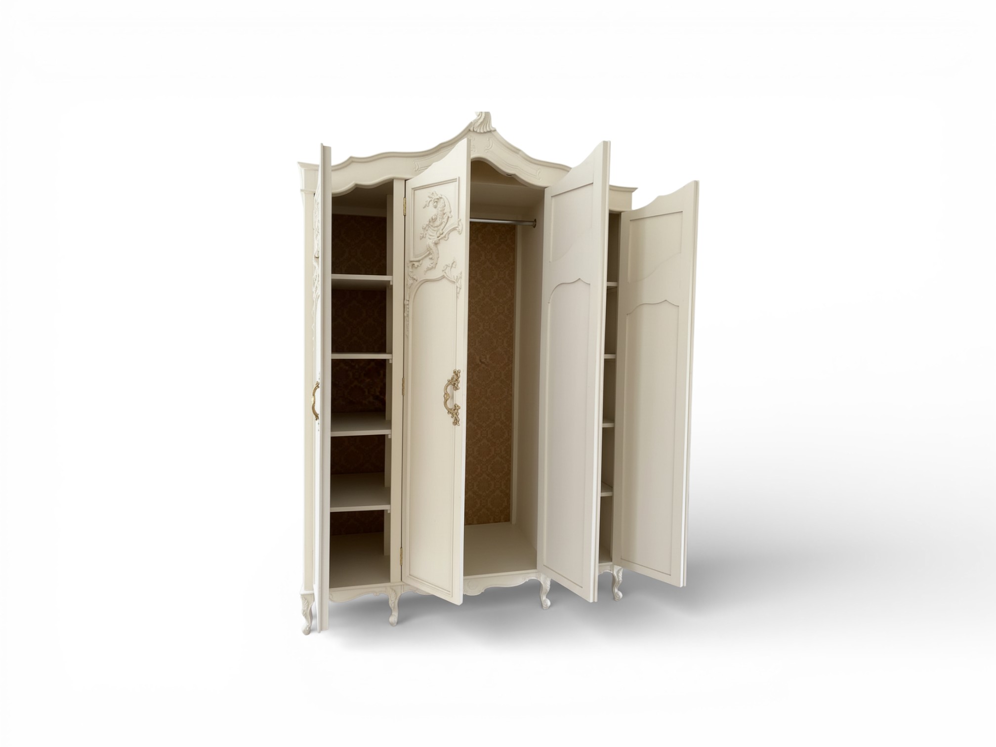 Crafted from solid wood, this piece combines ornamental craftsmanship with practical storage capacity. Moreover, the wide internal layout supports organised clothing storage, while refined hardware and a raised base add architectural presence. As a result, this wardrobe delivers enduring elegance, structural stability, and everyday usability in a timeless classic form.